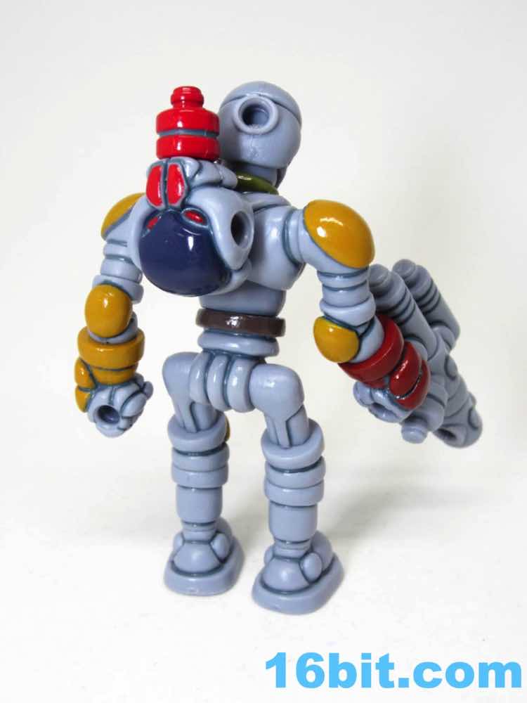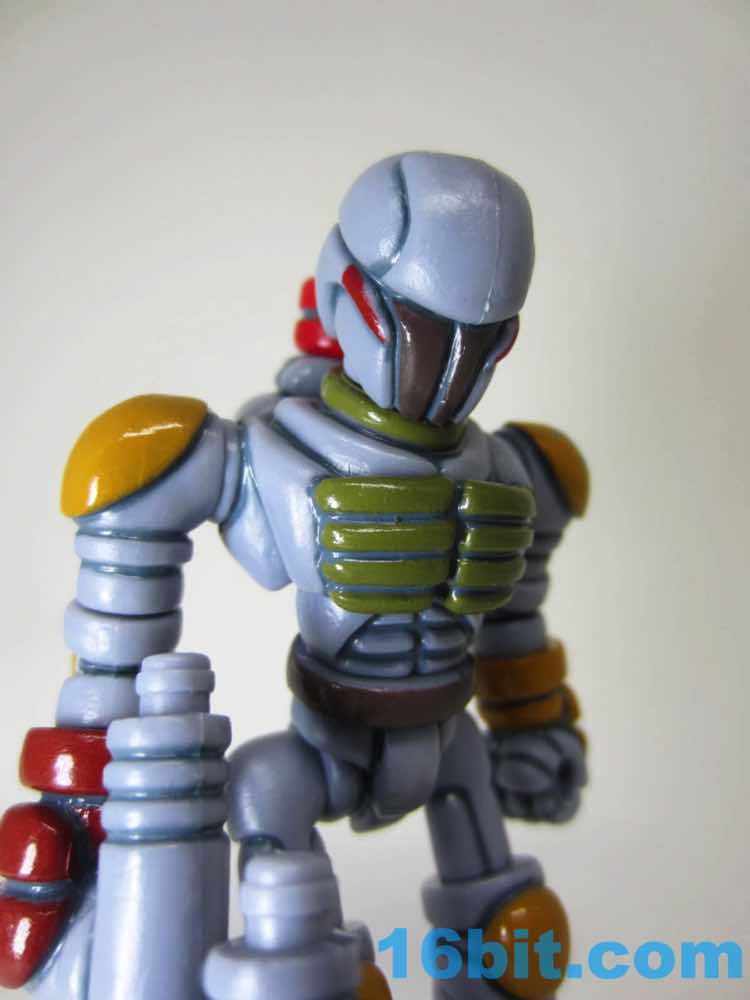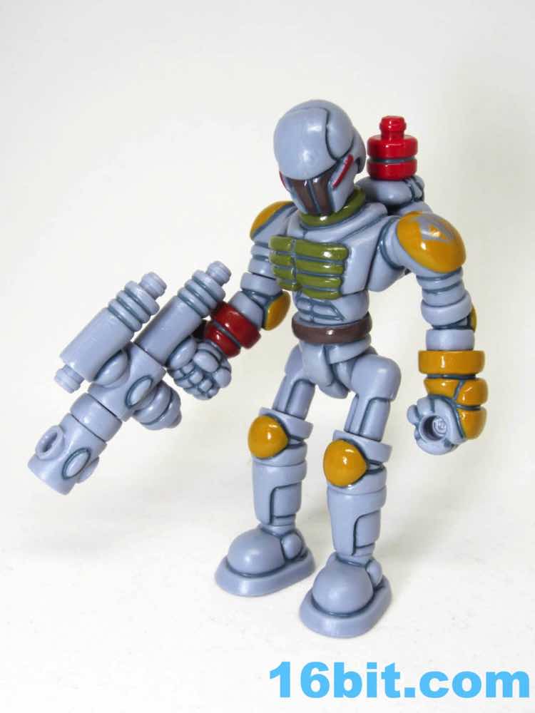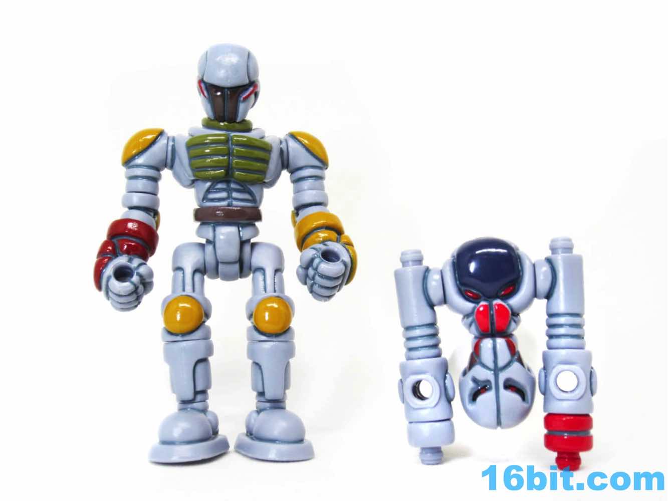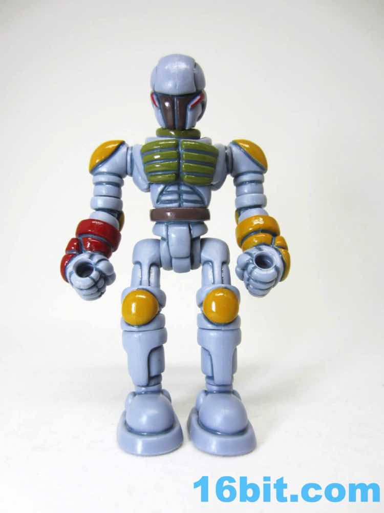 To get the figure in its proper "Boba Fett" mode, you'll need to do some reconfiguring out of its heat-sealed plastic baggie. The Warp Gear is made up of 2 alternate heads and gun parts. These - along with the entire figure - can be popped apart at each joint, as these use the ever-popular Glyos system which are compatible with nearly a dozen lines of indie toys now. Heck, maybe more. What matters is that Warp Gear can reconfigure into a blaster that looks like an idealized pipey version of the Bounty Hunter's weapon, complete with panel lines, while a pin and a head can become a makeshift rocket pack. Since Kenner Boba Fett has no cape, neither does The Order Bobaran. The head sculpt has been included with this figure in its many incarnations, and this is the first time a production toy has been given the Boba Fett deco. The visor area is the brown around the "T" of Boba's face, with red off to the sides. It gives the feeling of the character without any of the legally squeamish parts.