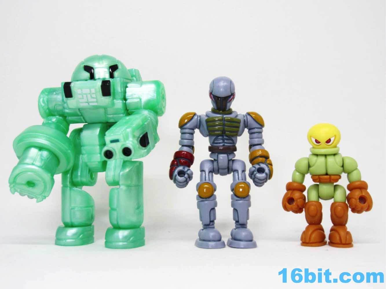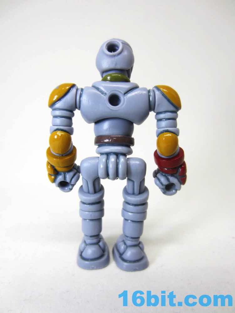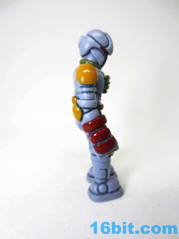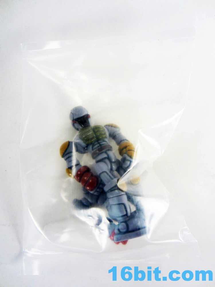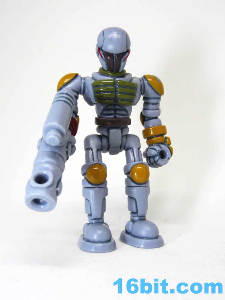 To get the figure in its proper "Boba Fett" mode, you'll need to do some reconfiguring out of its heat-sealed plastic baggie. The Warp Gear is made up of 2 alternate heads and gun parts. These - along with the entire figure - can be popped apart at each joint, as these use the ever-popular Glyos system which are compatible with nearly a dozen lines of indie toys now. Heck, maybe more. What matters is that Warp Gear can reconfigure into a blaster that looks like an idealized pipey version of the Bounty Hunter's weapon, complete with panel lines, while a pin and a head can become a makeshift rocket pack. Since Kenner Boba Fett has no cape, neither does The Order Bobaran. The head sculpt has been included with this figure in its many incarnations, and this is the first time a production toy has been given the Boba Fett deco. The visor area is the brown around the "T" of Boba's face, with red off to the sides. It gives the feeling of the character without any of the legally squeamish parts.