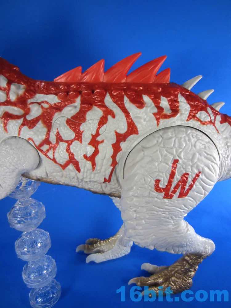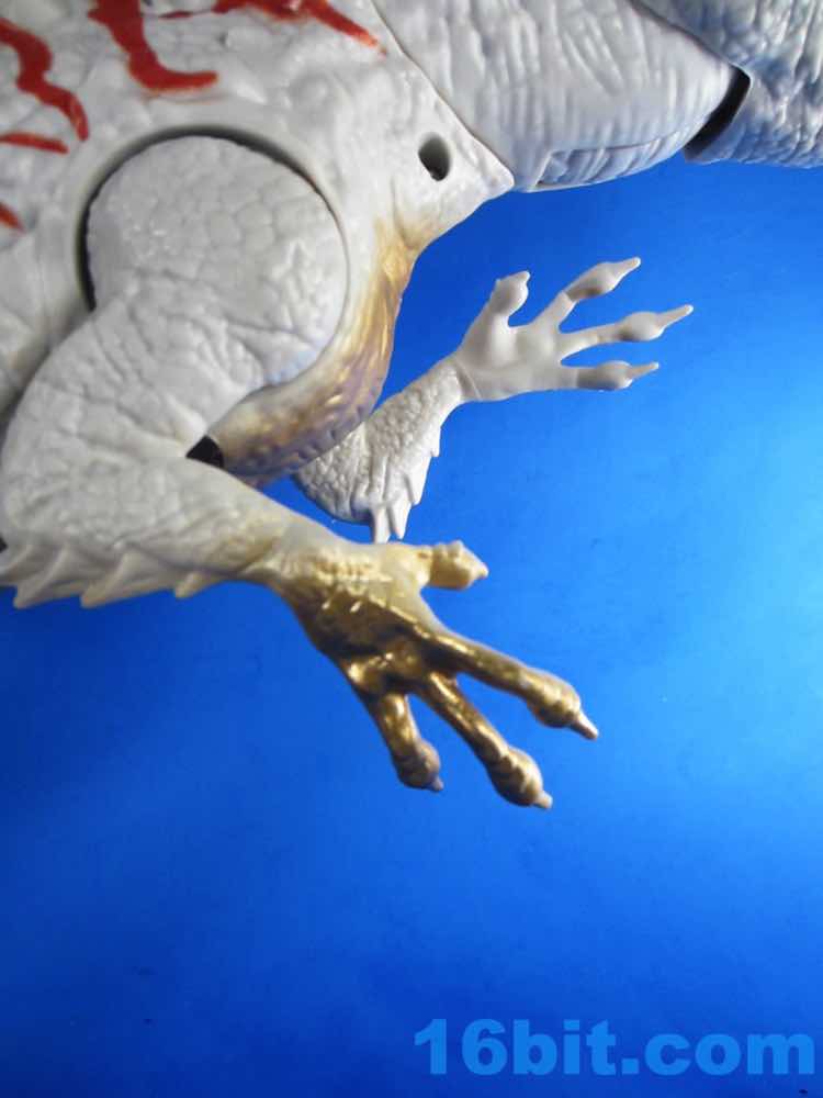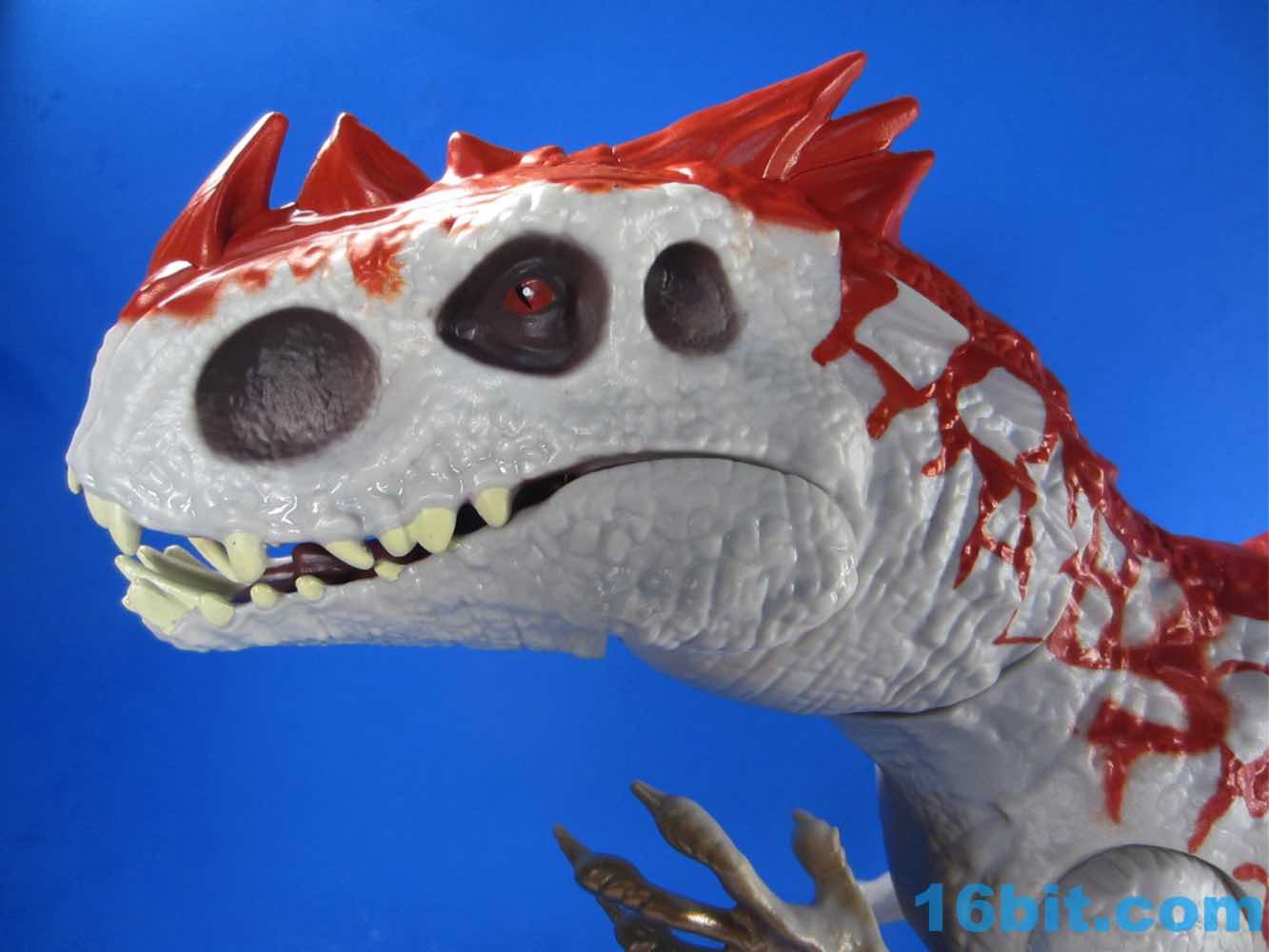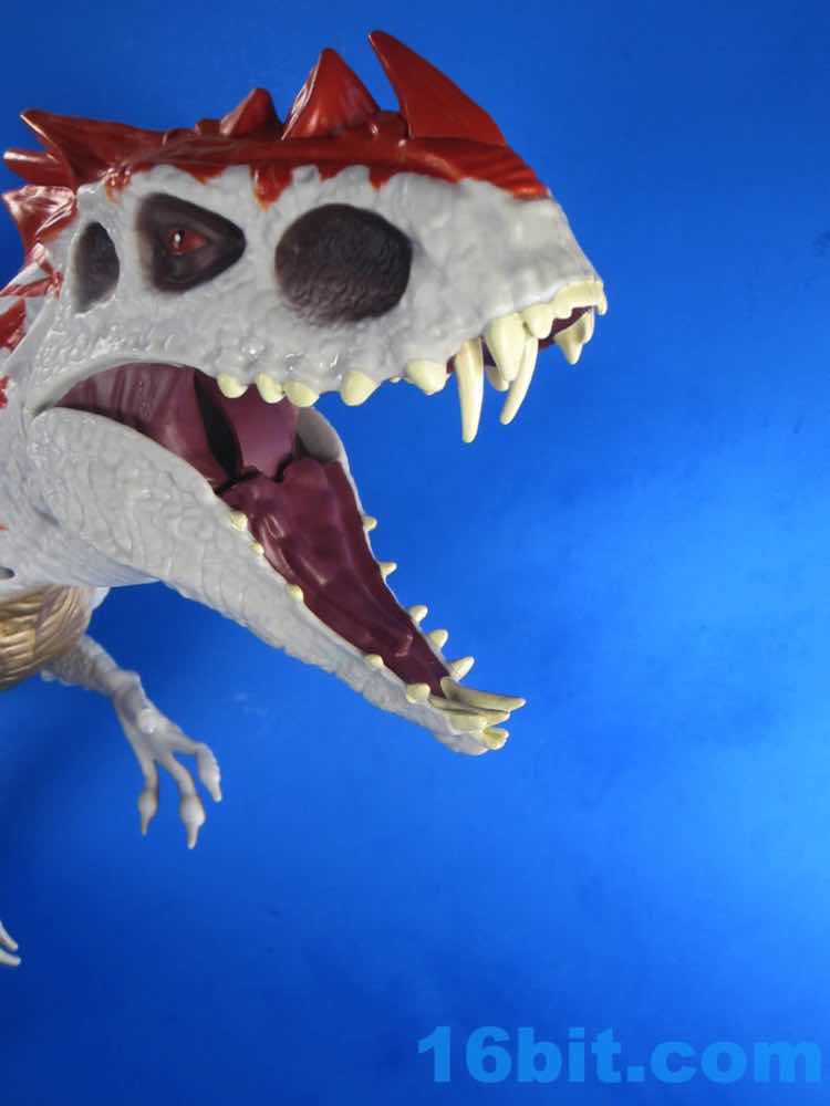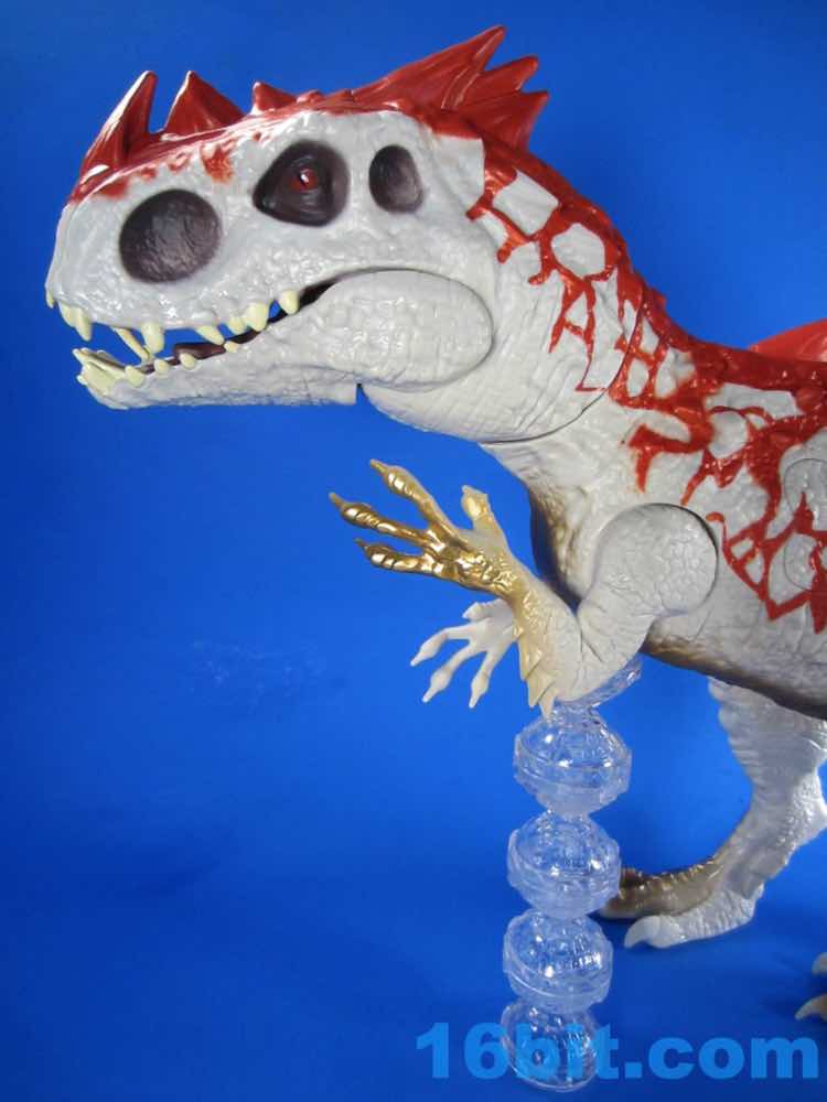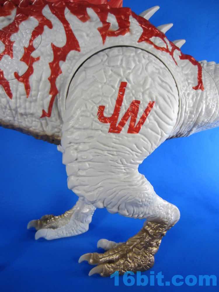 With her tail, this 22-inch long beast is one of the biggest in the range. It carries the bone-like look of the movie design with big dark cavities on her head with the ghostly pale skin, but what gets interesting is how she borrows from some modern toy trends. The "dino damage" flesh wound? Absent. Instead you get orange spikes and veiny designs cascading down the back, a tremendously bold "JW" cutie mark, and a wonderful paint job with bright red eyes and a nicely painted mouth and teeth. What's weird - and appropriately trendy - are splashes of gold on her hands and feet, not necessarily consistent with any claw patterns but more in line to how a lot of Japanese vinyl figures are painted. You've probably seen something like this on Godzilla figures or Hikari vinyl, it's not remotely realistic and I assume is a fashion statement we'll see a little more of out of Hasbro and Mattel before it finally goes away, never to be spoken of again. See also: colo choices of the early 1990s. (See also: Hybrid Armor Ankylosaurus [FOTD #1,528]. Look at those spines!)