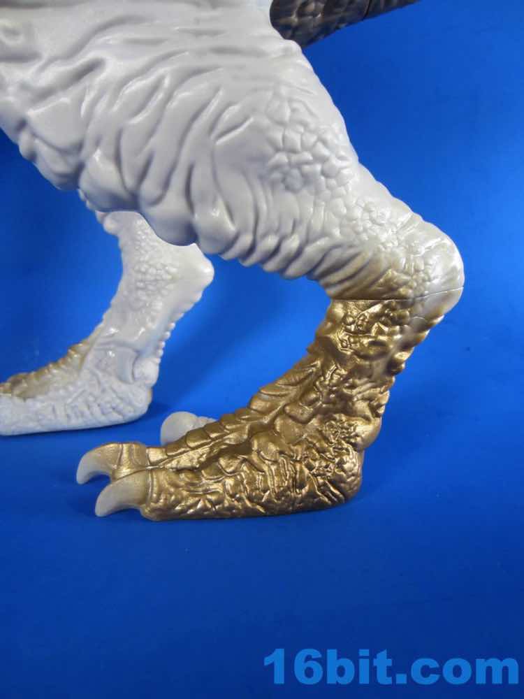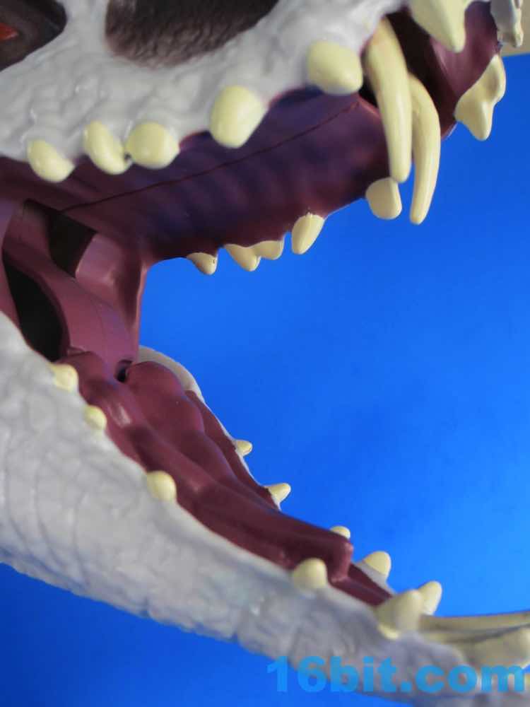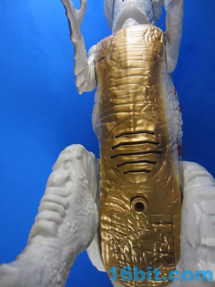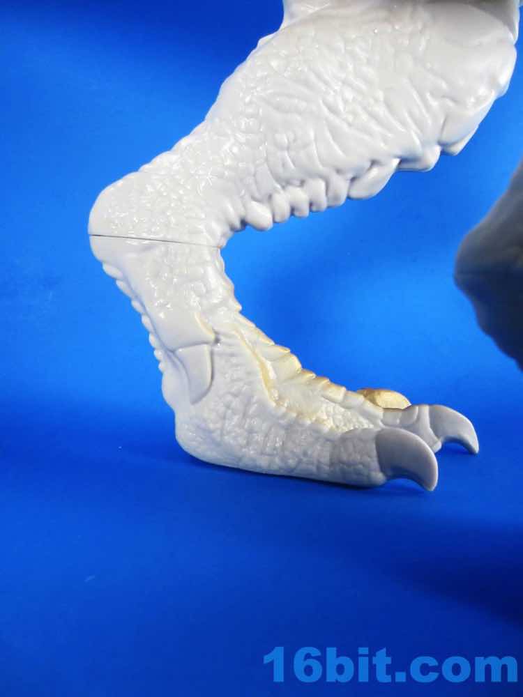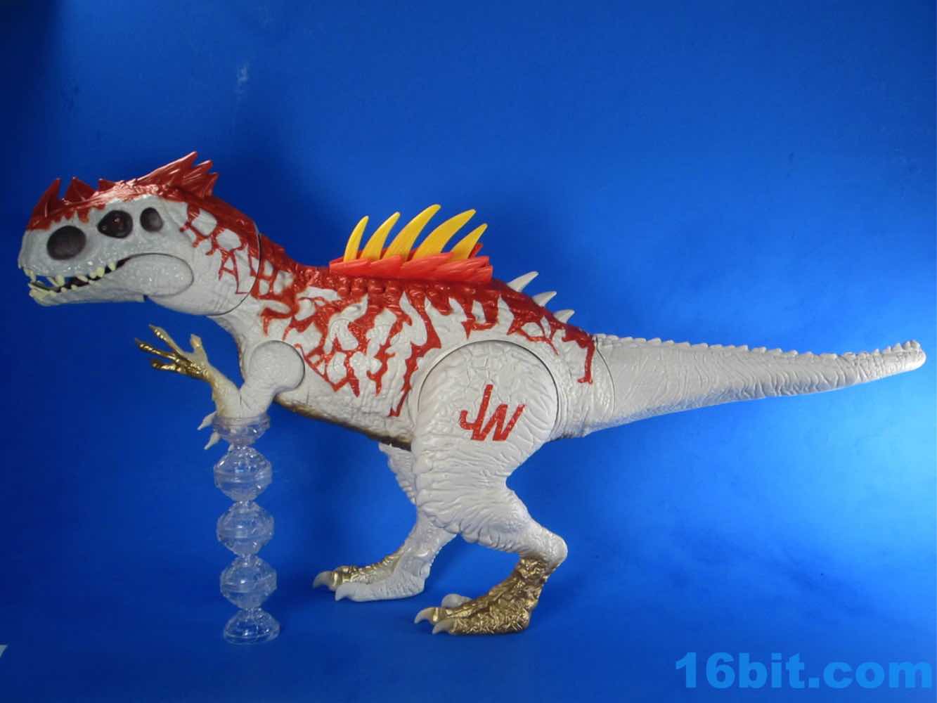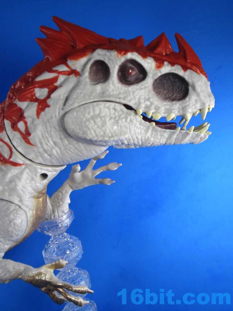 With her tail, this 22-inch long beast is one of the biggest in the range. It carries the bone-like look of the movie design with big dark cavities on her head with the ghostly pale skin, but what gets interesting is how she borrows from some modern toy trends. The "dino damage" flesh wound? Absent. Instead you get orange spikes and veiny designs cascading down the back, a tremendously bold "JW" cutie mark, and a wonderful paint job with bright red eyes and a nicely painted mouth and teeth. What's weird - and appropriately trendy - are splashes of gold on her hands and feet, not necessarily consistent with any claw patterns but more in line to how a lot of Japanese vinyl figures are painted. You've probably seen something like this on Godzilla figures or Hikari vinyl, it's not remotely realistic and I assume is a fashion statement we'll see a little more of out of Hasbro and Mattel before it finally goes away, never to be spoken of again. See also: colo choices of the early 1990s. (See also: Hybrid Armor Ankylosaurus [FOTD #1,528]. Look at those spines!)