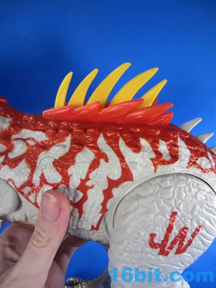 Having said that, the sculpt is great and the mechanisms do work as expected. If you push the switch in her belly, the orange spikes on her back split open to reveal another row of spikes! Silly, sure, but it's fun and I bet kids might enjoy it if they aren't hung up on realism in their fake dinosaur toys. Press it in again, and they retract. It's simple, functional, and wonderfully fun.