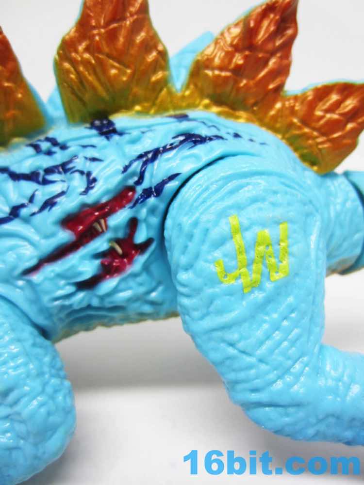 As with the previous release, what you're getting is a Stegosaurus with a Triceratops head. The tail is mostly undecorated, which is a shame as the thagomizer could use some color. The plates, horns, and spikes are all a gold/orange color, and this accent was also added to the creature's belly. What's more, the face and feet - even the soles of the feet - are coated in a thick metallic blue pigment. Another shade of blue was used to accent the sides of the beast, along with fairly tame off-white toes on his feet. Metallic orange eyes peer out from under elongated horns, giving the creature the illusion of great size despite being just a few inches long.
