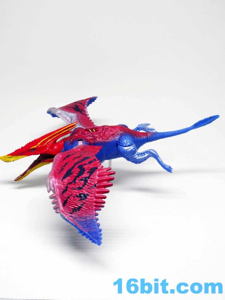 The fuzzy flyer seems to be a mix of a Pteranodon and I assume a Struthiomimus or Gallimimus, but the on-package bio of "Hybrid dinos battle for survival!" in four languages offers no help to anybody. Just tell me what DNA went into the vats! The retooled Dimorphodon toy enjoys a new head with nifty bite action, activated by squeezing its legs together. The 12-inch wingspan flaps at the same time, making a noise that could easily be wind in wings or a chomping jaw. I guess your imagination can decide. The wound on the creature's back lights up when you press it, playing the same noise as the Dimorphodon.