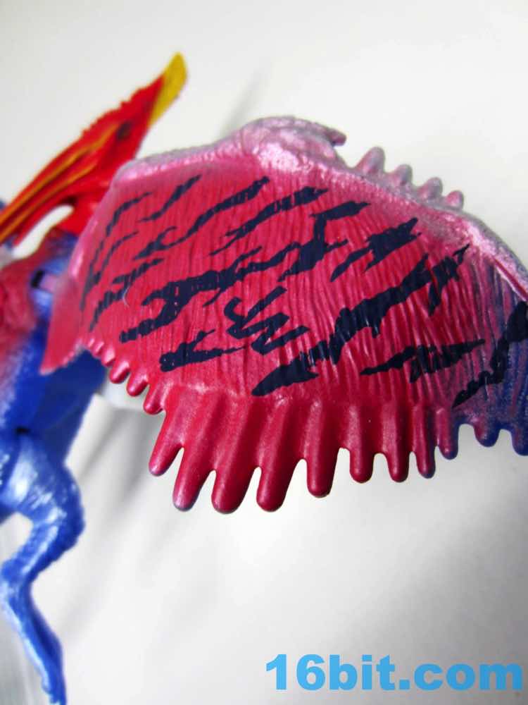 Feathery features on the wings look vaguely like spikes or hair, with the rest of the figure having somewhat leathery skin. It looks good - I love the yellow "beak" with the teeth and meaty mouth. The yellow double-stripe in its crest looks great, and the pattern on the wings looks good too. Keeping in line with other Dino Hybrid toys, there's a lot of metallic and pearly paint mixed in with shiny "hands" and legs, giving it a little more "oomph" than some other toys. The black camo on the wings is a nice - if somewhat silly - touch, and some purple on the belly is completely unnecessary. But it's appreciated! Hasbro really went to the mat to put extra money on the paint here.