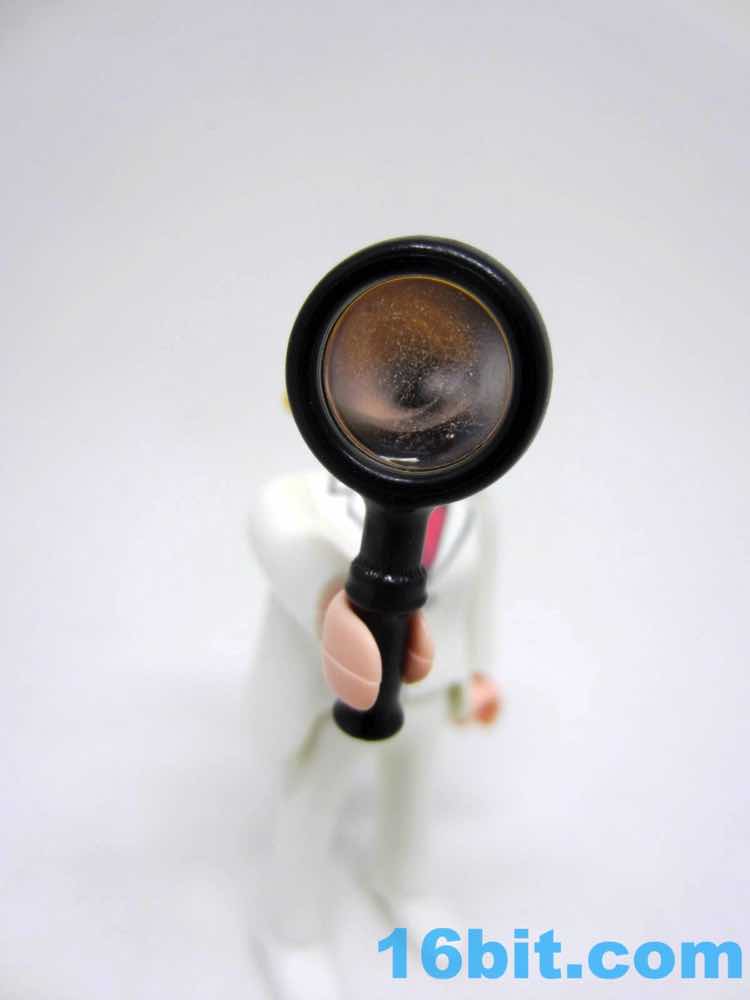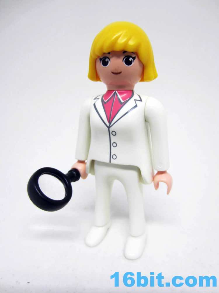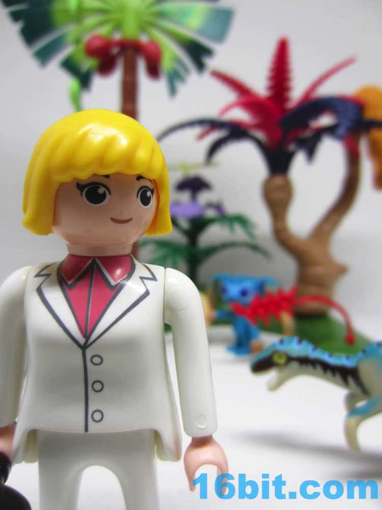 The 3-inch tall explorer is in a white pantsuit with a short blonde plastic wig and big, expressive eyes. Normally Playmobil toys have thoughtful brown blobs. The printing on my sample is crisp and clean, making the most out of the white plastic with tiny outlines showing where the suit is on an otherwise plain figure. Playmobil and LEGO and countless brick figure makers have done wonders using a single buck, and Playmobil impresses here with someone who looks a little like a famous face in the world of politics. She can stand and sit, but I'm left wondering why you'd wear a nice white suit on an island with killer dinosaurs and an alien. Maybe it makes sense in the context of the TV show, but I am old and cranky and do not watch this one. It's a good figure but I wish they stuck with the classic eyes.
