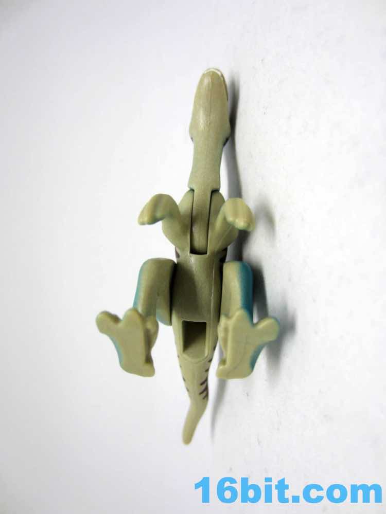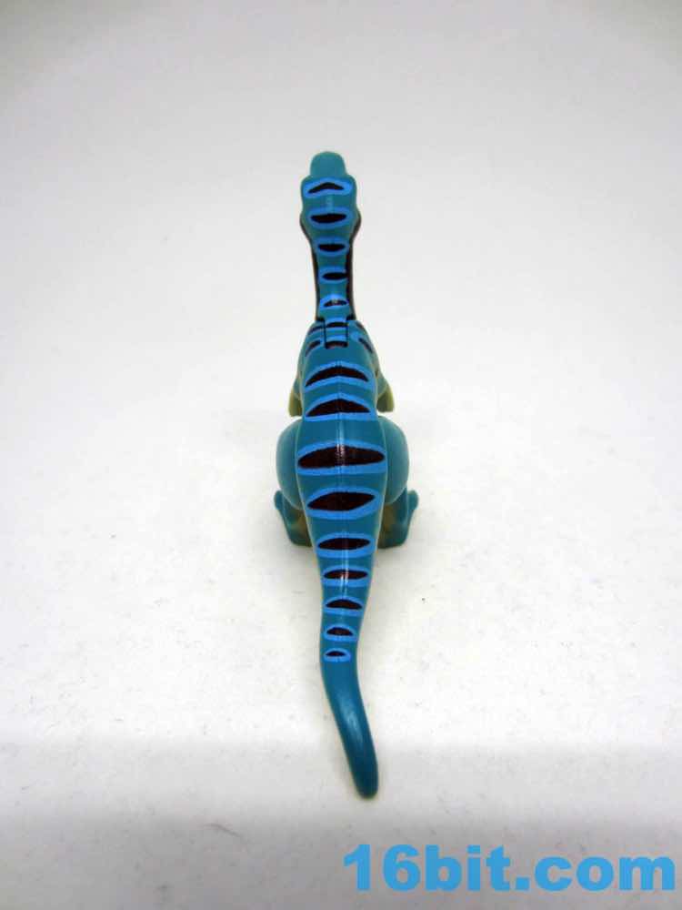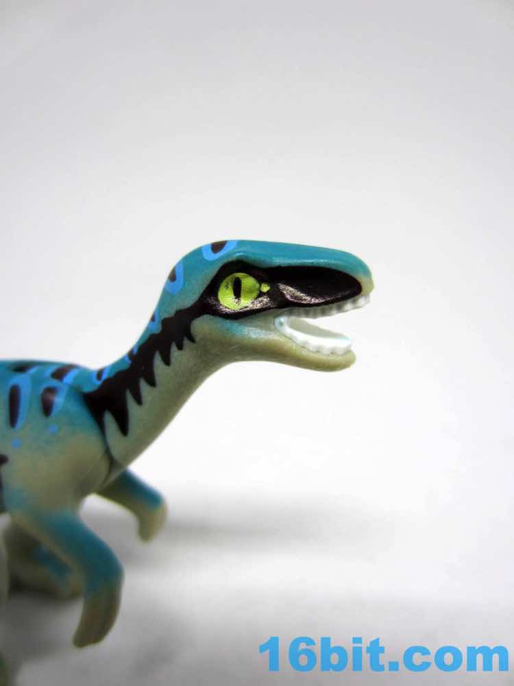 The Velocirpator is back after a few previous releases in orange - it now has much bigger eyes, an amazing skin paint job, and somewhat wonky eyes. Its skin goes from bklue to grey, with beautiful stripes on the back offset with light blue outlines. The white teeth pop nicely, and the black stripes remind me a lot of Kenner's Chaos Effect Alpha Velociraptor from the 1990s. It appears the eyes weren't painted exactly on the sculpted markings, but they're bigger and more expressive than the dots on the previous versions.