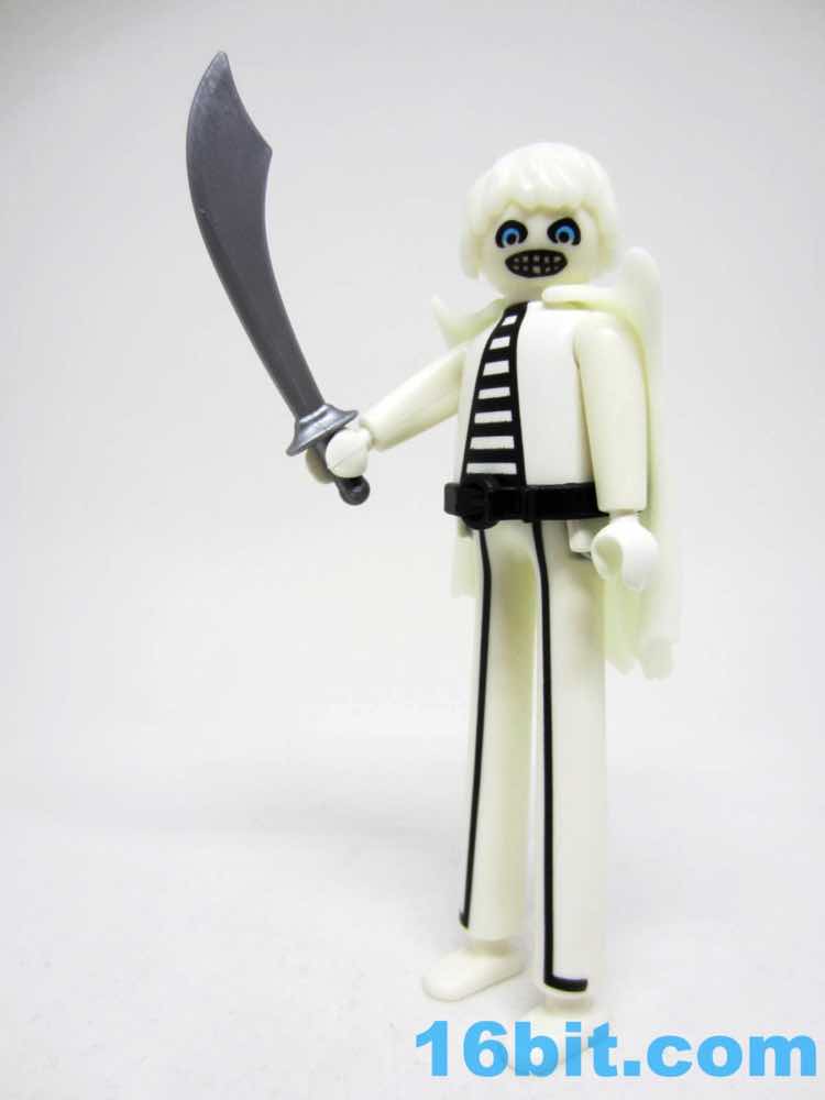 I can only assume the title character from Beetlejuice was the inspiration with his rubbery, shape-changing ghost abilities and white suit with black stripes. The coloring is a little off but the spirit is there - pardon the pun. He recycles stilt clown legs, and sports a swell belt to hold his sword. Why does he have a sword? I have no idea.