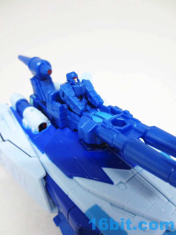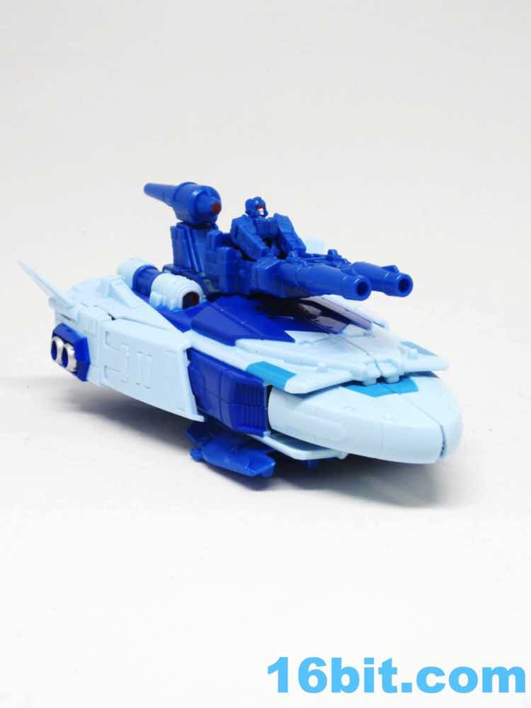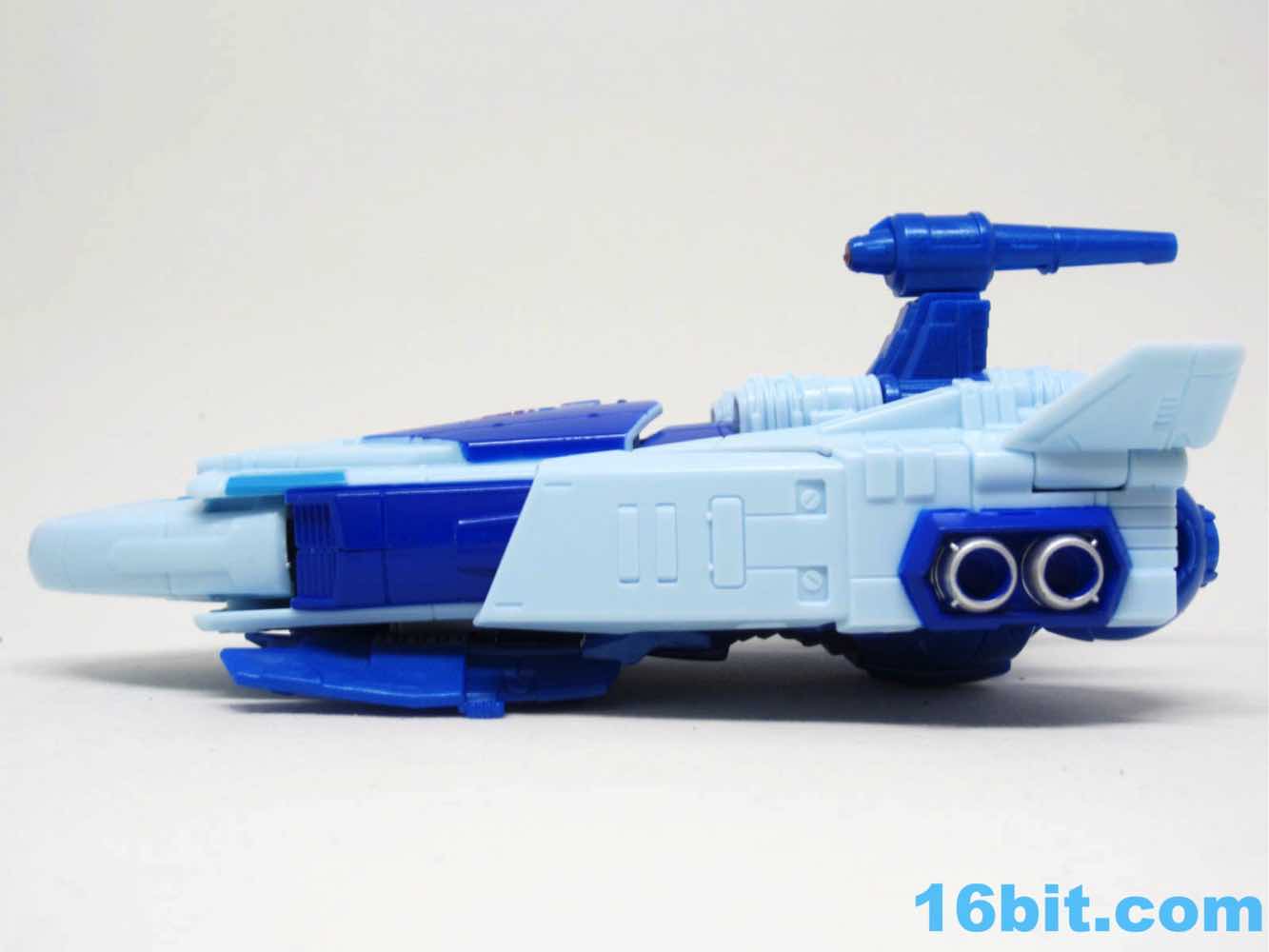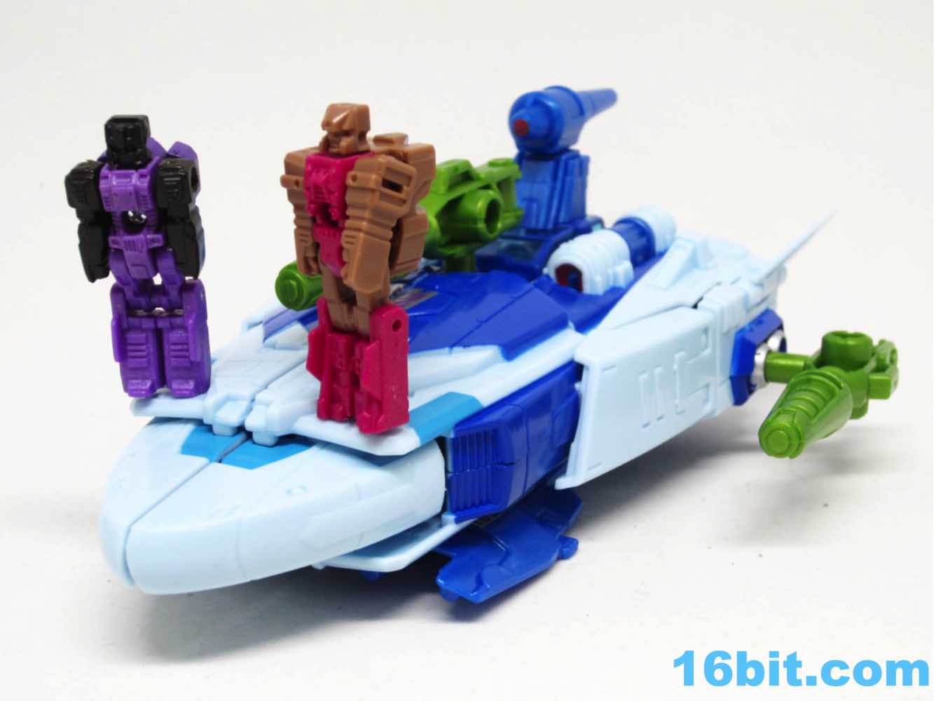 His vehicle is good - getting the front halves together is a trial and it may not be a perfect fit. I'm not getting it together perfectly all the time, but the overall vehicle gives you that space boat look you're after. You can plug the pistol in the boat as a sort of antenna or ornament, and the bigger gun can attach to the top. The colors are pretty good and it's a decent reimagining of the 1980s toy - with a pilot.