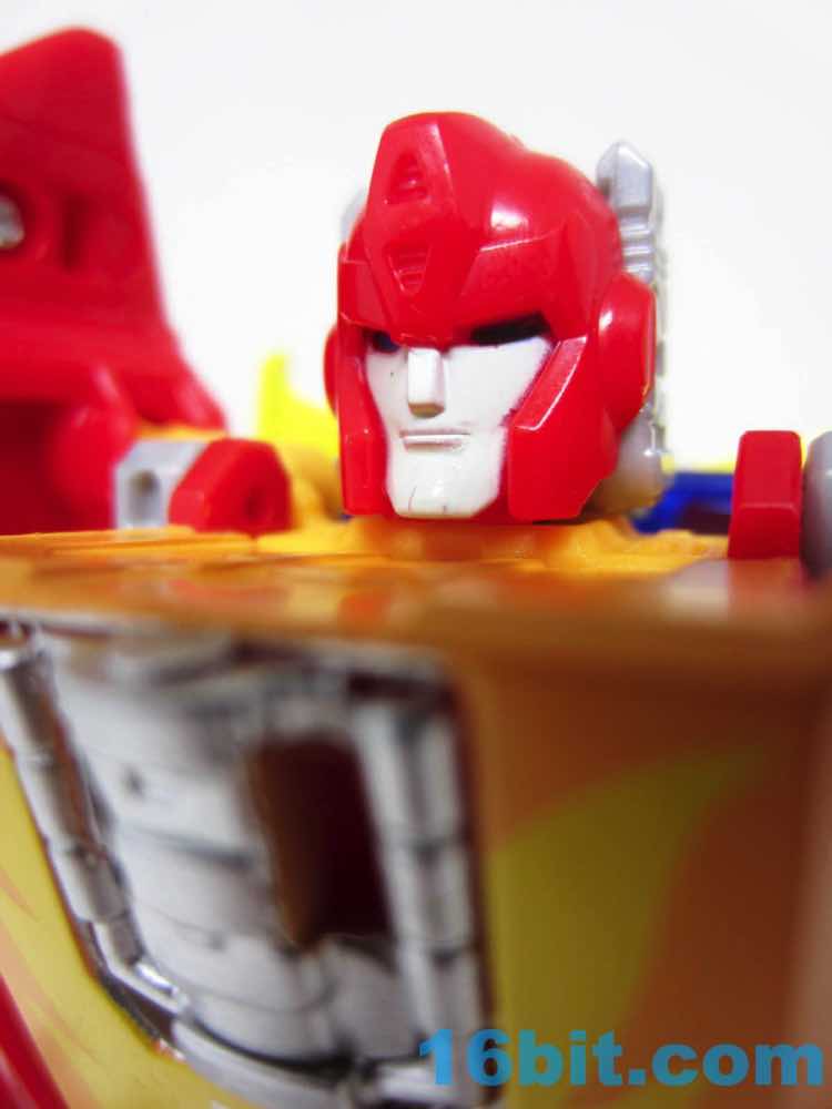 The head mode is as good as one can hope - the face plate sits in front of a grey robot doubled over on itself, and the color choice helps give the illusion that Hot Rod has a head and not a robot with a head backpack. Molded in red, the faceplate looks great with a grey face and blue eyes. It's a little rounder than my imagination thinks it should be, but it looks sharp.