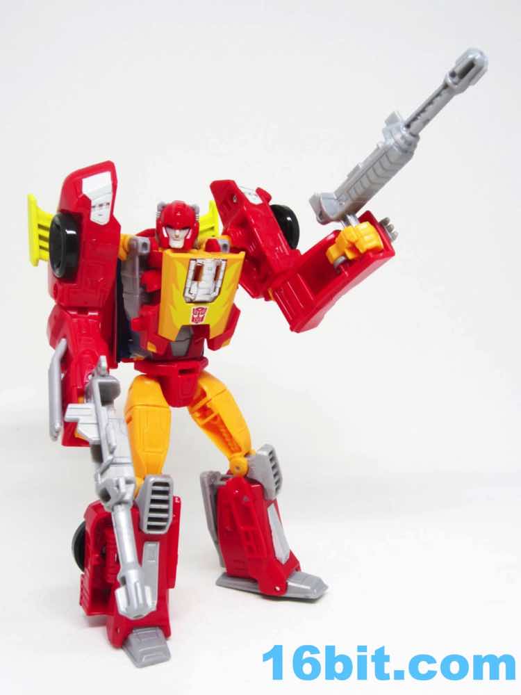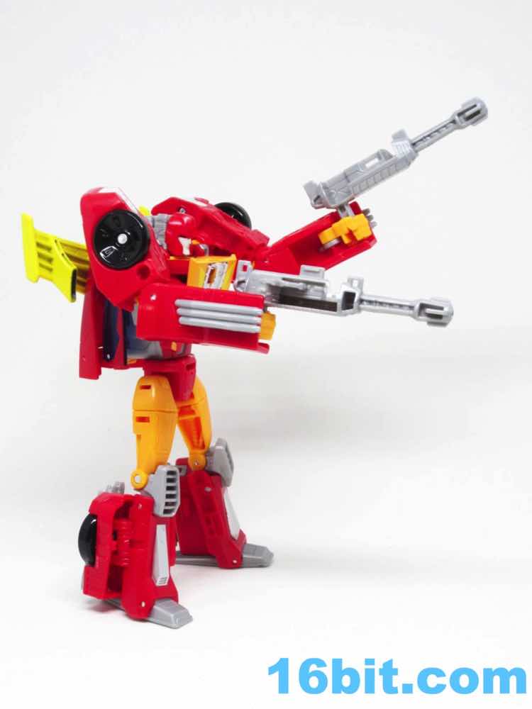 His joints are nice and tight, with the kind of movement you've come to anticipate. You've got swivel thighs, limited ankle articulation, some wrist movement courtesy of how he transforms, and pretty much just enough to make you glad you got it and probably dubious about having bought Masterpiece Hot Rod a few months ago. (I did, I like this better.) The guns fit in his fists nicely, and are a great redesign of his original twin blasters.
