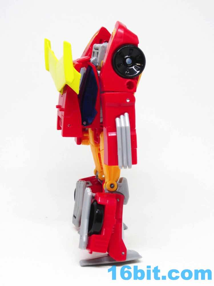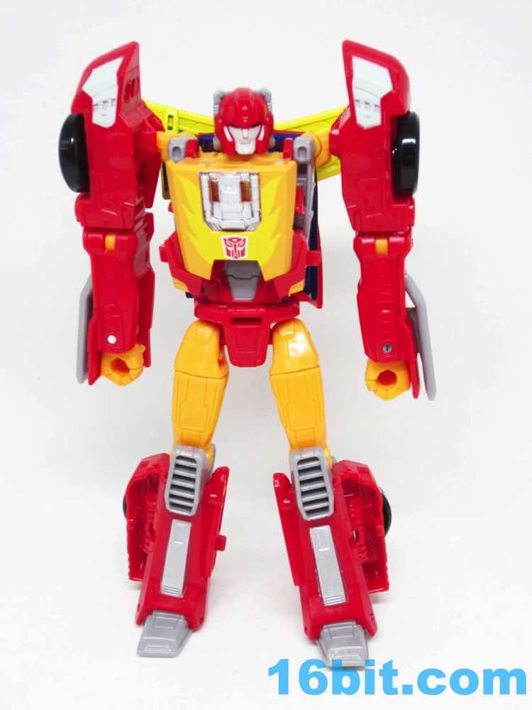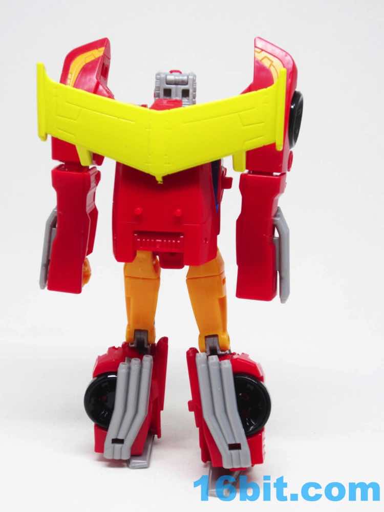 The robot mode is a bit taller and more articulated than I expected, with double knees and the oh so lovely swivel biceps that are almost hidden courtesy of his design. In many respects the toy adheres to the Classics Rodimus toy's design, only larger and with different features. And legs. OK, so it's different - the communicator/saw is gone too. It's still quite nice, as it's bright and colorful with thicker, seemingly less fragile joints than his predecessor. The guns fit nicely in his fists and while there are no rocket launchers or gun buddies, it's still a big, fun toy compared to his peers. The spoiler is a little hard to see in the photos, but trust me, it's there behind his shoulders. It's mistransformed in pack, so you'll need to fiddle with the backpack to make it right once you de-card him.