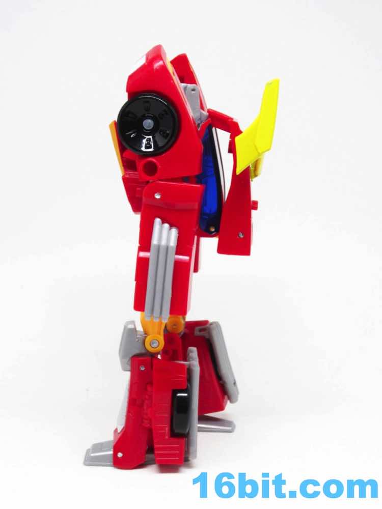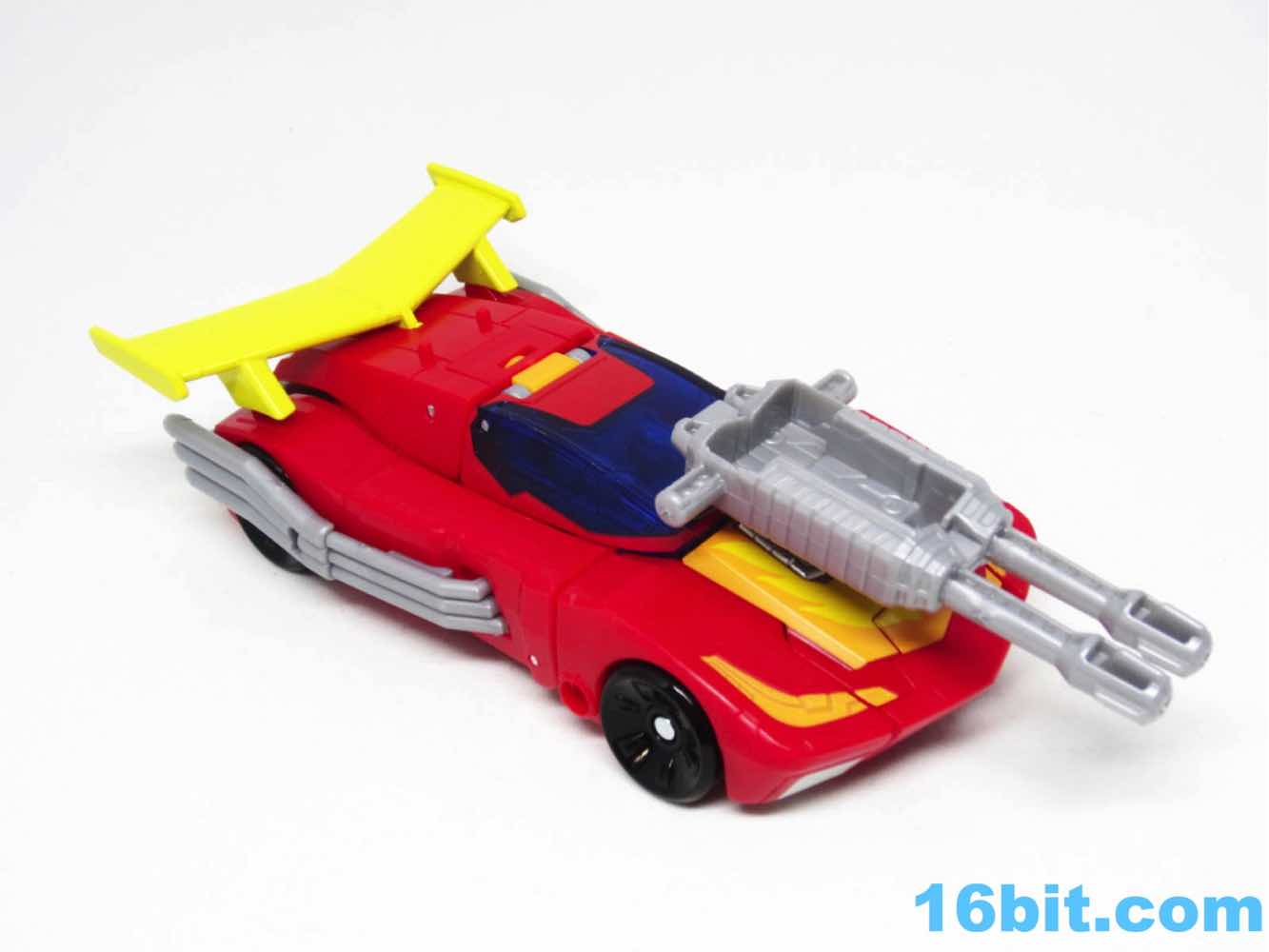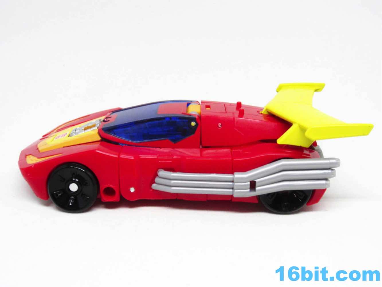 As a kid, I went after Hot Rod over Rodimus Prime because I loved the car mode so much - and the new one is cool too! Maybe not as cool, but it's pretty sharp - the lack of sticker detail is obvious from the outset, but you've still got the clear blue windshield, teh flames, the oranges, the reds, and so on. The chrome pipes are now grey, which is probably for the best given how vac metal can hold up these days. I'd rather not have something to flake off. (Maybe Japan will give you chrome if you crave it.) His wheels spin adequately, and the spoiler - painted rather than molded yellow - looks pretty good too. I like this one slightly more than the "Classics" mold, but your mileage may vary. I assume the best version is yet to come, and/or will require modifications from a sticker sheet.