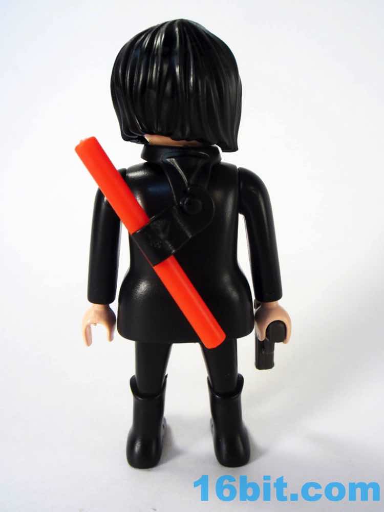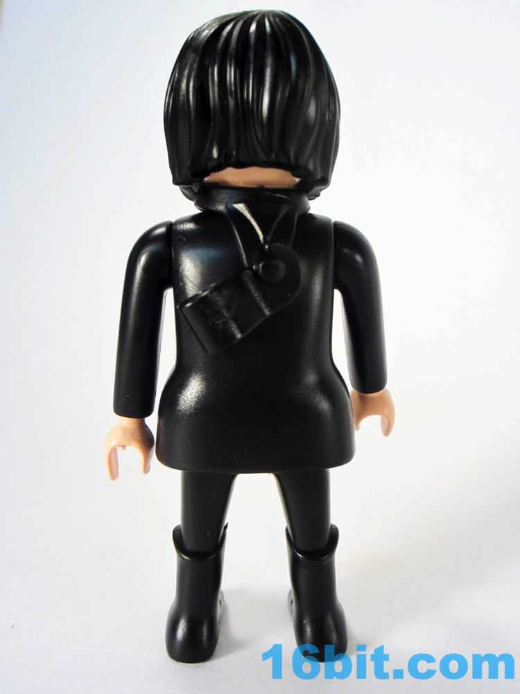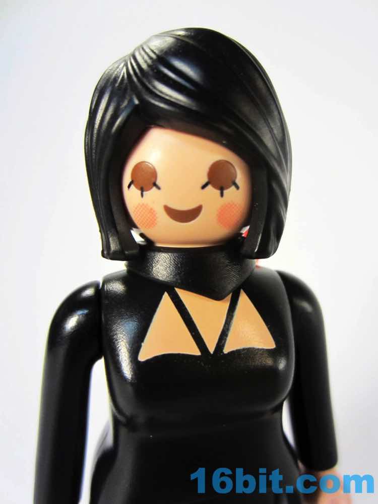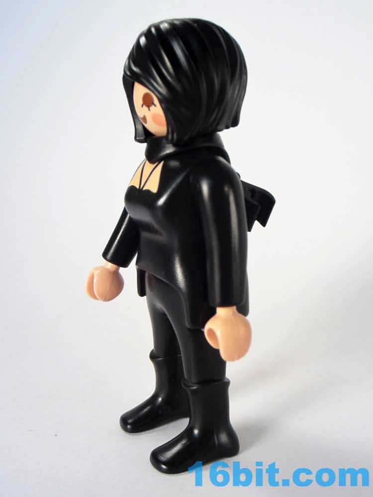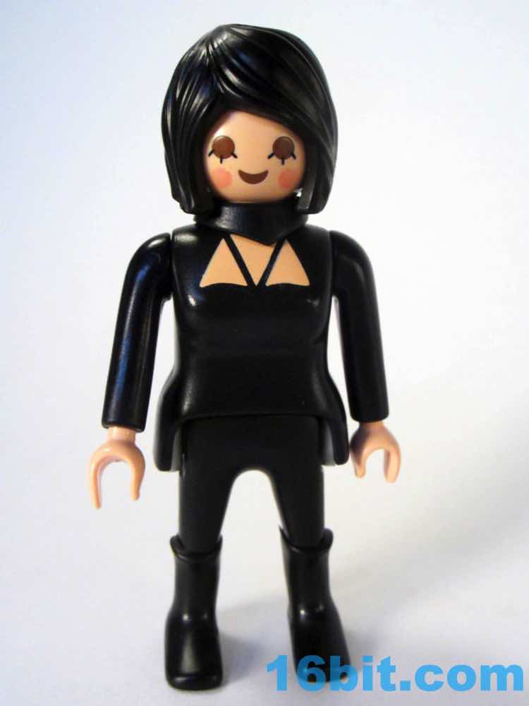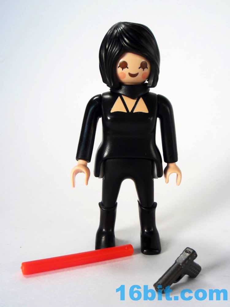 If you're a long-time fan of toys you may be familiar with the concepts of "plays with" or "inspired by." Comparing this Playmobil figure to Charlize Theron's costume from Aeon Flux will prove to you that they're clearly related - but not identical. The pants are different. The shoes are more sensible on the toy. The figure retains the triple triangle cleavage window, but drops the open back of the movie outfit's shirt. The hair is parted on the opposite side and has a mild Kate Pierson vibe. Since the figure doesn't infringe on any trademarks or remotely resemble the famous actress, you can do this sort of thing - nobody has the sole license on pretty spy lady toys, and with enough changes anybody can make pretty much anything.