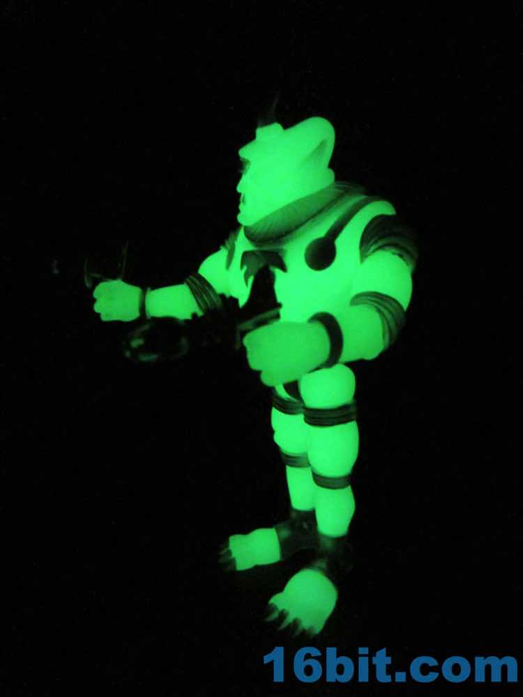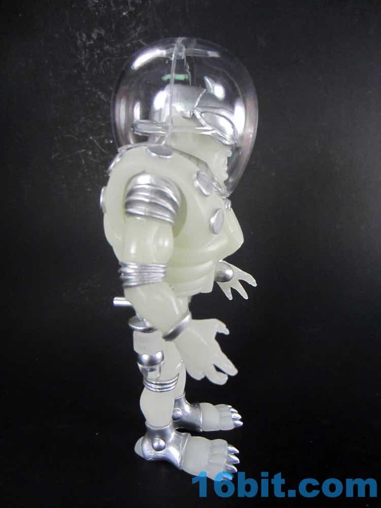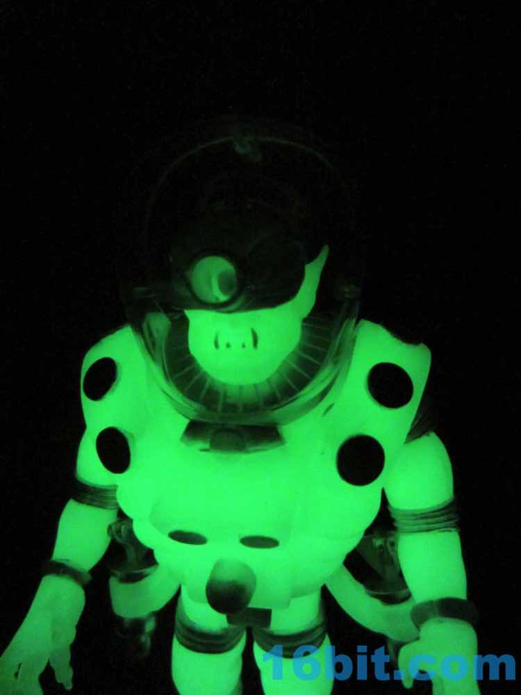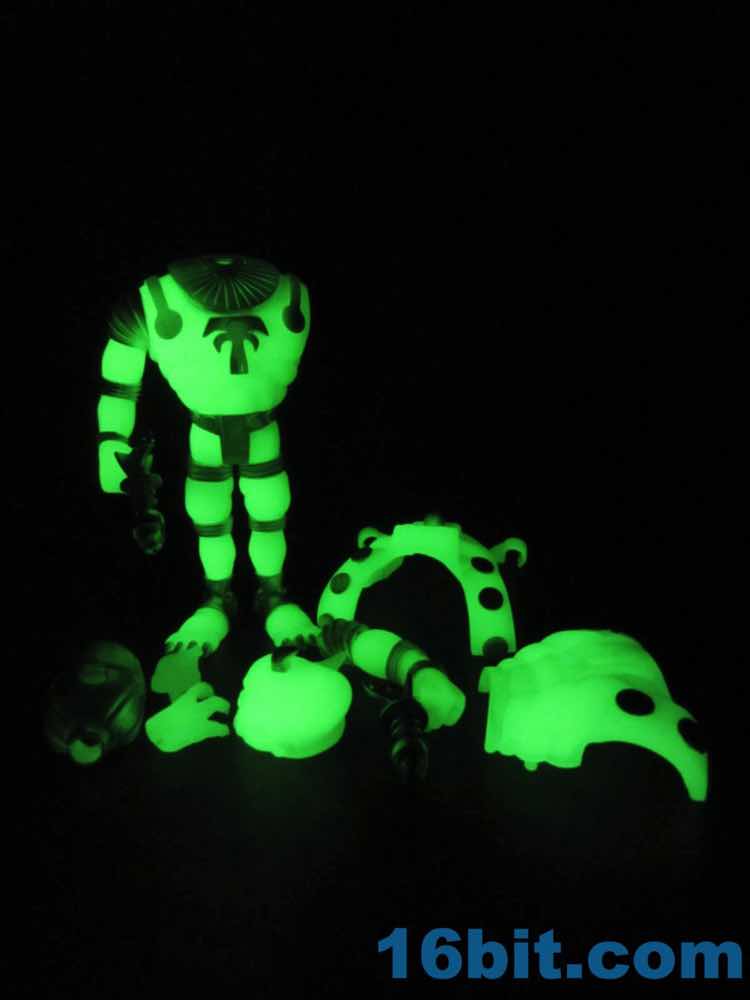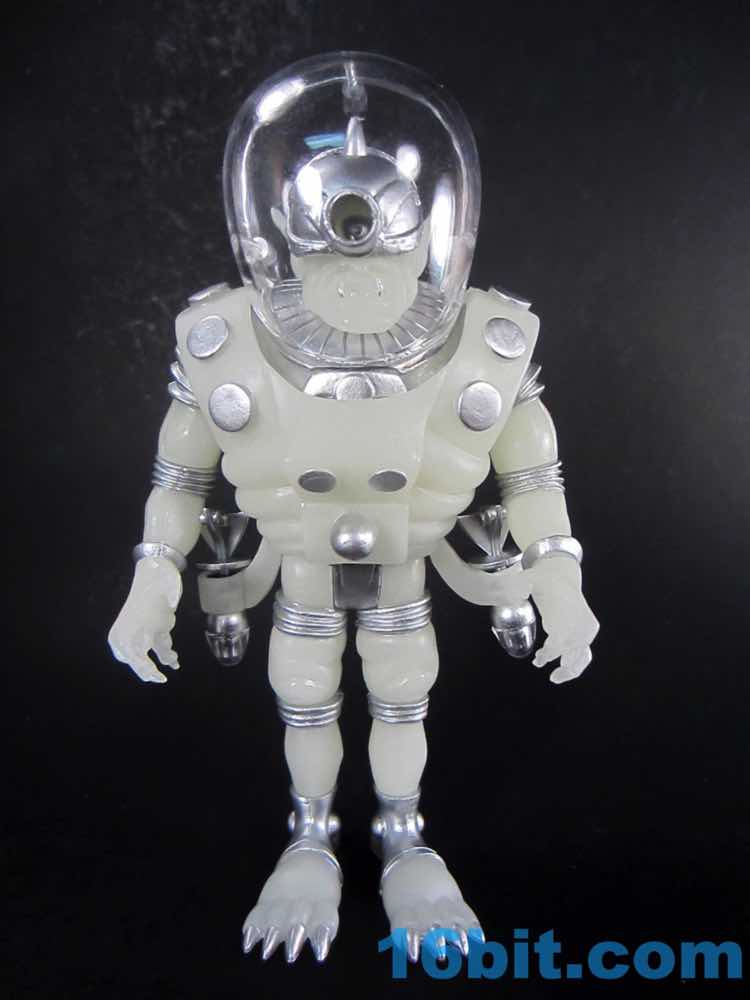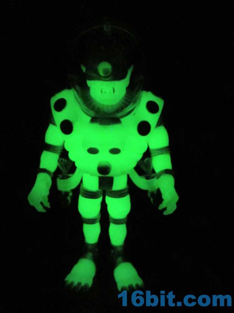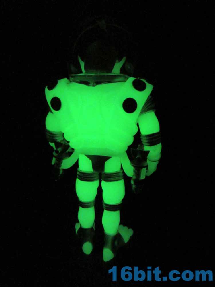 The big unspoken flaw of most glow-in-the-dark figures is that there's a slight translucent quality to the plastic which sucks out sculpted detail - the light passes through the non-painted parts making it something of a dud in regular light but a glowing beacon of joy in the dark. I've got a lot of glowing toys, and this one shines among the brightest. If you're a glow fan, I sincerely hope you either bought this figure or are planning to do so as soon as the other two are released to TheOuterSpaceMen.com, whenever this will be. Just be sure to turn down your speakers before you go there, because for some reason it plays very loud music still.