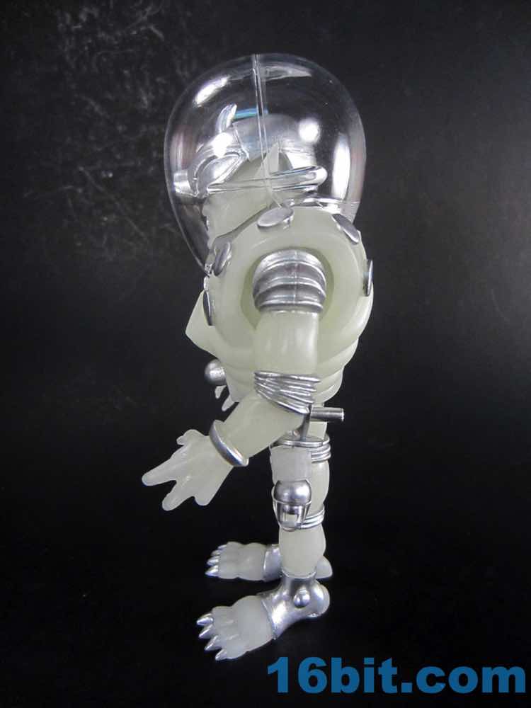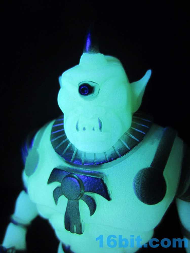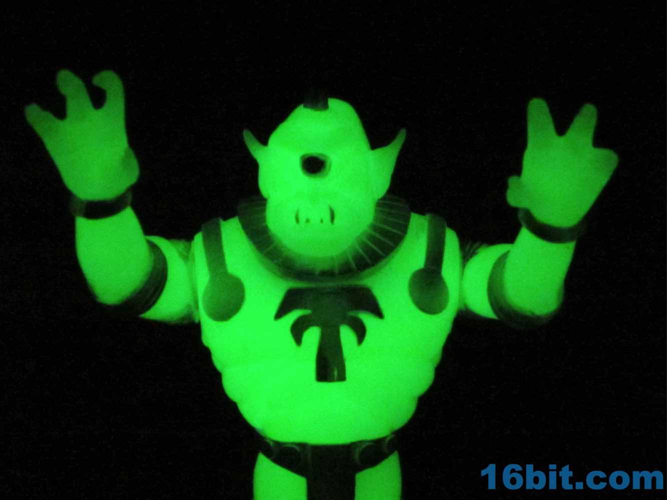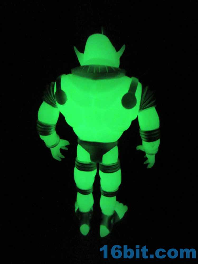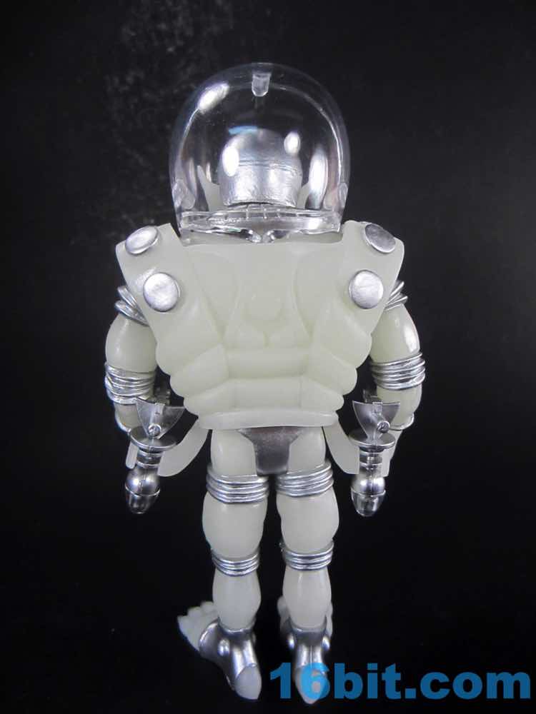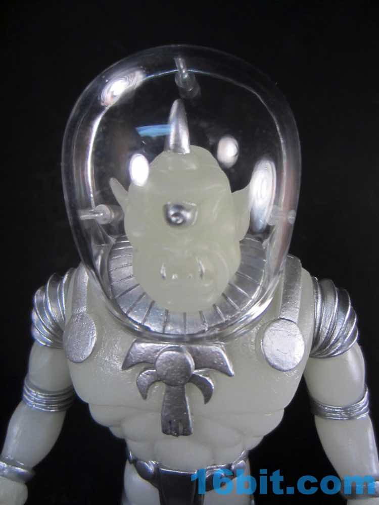 The big unspoken flaw of most glow-in-the-dark figures is that there's a slight translucent quality to the plastic which sucks out sculpted detail - the light passes through the non-painted parts making it something of a dud in regular light but a glowing beacon of joy in the dark. I've got a lot of glowing toys, and this one shines among the brightest. If you're a glow fan, I sincerely hope you either bought this figure or are planning to do so as soon as the other two are released to TheOuterSpaceMen.com, whenever this will be. Just be sure to turn down your speakers before you go there, because for some reason it plays very loud music still.