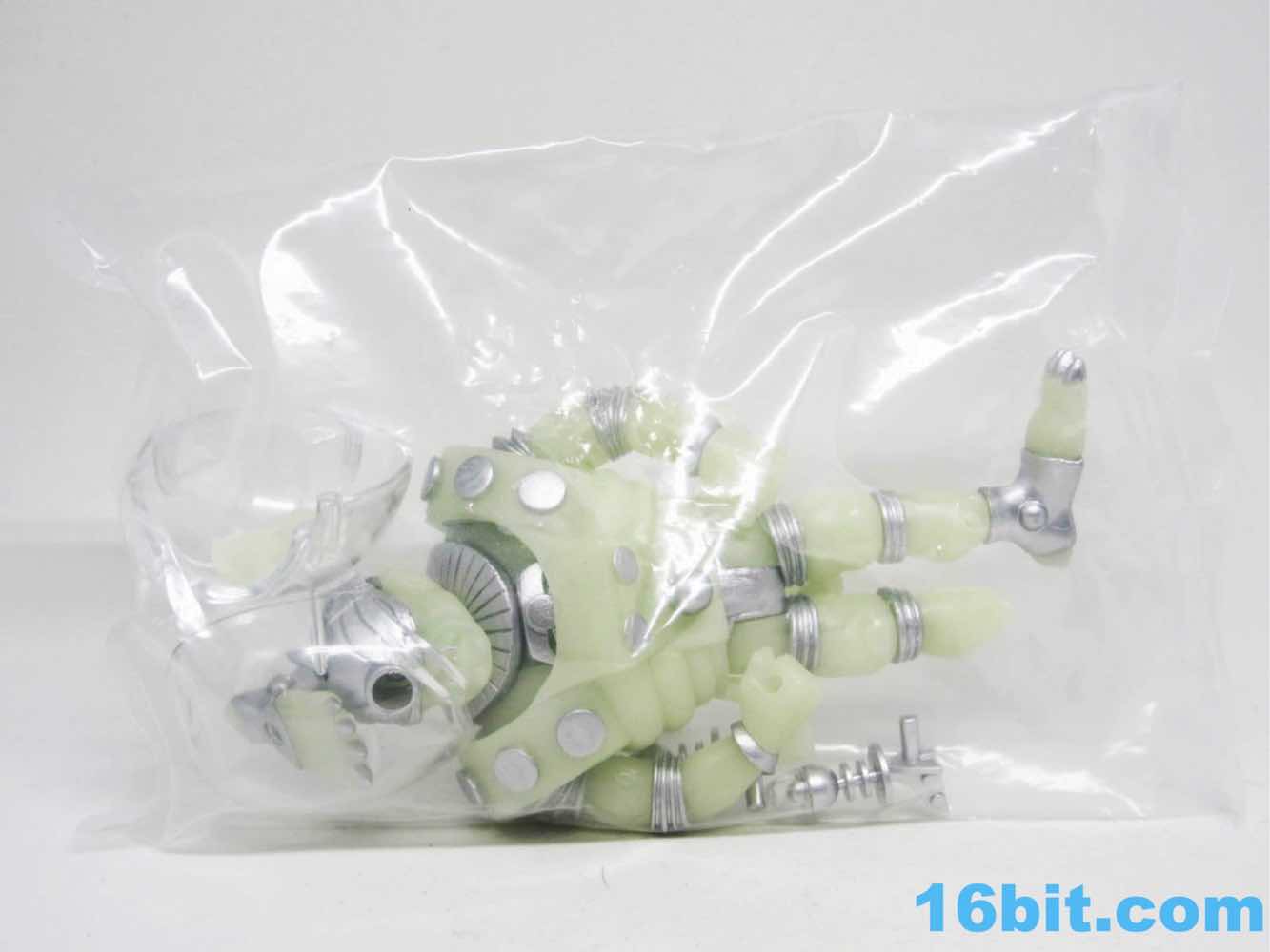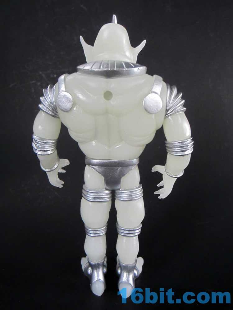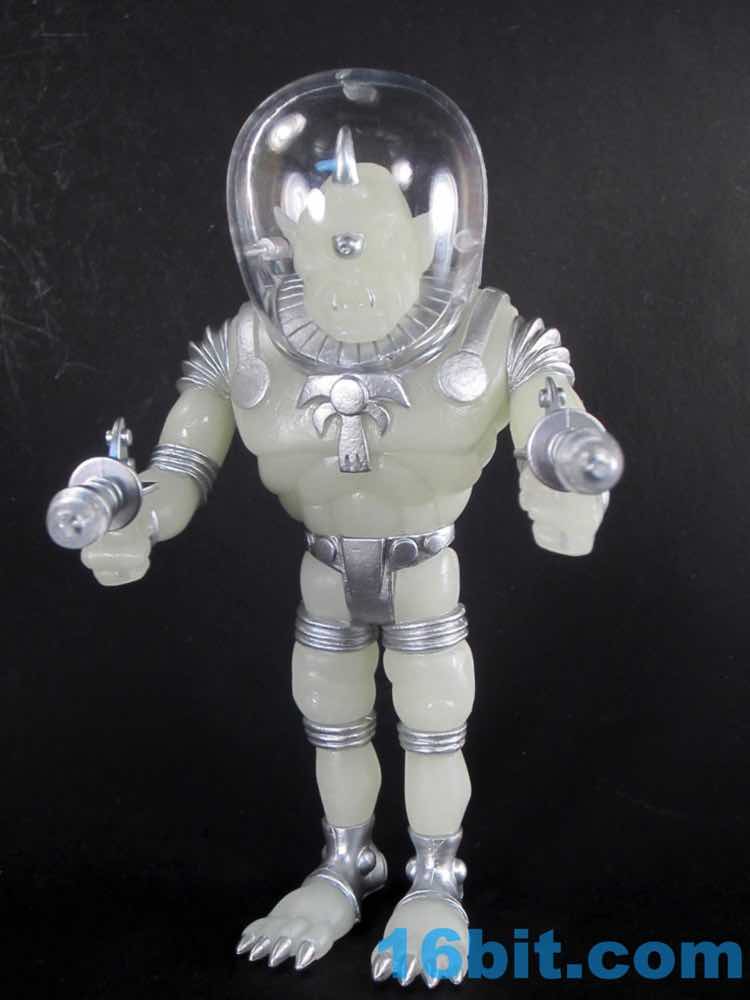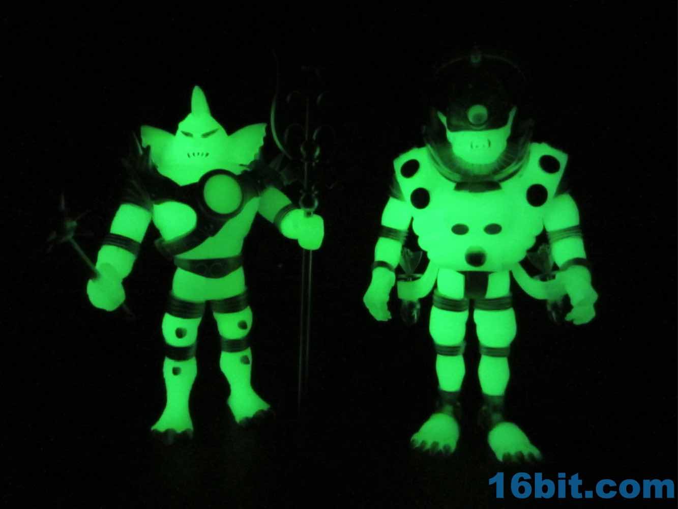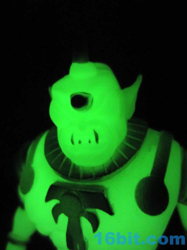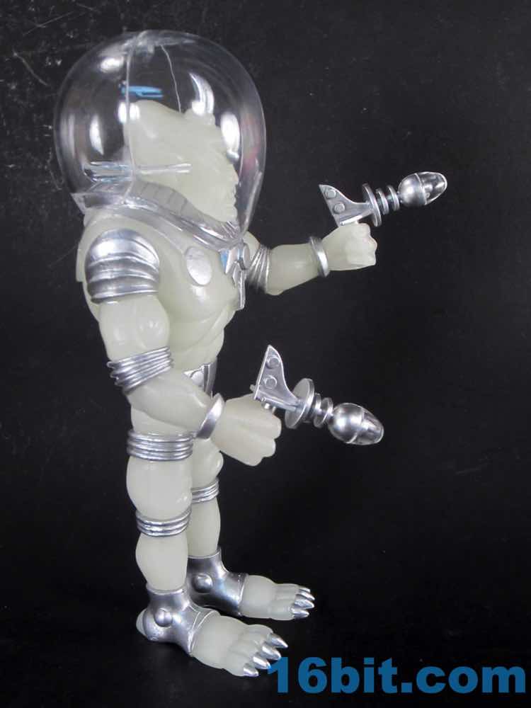 The big unspoken flaw of most glow-in-the-dark figures is that there's a slight translucent quality to the plastic which sucks out sculpted detail - the light passes through the non-painted parts making it something of a dud in regular light but a glowing beacon of joy in the dark. I've got a lot of glowing toys, and this one shines among the brightest. If you're a glow fan, I sincerely hope you either bought this figure or are planning to do so as soon as the other two are released to TheOuterSpaceMen.com, whenever this will be. Just be sure to turn down your speakers before you go there, because for some reason it plays very loud music still.