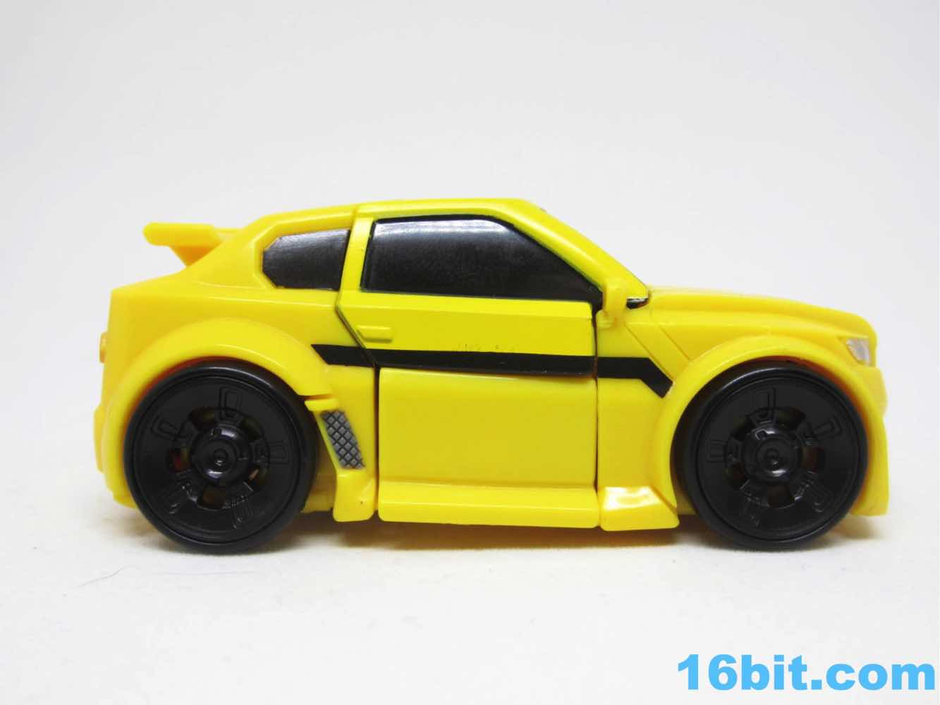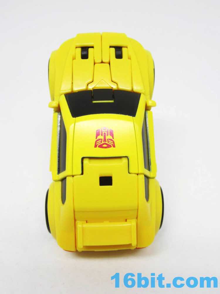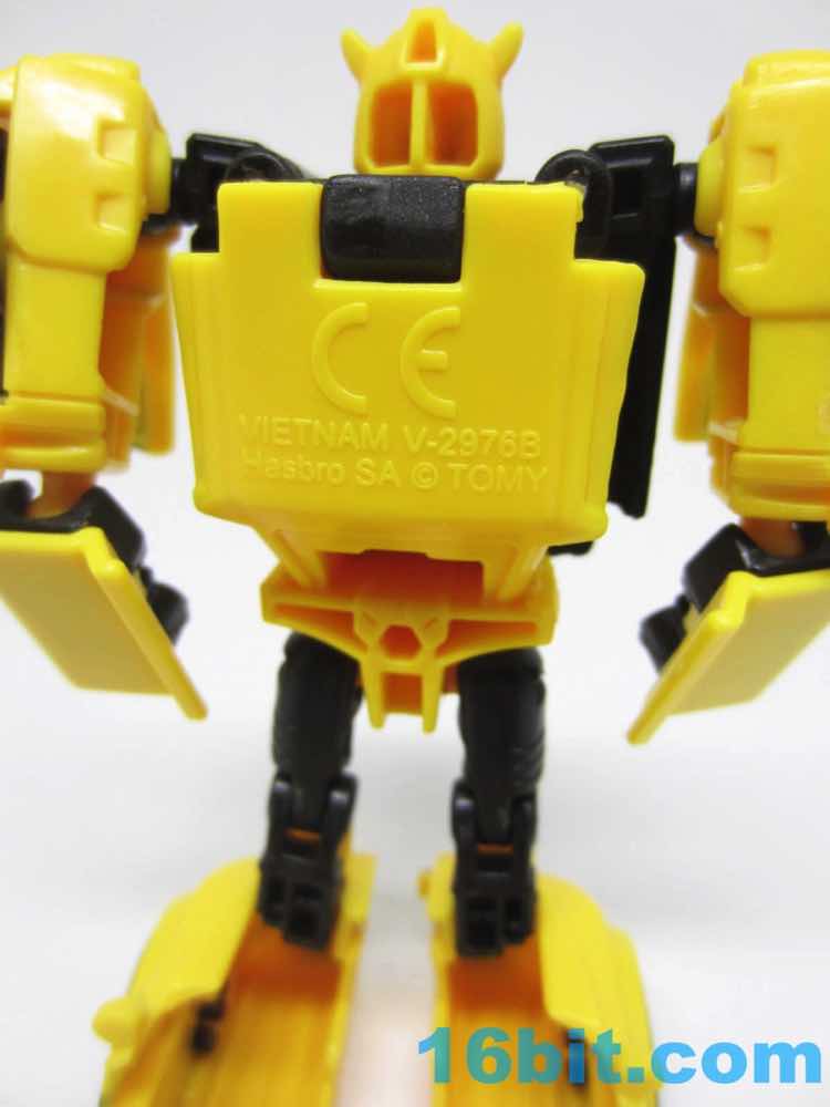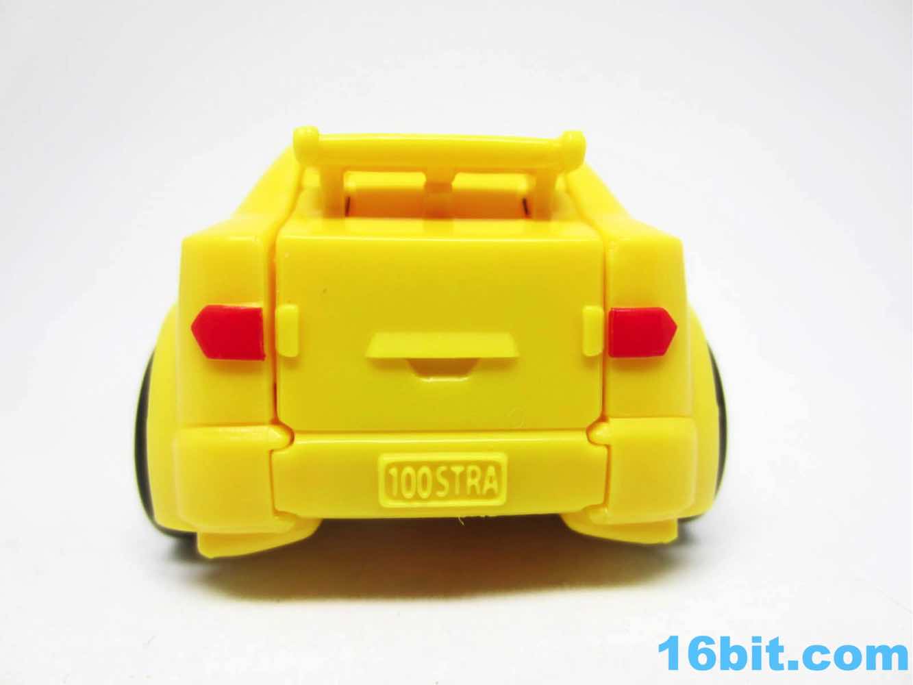 The car is more or less a typical non-VW Bumblebee, with a little spoiler plus painted lights and grille. What really struck me with this figure wasn't its boxy-yet-sporty design, but the license plate. It's sculpted "100STRA" which I am told is probably a nod to movie Bumblebee's license plate. I'm not particularly studied on the films, so there you go. Its windows are black and the wheels seem to roll quite nicely. Deco is good, but not perfect - the yellow paint on the area surrounding the top of the car is painted yellow, and isn't a great match to the molded yellow that makes up the rest of the car.