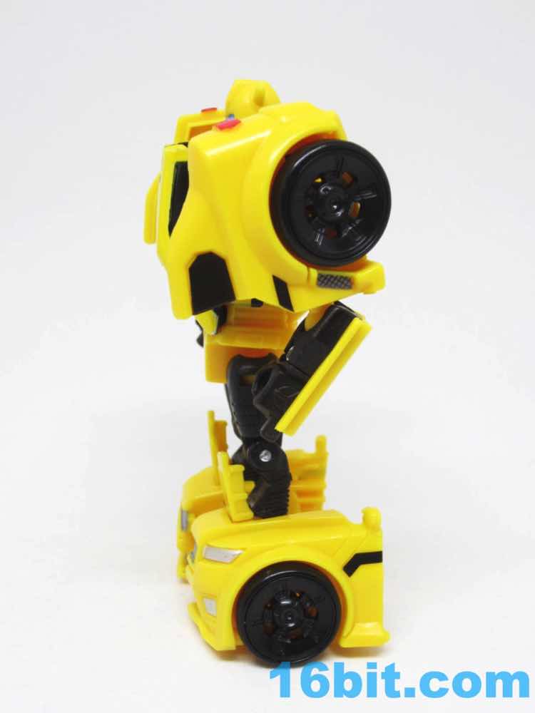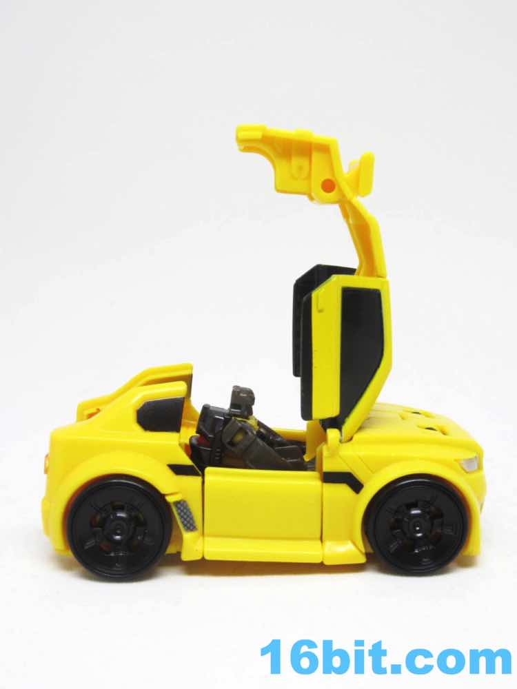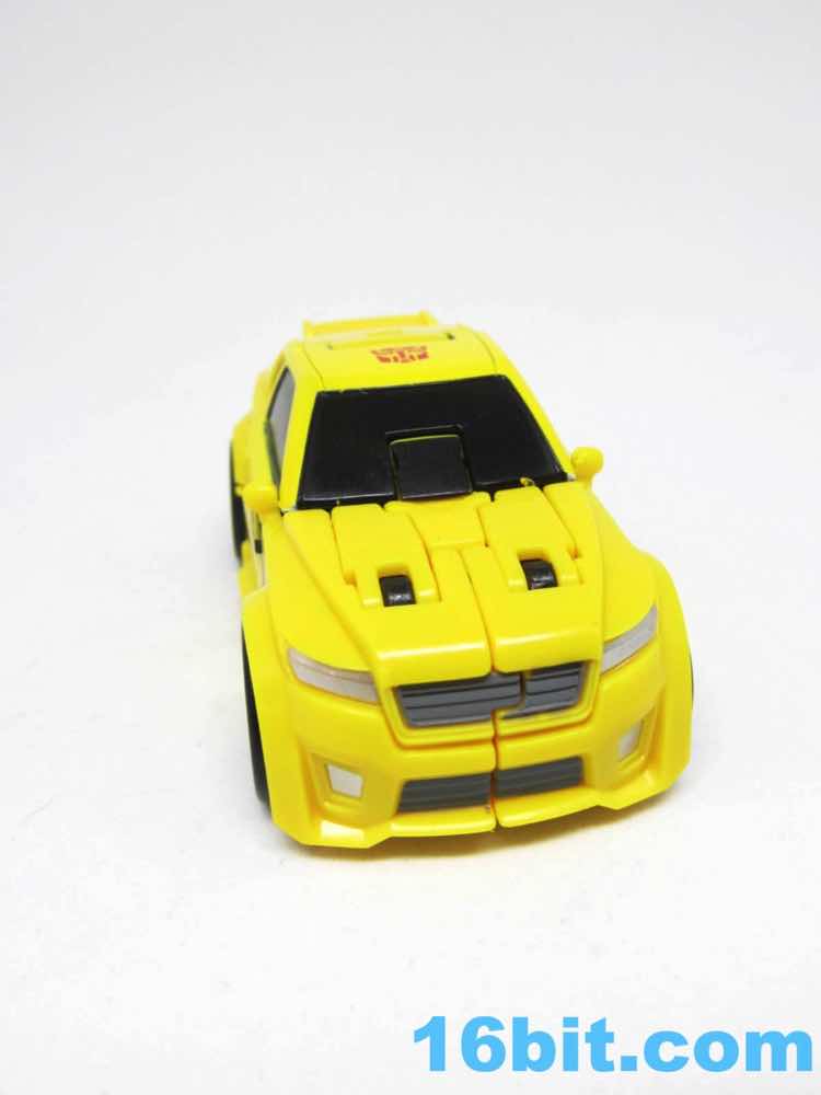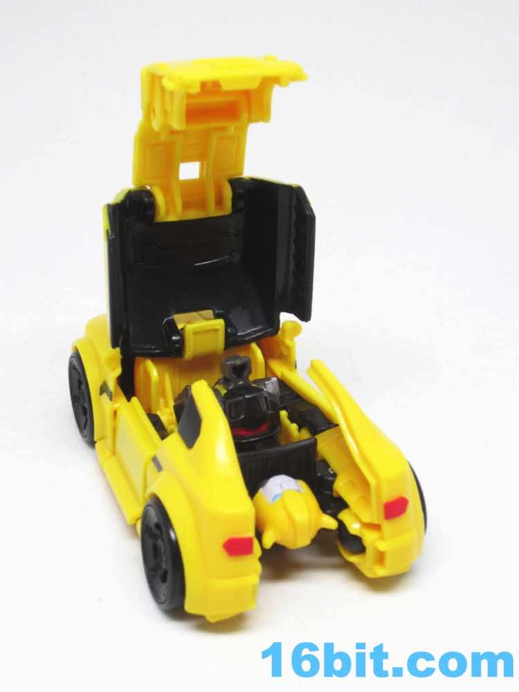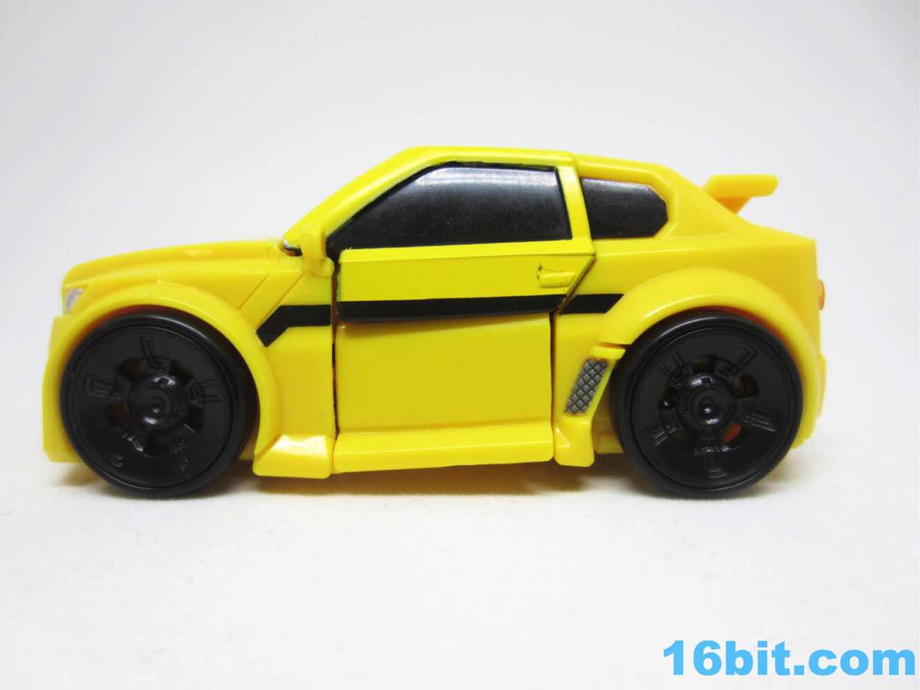 The car is more or less a typical non-VW Bumblebee, with a little spoiler plus painted lights and grille. What really struck me with this figure wasn't its boxy-yet-sporty design, but the license plate. It's sculpted "100STRA" which I am told is probably a nod to movie Bumblebee's license plate. I'm not particularly studied on the films, so there you go. Its windows are black and the wheels seem to roll quite nicely. Deco is good, but not perfect - the yellow paint on the area surrounding the top of the car is painted yellow, and isn't a great match to the molded yellow that makes up the rest of the car.