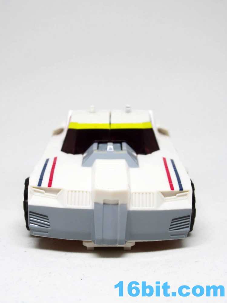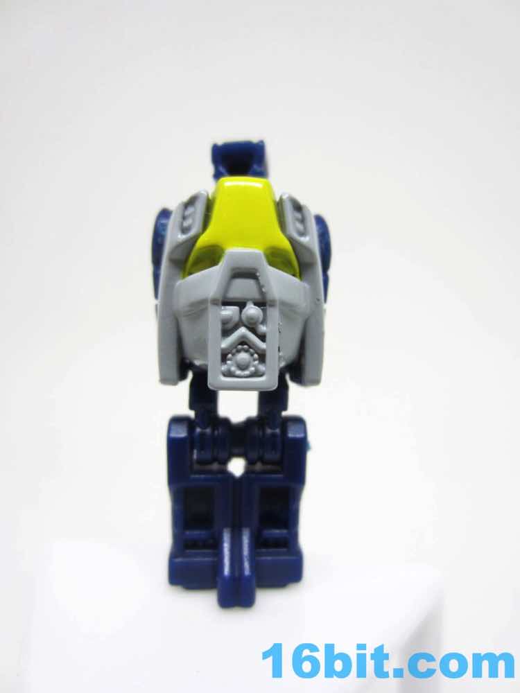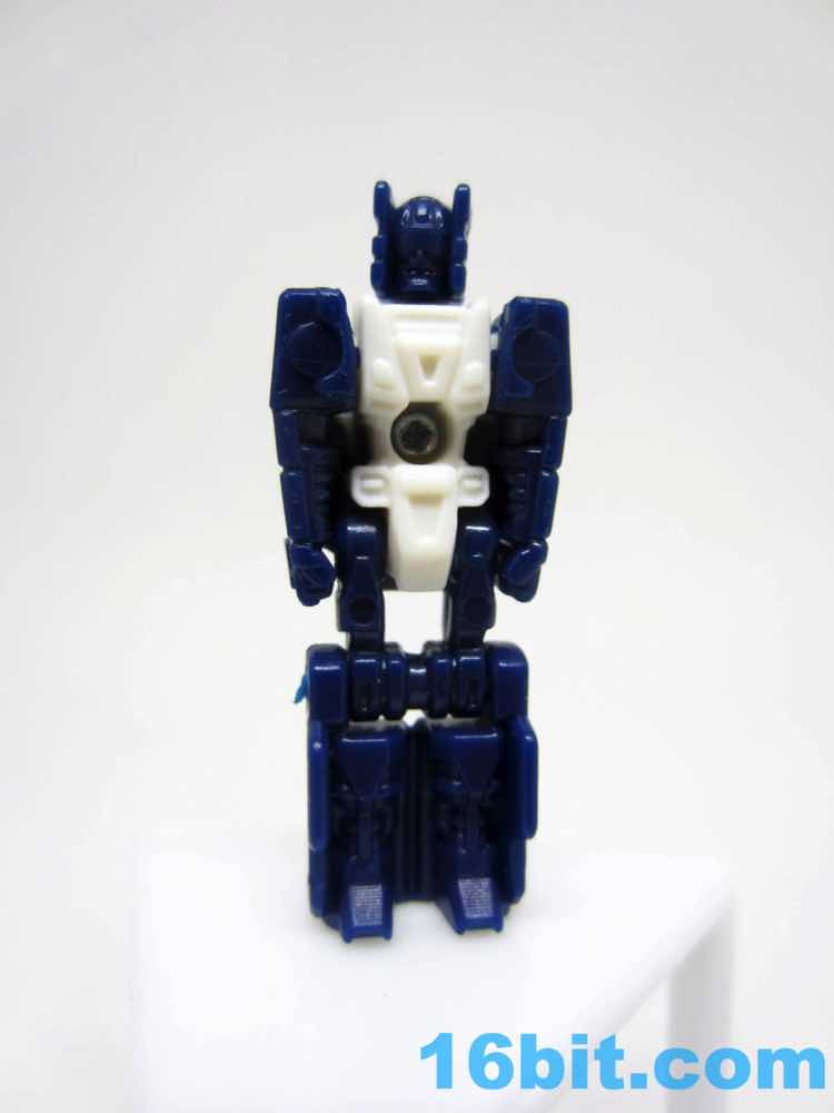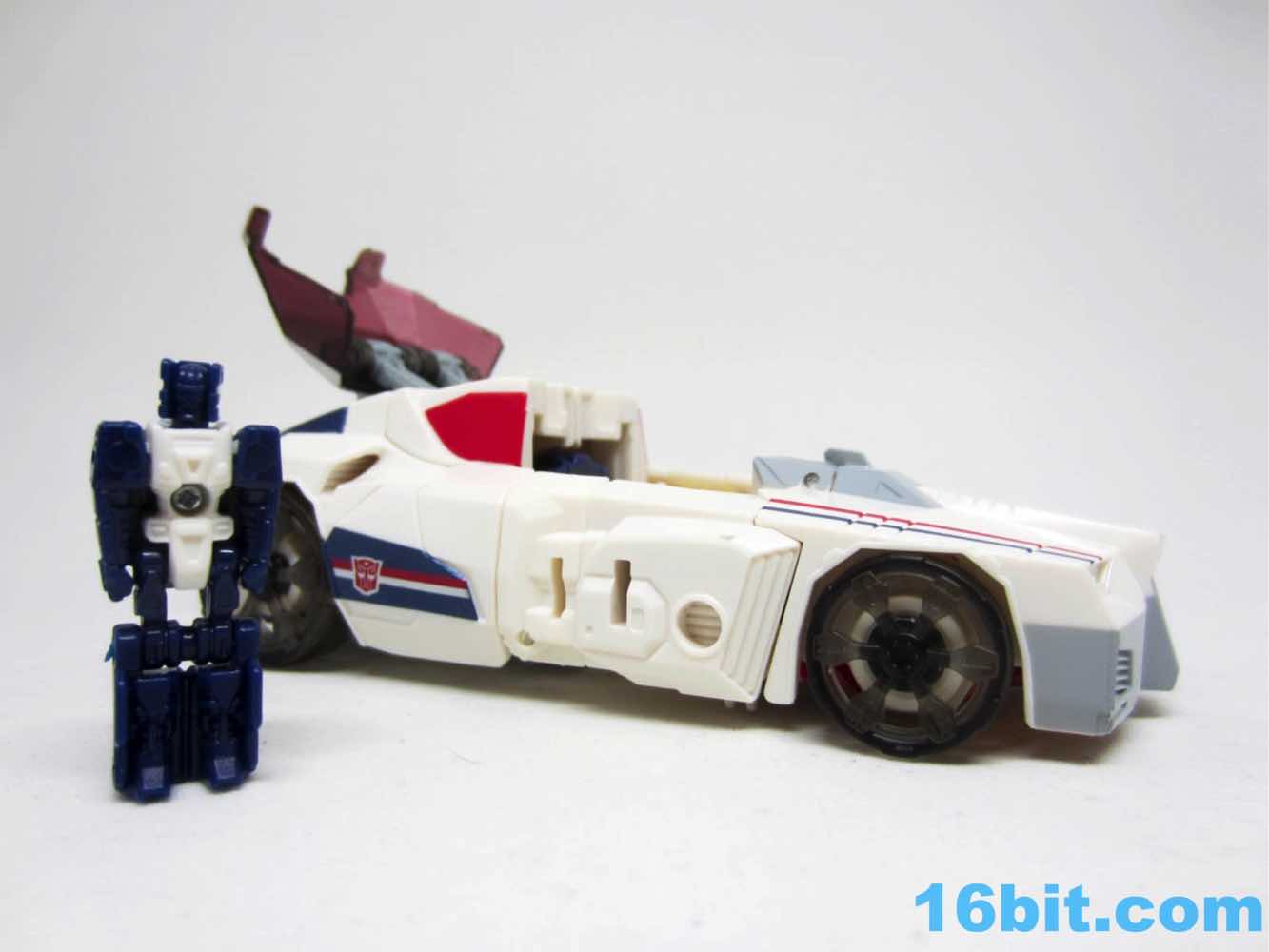 This 1.5-inch Autobot Throttle is a robot-to-head rather than a robot-to-engine. The colors don't match up at all, and the sculpting doesn't really either - after all, the entire axis of Throttle/Breakaway recycle parts of the previous Blurr and Chromedome toys. The coloring of a blue-armed white robot doesn't at all match the grey-bodied red-limbed original, but it performs its tasks well and has little deco other than the face plate. It fits in the car nicely, because it had previously.