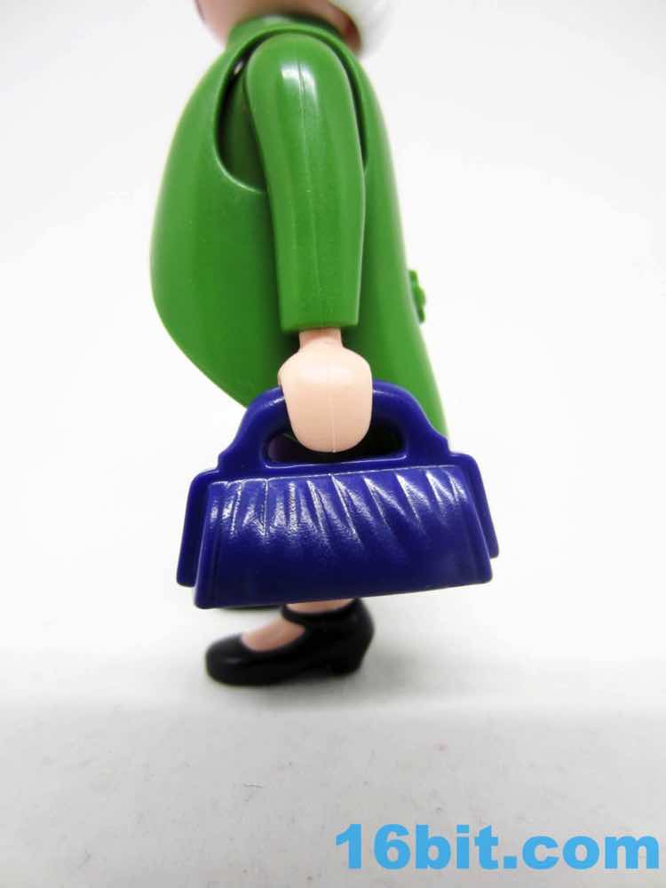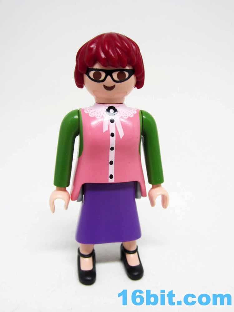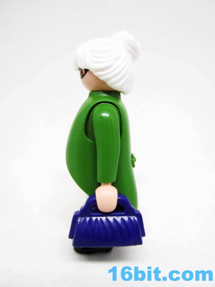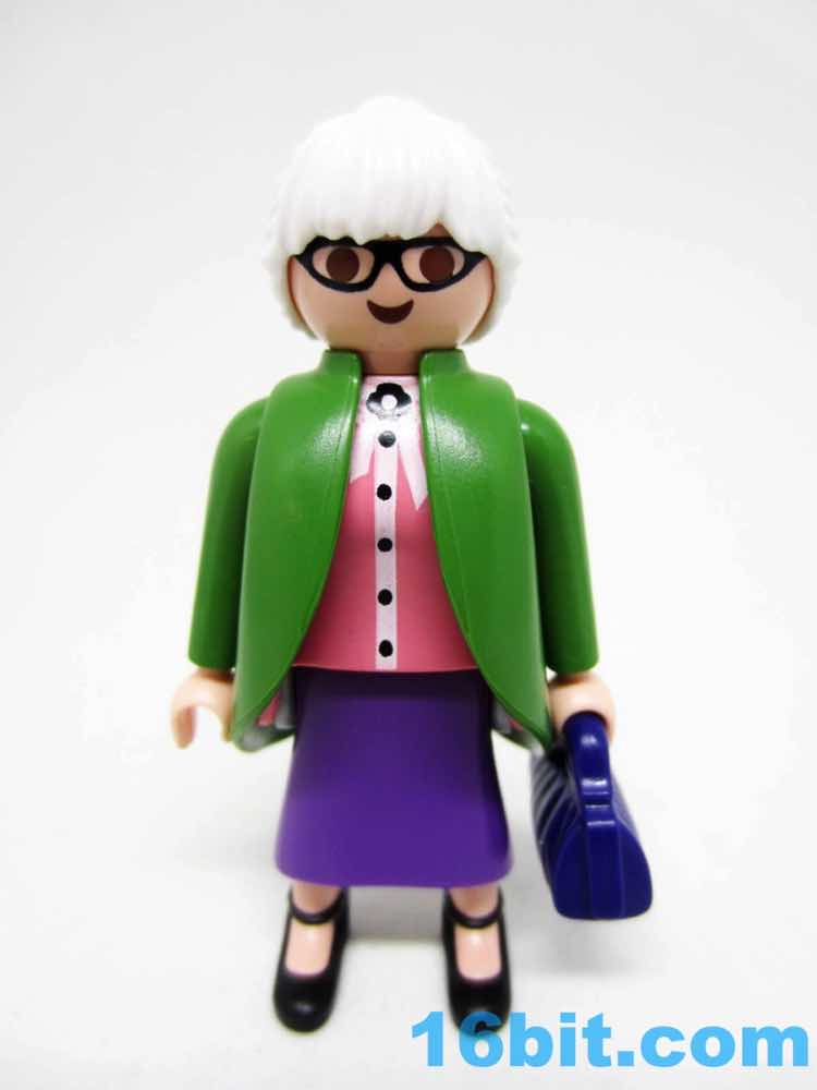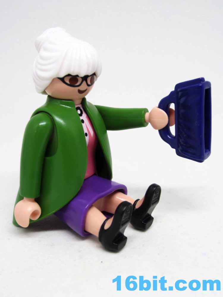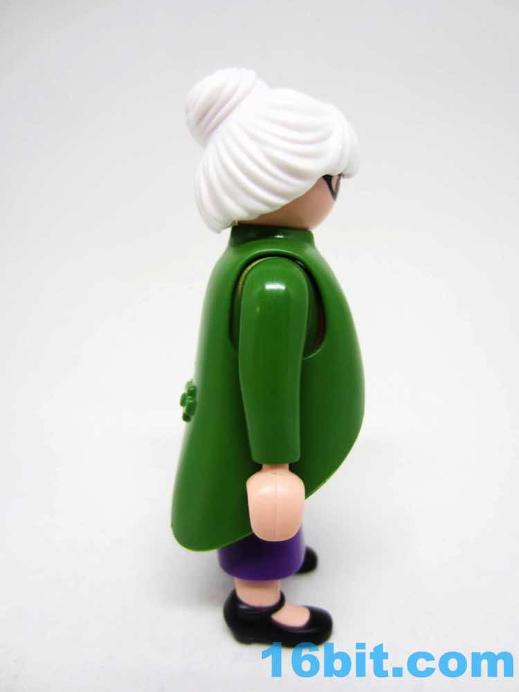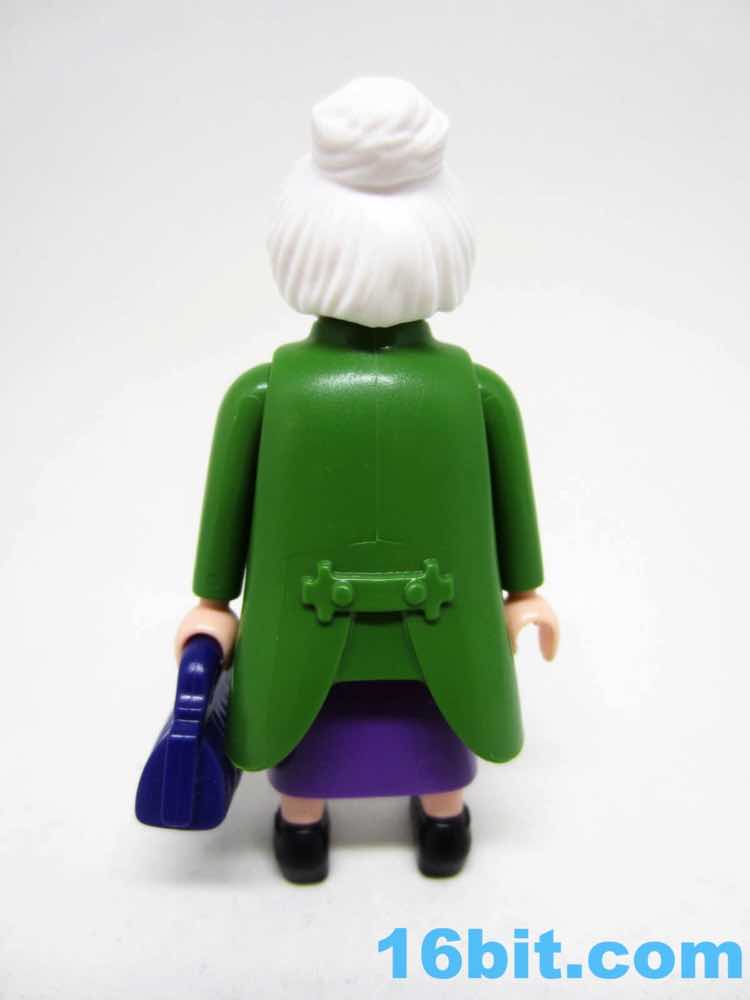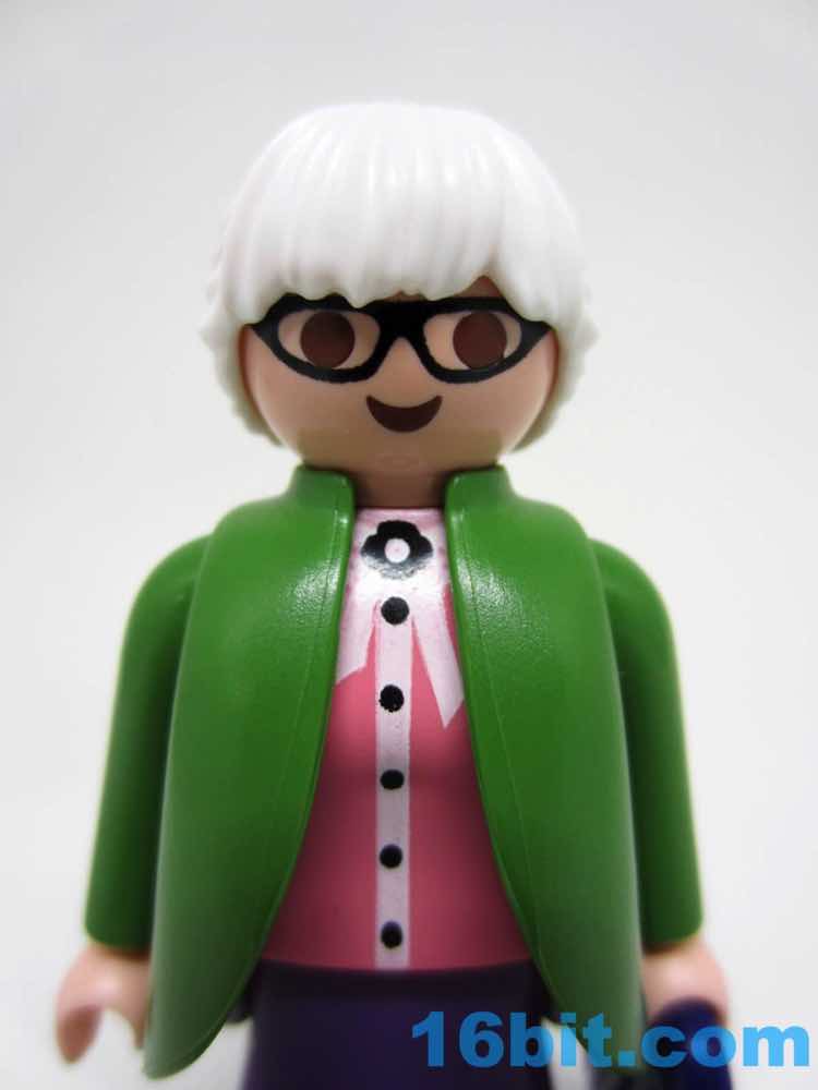 Given the features - and lack thereof - most Playmobil figures' ages are merely projections you put on their face. The white hair, glasses, and costume make her "old." Throw on some other wig and she's suddenly young, or dressing ironically, or living in Brooklyn ca. 2016. The button-up pink shirt can look like a sweater vest if you elect to leave off the overcoat, which actually does do a convincing job of making the figure look like she stepped out of an old movie. The pea-soup green looks sharp, and compliments the purple skirt nicely. Also, black shoes go with everything.