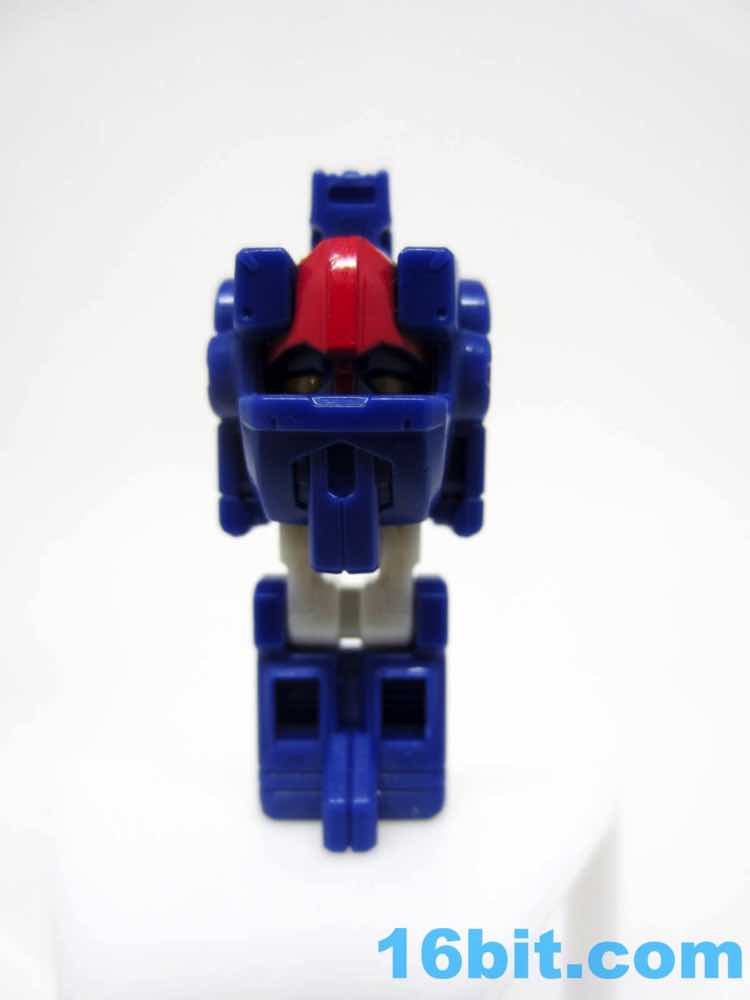 The tiny 1.5-inch Blowpipe is perfectly good. You've seen a few of these, and they're all basically the same toy in terms of functionality. 5 points of articulation and a slightly recolored mini robot can serve as a pilot for Triggerhappy's shuttle mode quite nicely. The colors don't match the original at all, other than a vague blue and greyness. and the color layout isn't quite the same either. The sculpting between the two robots are mildly similar, though, so I assume the Japanese one will have a green face and all of that. There are small vents and tiny details, and you'll need a magnifying glass, a macro lens, or eyes of a young boy to see them.