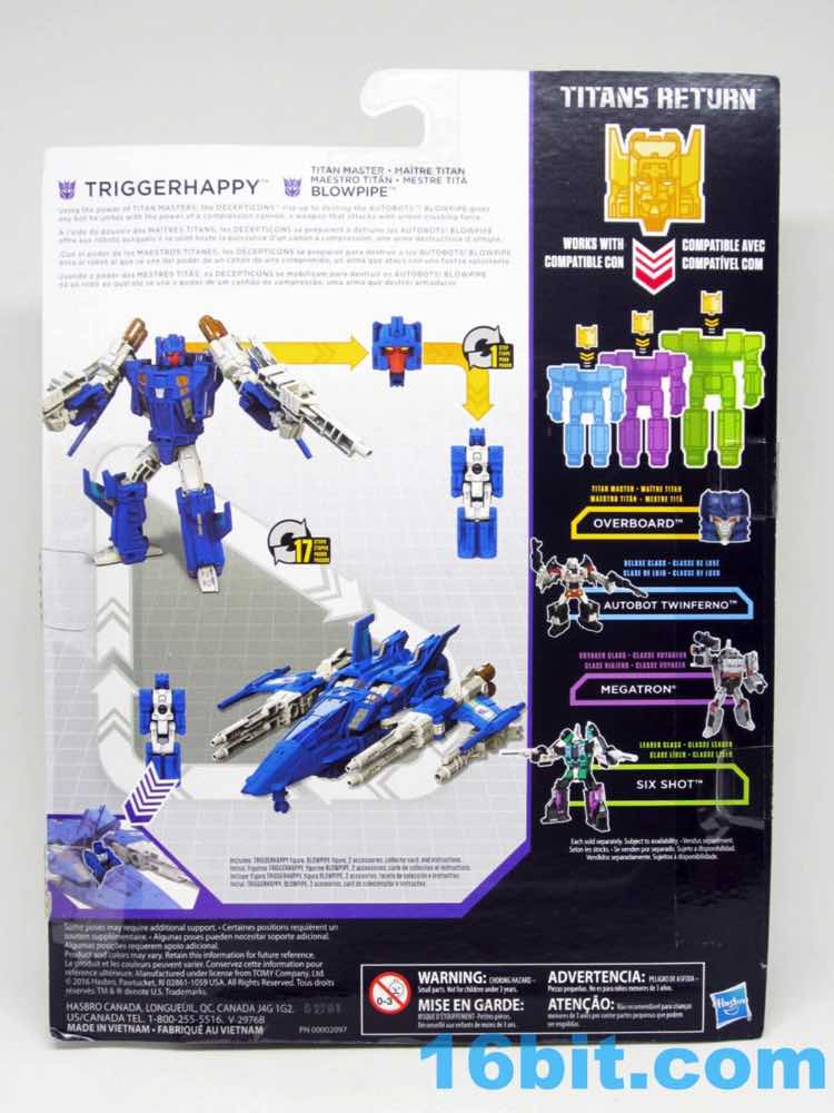 I really dig the Triggerhappy robot mode. The chest has a seating area for a Titan Master figure, and the design improves on the original. The classic toy had a nosecone swinging between his legs, and the new on has it fold away as a backpack. The fold-up guns on the forearms are very similar between the original and remake, but things like the little wings on the shins are new, as is the chest that looks like a chest rather than plane kibble. It's almost a new design when you take a big step back - the little gold shapes on the chest, the white Decepticon logo in the middle, and the aforementioned head almost make this feel like a heavily mutated Cyclonus in spots.