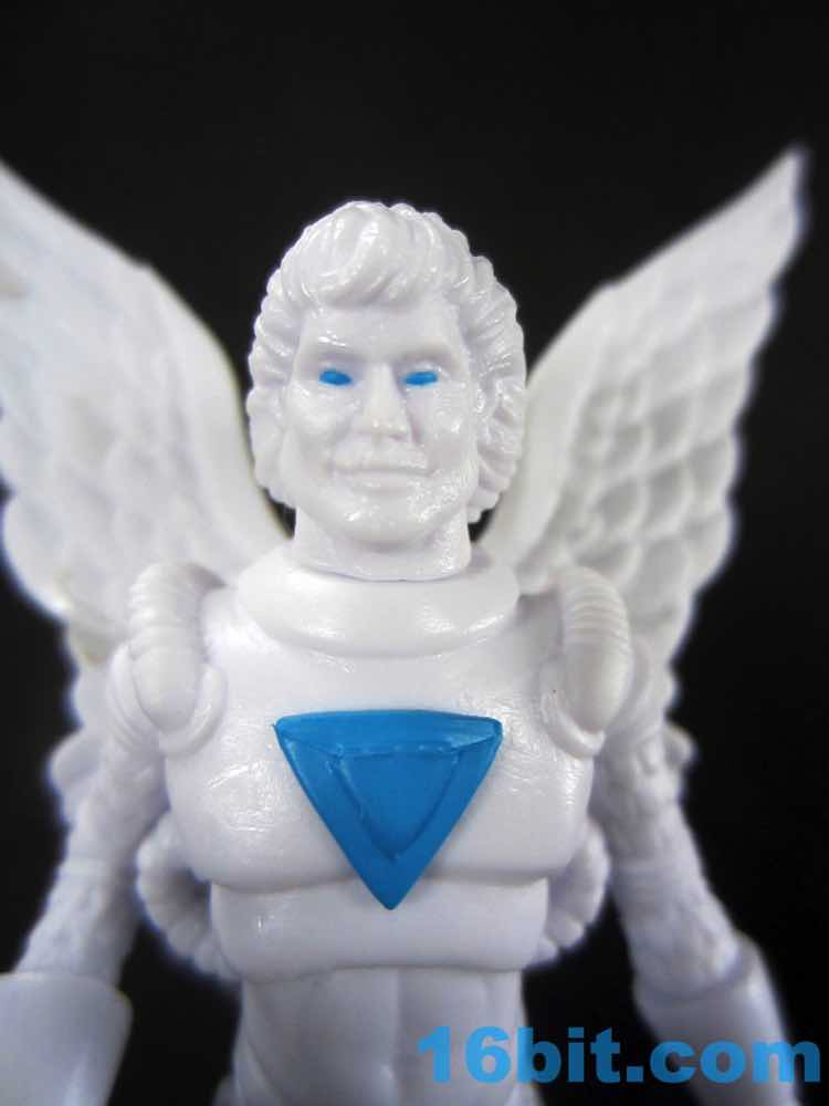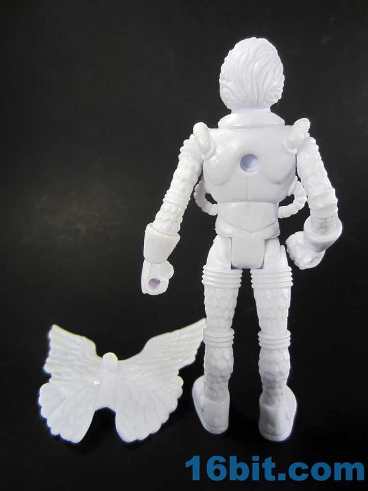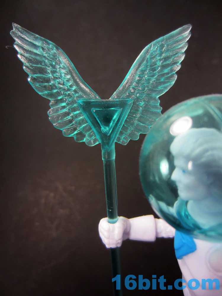 In white, the quasi-feather space suit armor comes to life in a new way. Granted, it was already pretty lively in gold or blue, the white color shows the outlines quite nicely as the shadows cast do much to help the many tubes and sculpted bits "pop." The blue helmet actually does a nice job framing the head and providing an actual halo of sorts around it, with the clear staff providing a nice match. The opaque chest ornament matches a painted blue crossbow, giving an air of non-uniformity to the package. All together it's a good base for a custom figure, but it would be even better with no paint and clear colorless - or all white - accessories. As it stands, it's sort of - but not quite - the marble statue take on the figure. A hall of these would look pretty cool, but as an incomplete subset it sort of loses that charm.