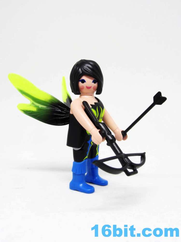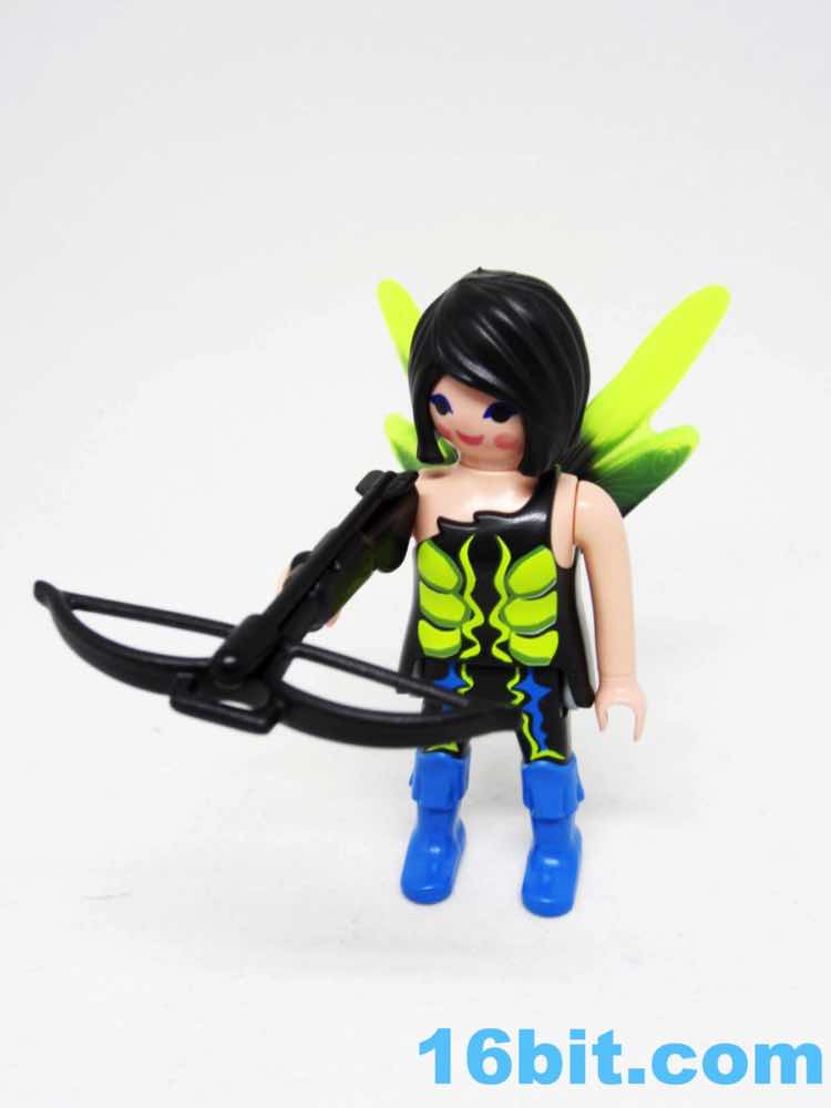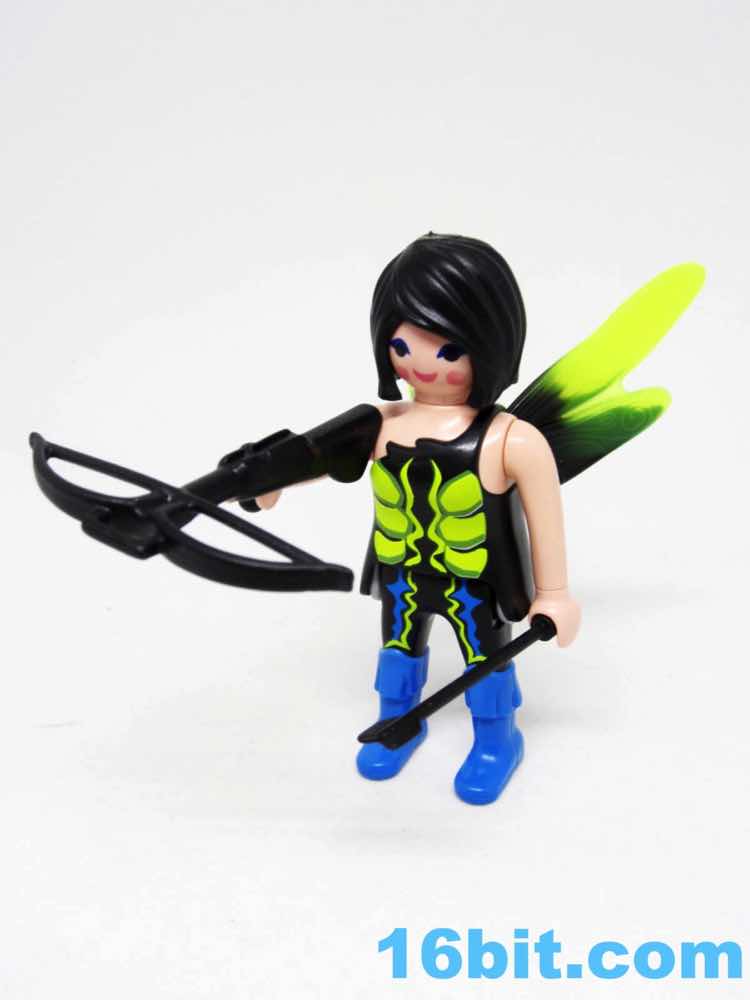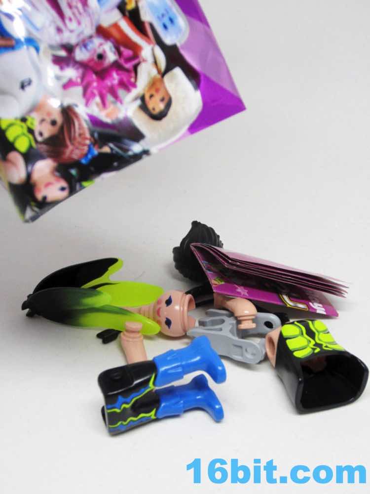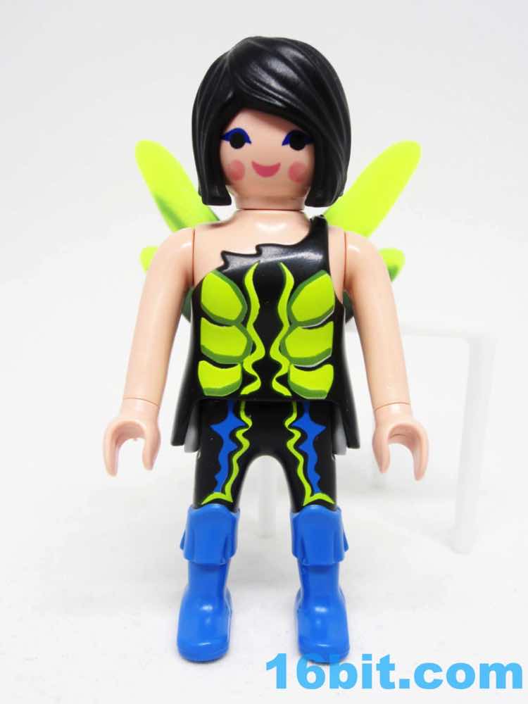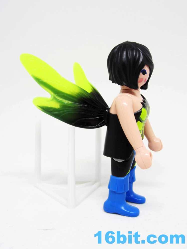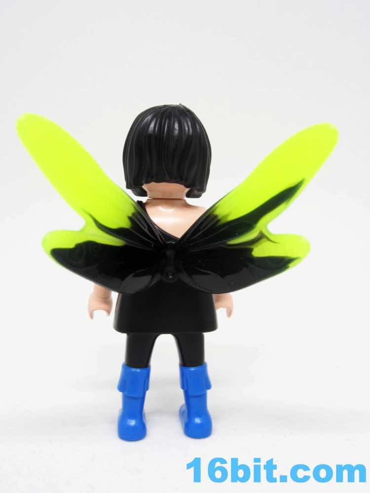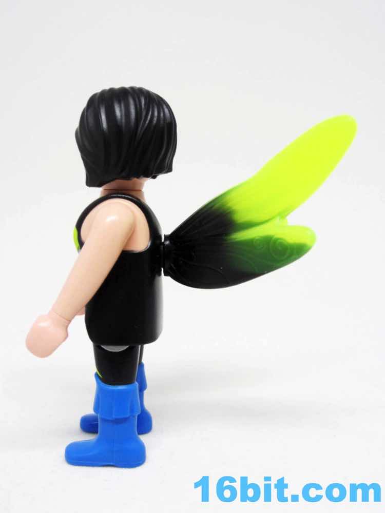 As with all of the blind bag Playmobil figures, assembly is required - normal figures don't require you to plug in the arms, legs, and head like the bagged ones. This one adds a step of plugging in the wings, which I should note are a manufacturing oddity in the toy world. If you collect records, you know swirled color vinyl isn't unusual - it means no two records are exactly alike, and this sort of technique isn't to common in toys. Here, day-glow greenish yellow has been smooshed with black to make a set of wings that really pops nicely. If you have a black light, this figure sings.