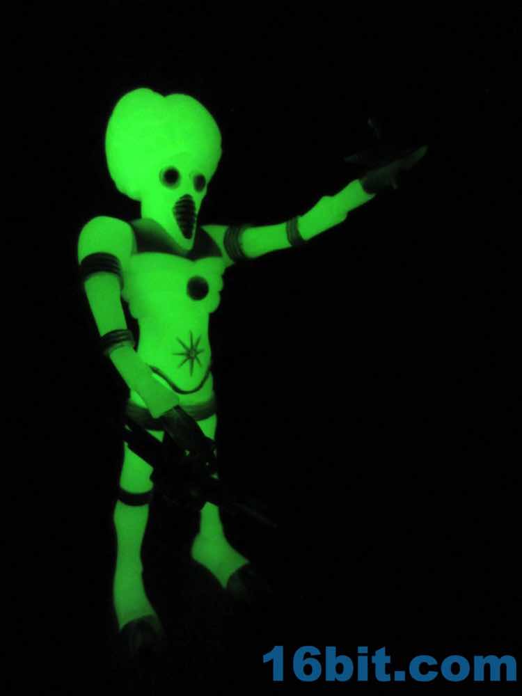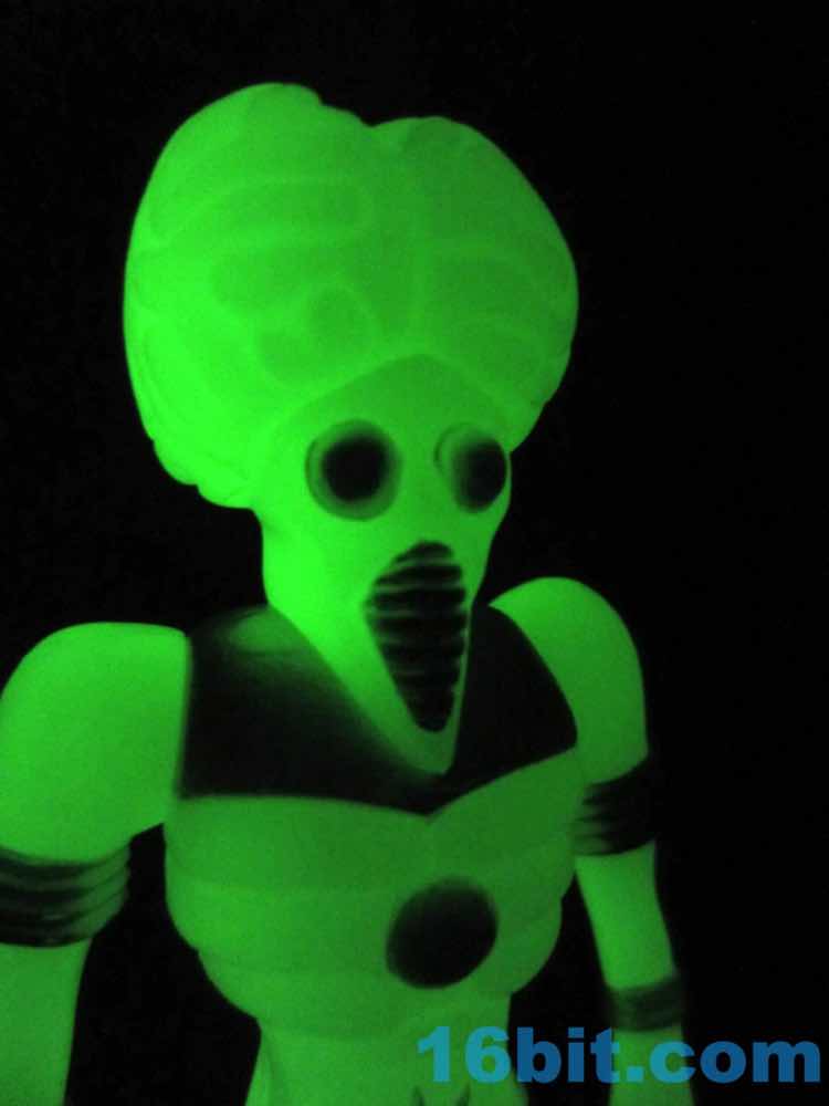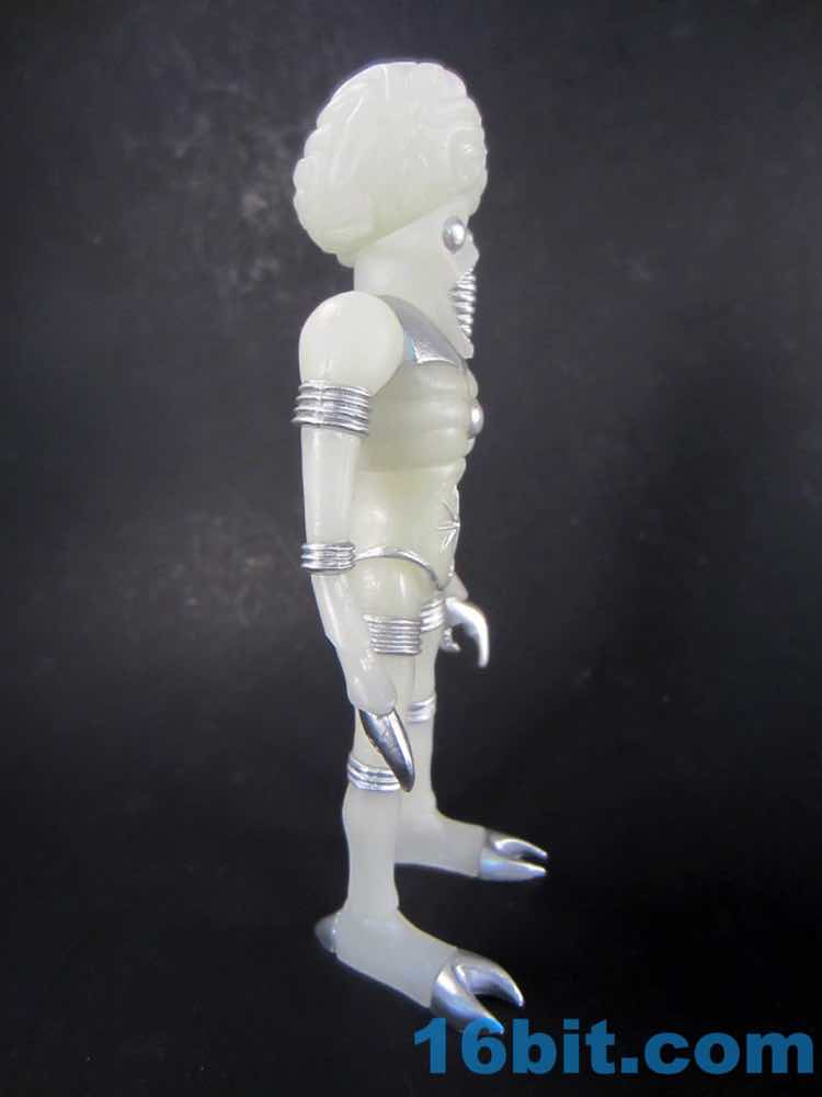 Since its debut, the Outer Space Men Man from Uranus has really grown on me as one of the best. Sure Cosmic Radiation Orbitron looks like they just cast a Metaluna Mutant in glow plastic, but there are a few differences - not the least of which is that this one is a more convincing space alien thanks to it not wearing normal pants. Now cast on glow with silver highlights, you're either going to totally appreciate yet another Cold War-era monster in radioactive glow, or you're over it. I can see it being too much of a good thing, but if you're going to give me too much of anything I'm glad that it glows in the dark.