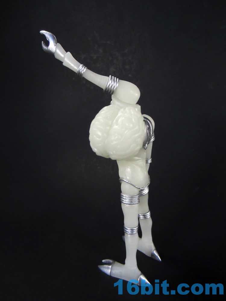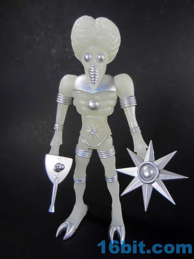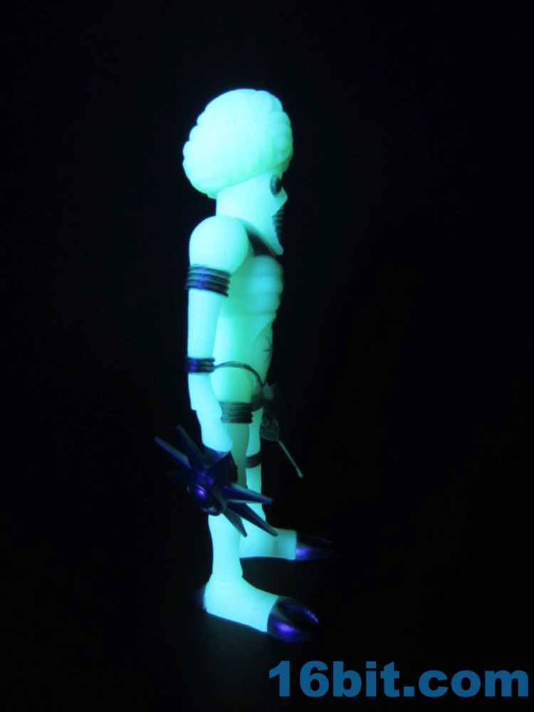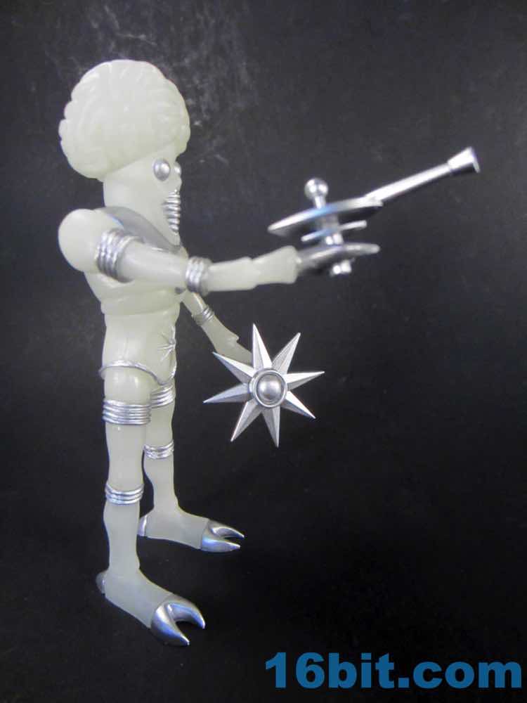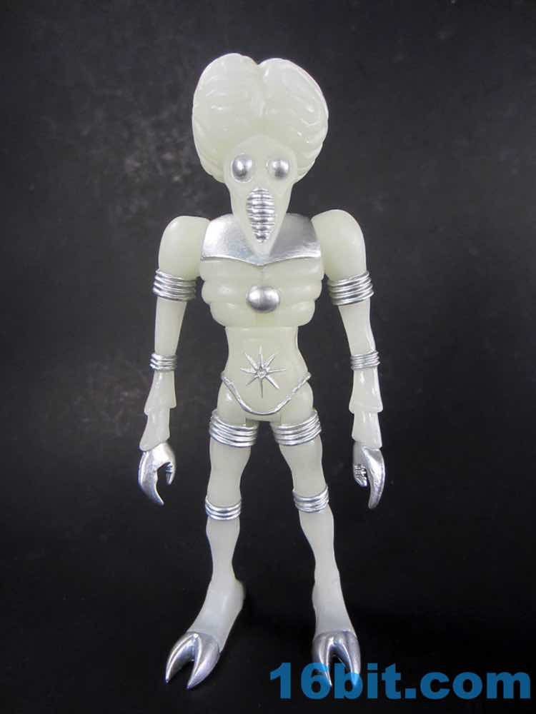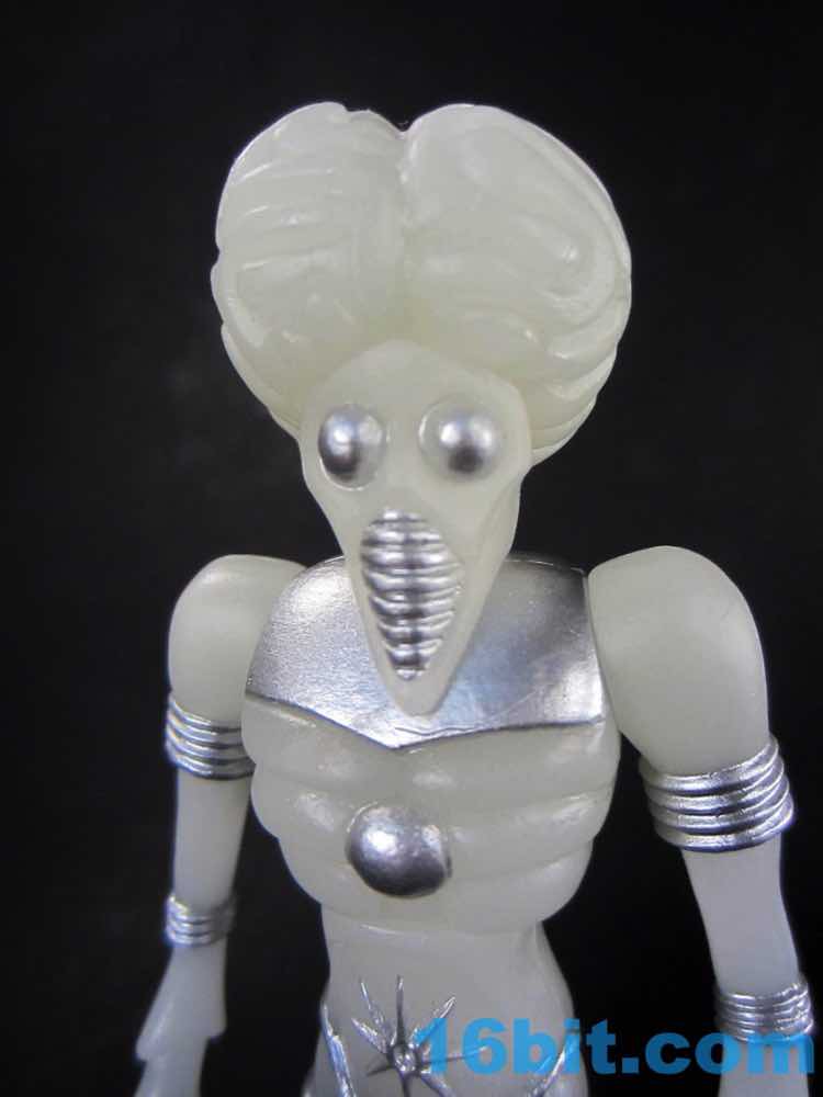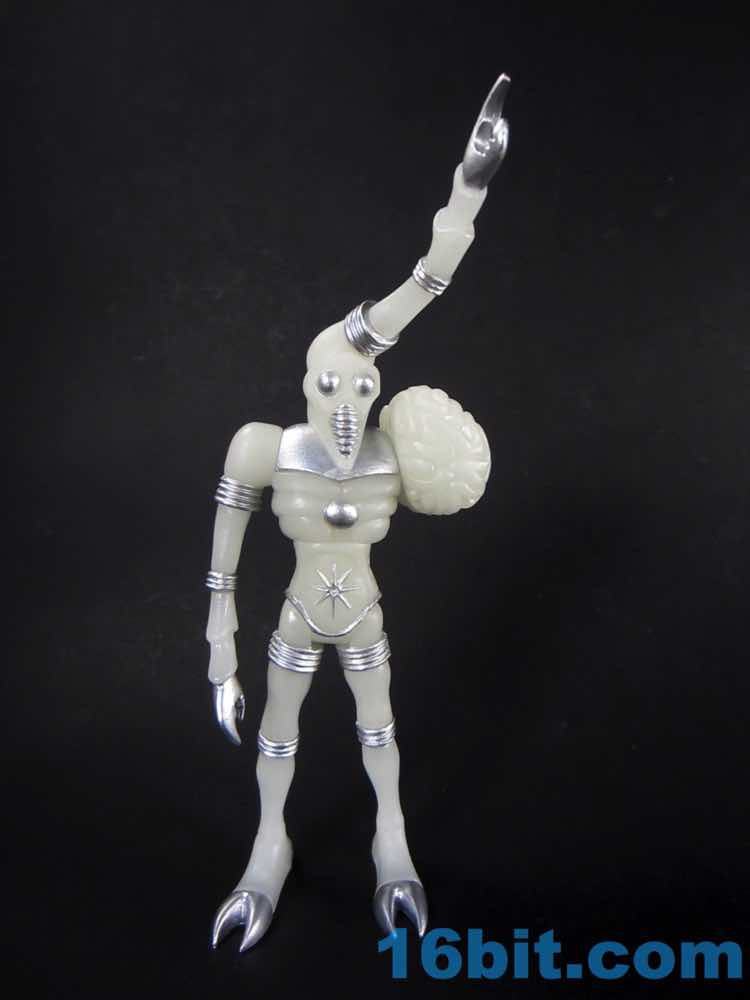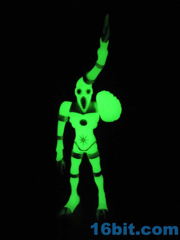The larger figure is a lot like the previous versions. It's actually exactly like them, except for color - you get 16 plastic pieces you can pop apart, including his two weapons. The weapons are cast in clear colorless ABS plastic and painted silver - although some clear bits poke through - while the PVC is all glow, and matches the other Cosmic Radiation figures quite nicely. Silver highlights were added to the figure, which probably would have been just fine in unpainted glow plastic. Silver claws, joints, belts, and ornaments were added to make him pop - the silver chest really adds a lot to the figure, and I would not have expected it to make a big difference. The glow plastic is a wee bit translucent, so bringing the figure's body into the land of the tangible is a nice touch.