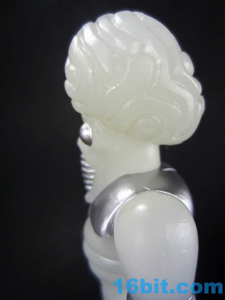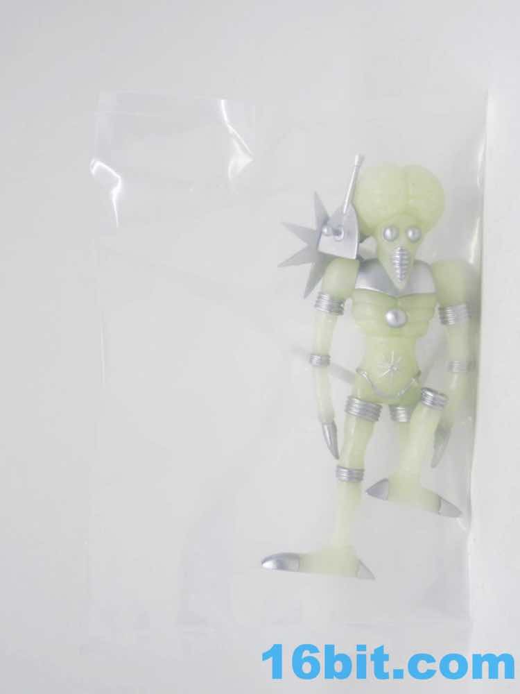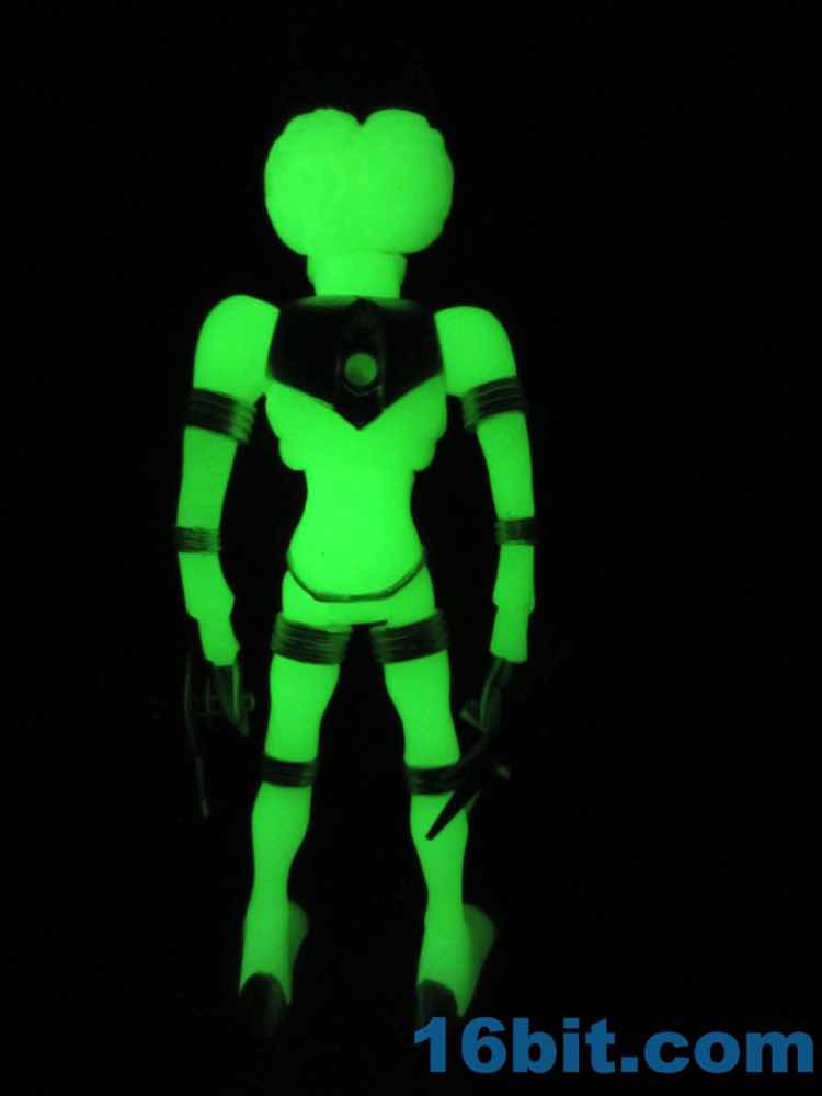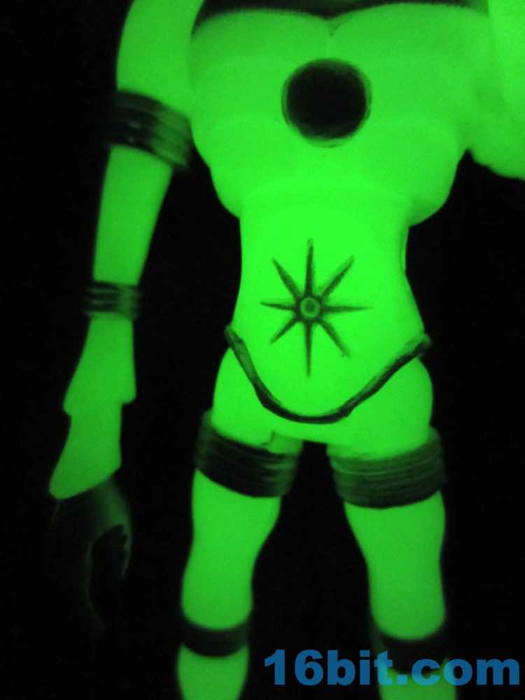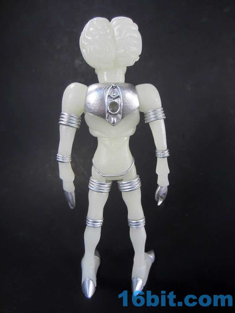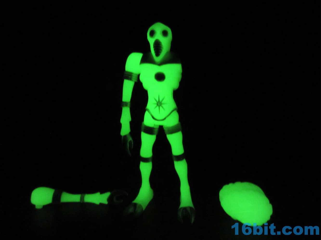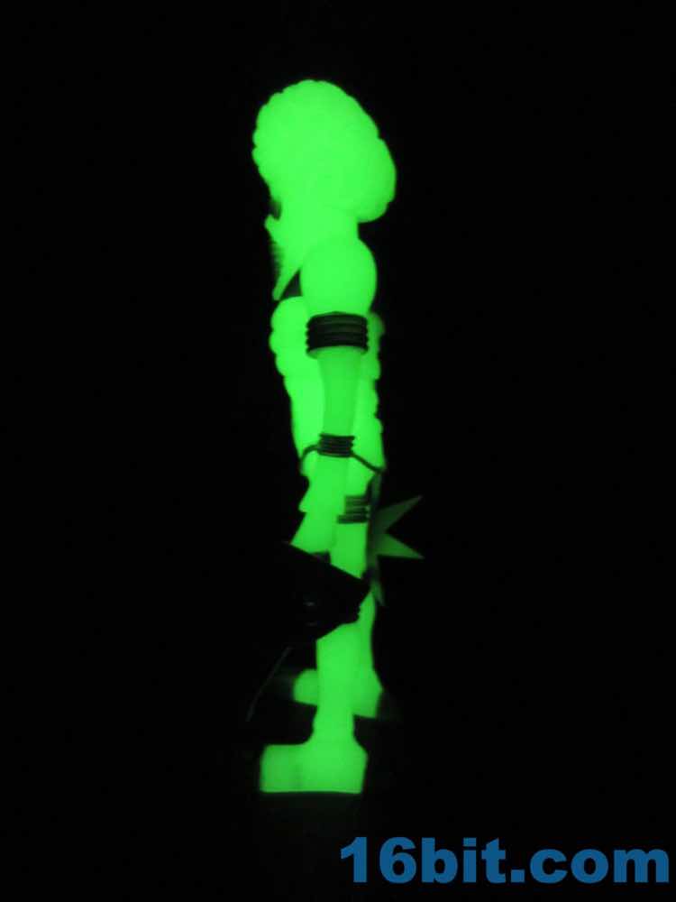 The larger figure is a lot like the previous versions. It's actually exactly like them, except for color - you get 16 plastic pieces you can pop apart, including his two weapons. The weapons are cast in clear colorless ABS plastic and painted silver - although some clear bits poke through - while the PVC is all glow, and matches the other Cosmic Radiation figures quite nicely. Silver highlights were added to the figure, which probably would have been just fine in unpainted glow plastic. Silver claws, joints, belts, and ornaments were added to make him pop - the silver chest really adds a lot to the figure, and I would not have expected it to make a big difference. The glow plastic is a wee bit translucent, so bringing the figure's body into the land of the tangible is a nice touch.
