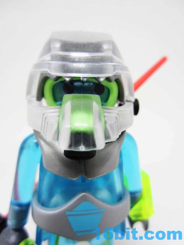 The figure is the same basic body you've seen a bajillion times, but more Space Warriory. The head is clear blue, with a green gas mask over it to give it an alien look. A hose connects the mask to the helmet, and a "bib" has two posts on it which allow you to hang hooks on the back which in turn can carry the figure's nifty weapons. It's a great use of old and I think new parts, especially the belt buckle. At first glance I thought it was inspired by Onell Design's many cool faction signs.... and then on closer observation, maybe it's a cup of soup. I'm not sure what they're going for, but it's a neat design and I'd wear it on a t-shirt.