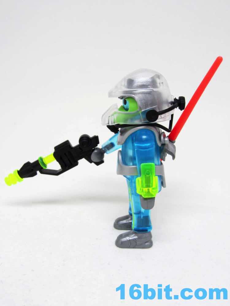 The figure's weapons are all pretty cool. A classic ray gun is molded in black with a green emitter, complete with 1960s-style discs at the end. Its clear green sheen lights up like the dickens under a black light. The warrior can grip it by the top, or hold the grip - I like the options, it's nice that he isn't required to be aiming it at somebody at all times. It can also mount on his back. Most surprising of all, to me, was a double-bladed red Darth Maul-style lightsaber. The hilt is different, but the whole thing is made of a fairly soft and flexible plastic which the figure has no problems gripping. As an added bonus, there's a clear green wrist communicator bracelet. This is a well-accessorized figure for the money, arguably as good or better than the blind bags.