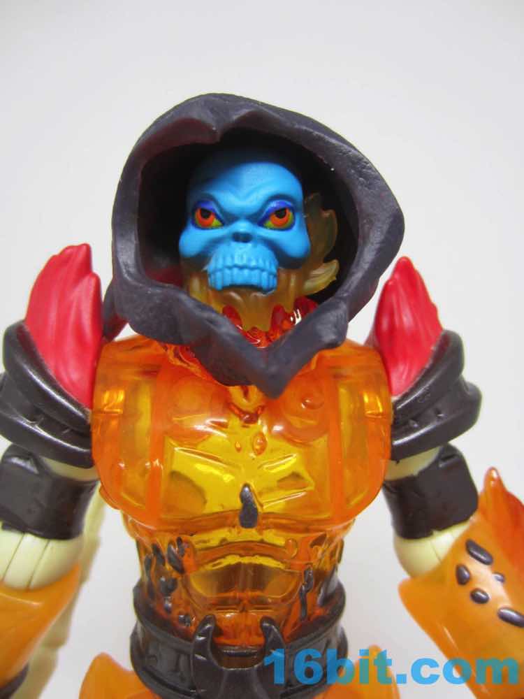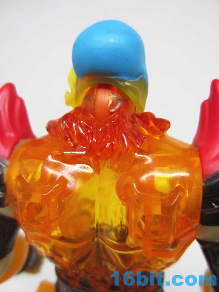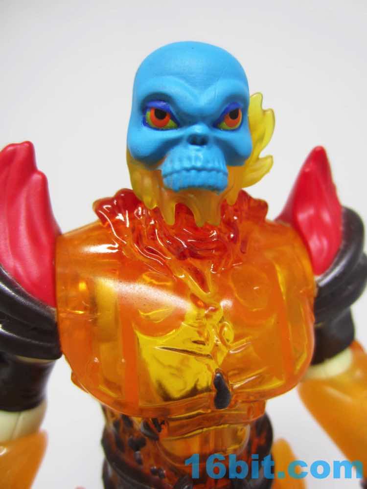 To make a 6-inch figure with loads of articulation for $10, you'd have to make a few shortcuts. As this would've sold for about that price in the USA, you'll notice that the legs are one big hollow piece, and the wrists are articulated near the elbow. You jet just over a dozen points of articulation, with the lower arms, head, and legs being removable. The clear orange chest is really striking, especially if you have a light behind it - setting the flames against the bony upper arms Now the blue skull... OK, I don't understand why it's blue. It pops nicely behind the removable hood, which seems to fit over the body just fine even if you lose the noggin. The blue skull is surrounded by flames that look something like a beard - I don't know if that was intentional or not, but it certainly gives the monster of a character a weird, olde thyme feel.