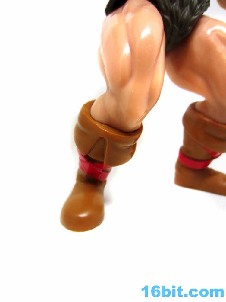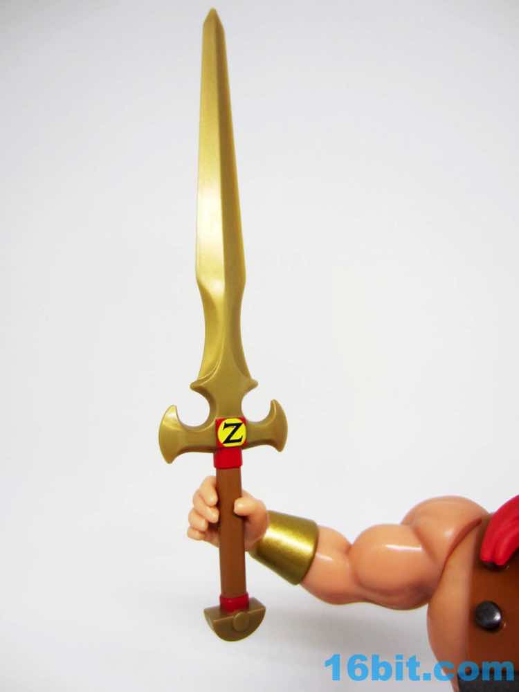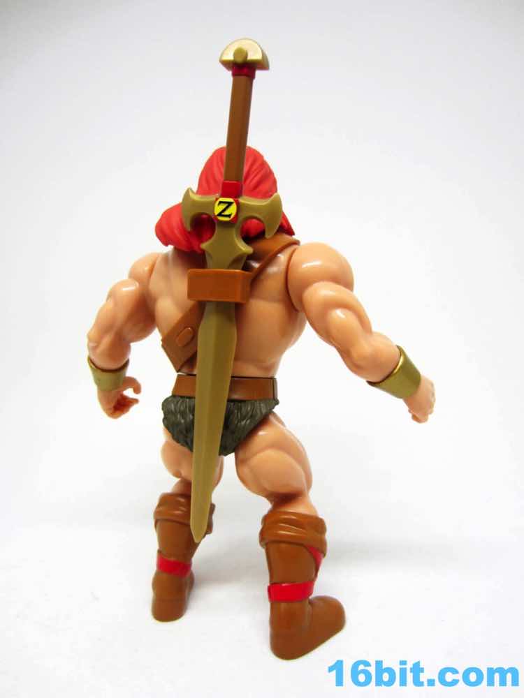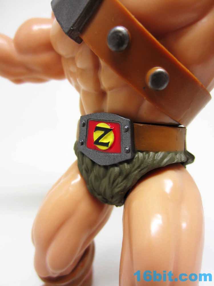 Deco is arguably better than it should be. The head is pure 1980s simplicity with black dots for eyes, white teeth, and some of the best scruff I've seen on an action figure in recent memory. (I'm just coming off a bunch of disappointing Hasbro Cassian Andor beards.) It's obviously not a vintage Mattel toy, but it certainly looks enough like one to make the grade. The real surprises in deco are his belt buckle and sword hilt - the sword is painted in yellow, red, and brown with a black "Z". This is a radical departure from most vintage figure weapons, which were completely unpainted. Similarly, his furry briefs have a matching "Z" symbol in a box that looks a little like a TV set. It's yellow surrounded by red, set in a large silver buckle. The furry shorts are brown, and the belt is a different brown. He has those retro strange boots and a complimentary set of gold, smooth, and completely boring-looking bracelets. Fans of the original He-Man cartoon will no doubt recall that the title character had similar accessories - but the toy was a bit more ornate in this regard. (Blame the perils of animation budgeting.) The look is, unquestionably, there.