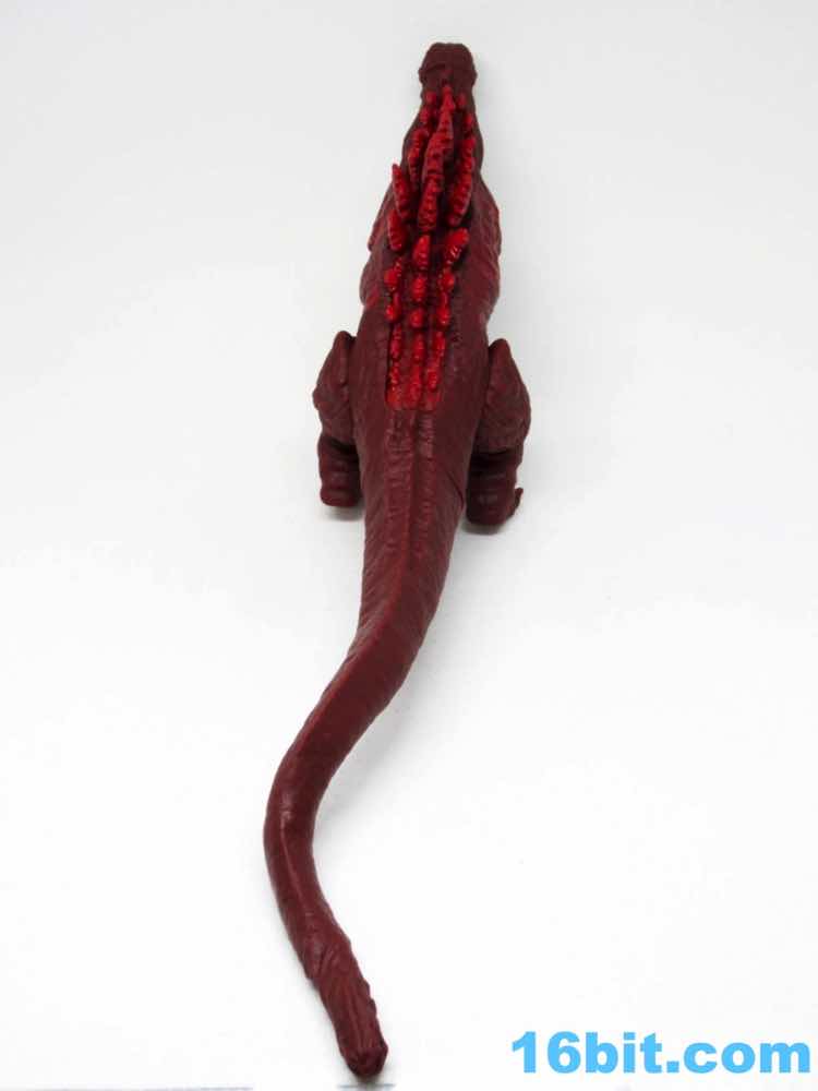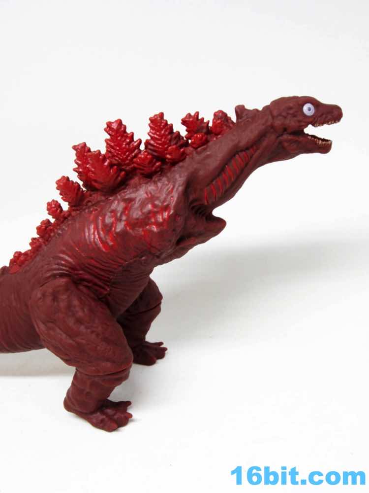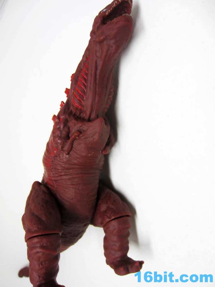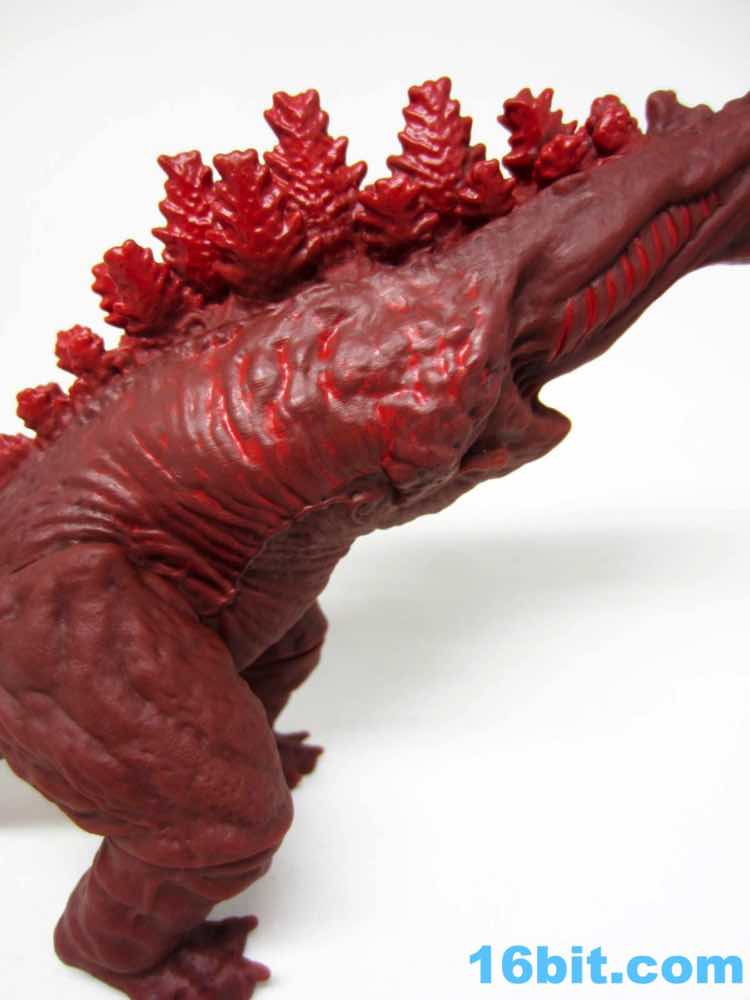From tip to tip, the creature measures about 13 inches in length. The dark red vinyl has some lighter red highlights with dark yellow teeth and bright, wide circular eyes that are easily the most creepy I've seen on a kaiju toy in some time. The hollow vinyl figure looks fantastic with great detailing, from his evolving gills to the classic back fins to the questionable role of the tail - which you'll see in the movie when you see the movie. Since it came from the creators of Attack on Titan, you can see the design influences on the classic movie monster. They made it their own, and unless they use this as the new default design it will really stand out on a shelf that's a sea of green vinyl lizards that breathe fire.