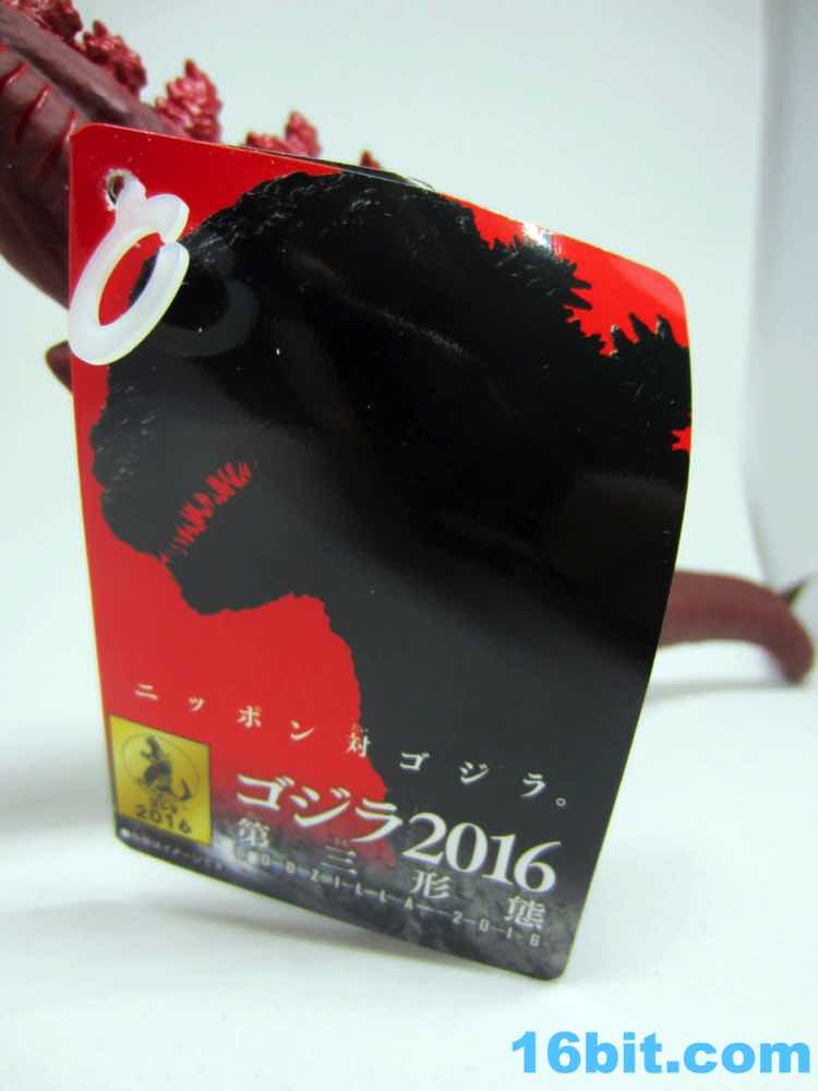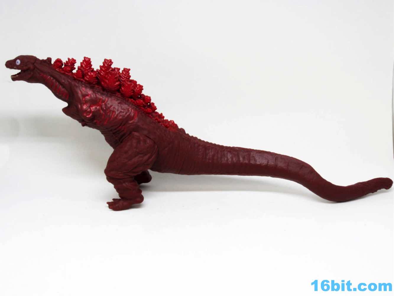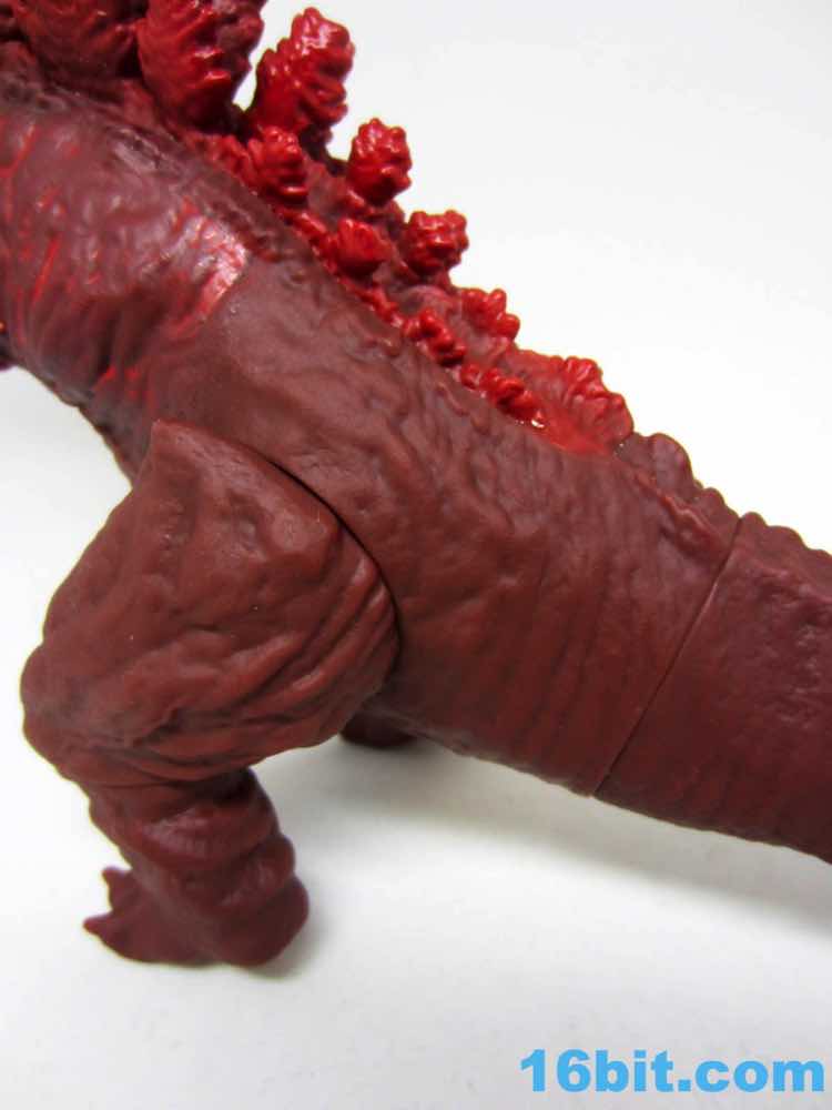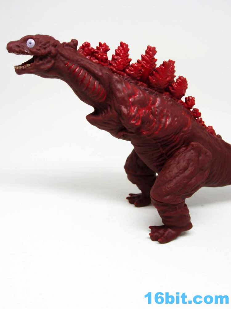 From tip to tip, the creature measures about 13 inches in length. The dark red vinyl has some lighter red highlights with dark yellow teeth and bright, wide circular eyes that are easily the most creepy I've seen on a kaiju toy in some time. The hollow vinyl figure looks fantastic with great detailing, from his evolving gills to the classic back fins to the questionable role of the tail - which you'll see in the movie when you see the movie. Since it came from the creators of Attack on Titan, you can see the design influences on the classic movie monster. They made it their own, and unless they use this as the new default design it will really stand out on a shelf that's a sea of green vinyl lizards that breathe fire.