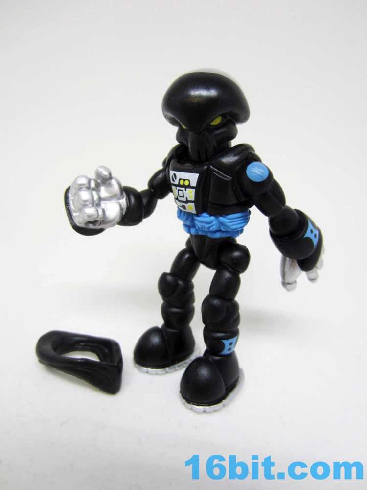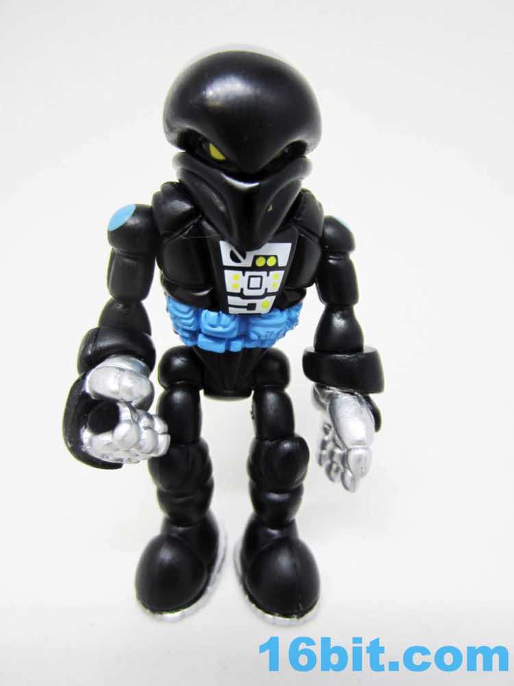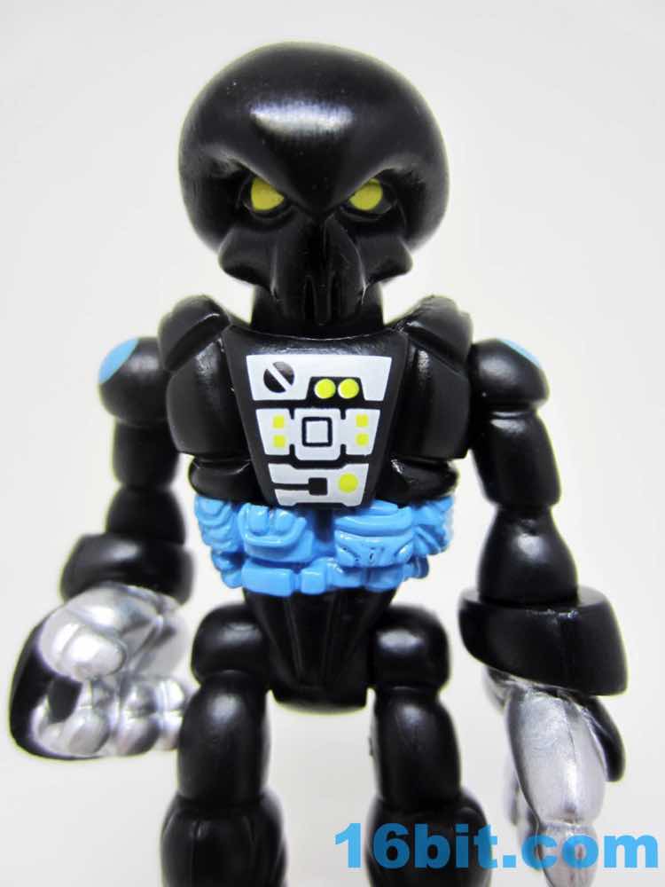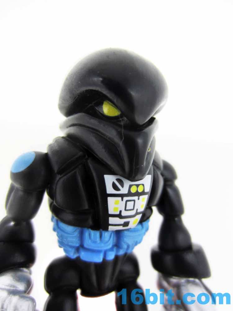 Molded in black, Pheyden takes on new personality when given bright yellow eyes. A silver stripe on top of his head recalls the motorcycle helmet's visor on Clawtron, as that Fisher-Price Adventure People figure was basically some dude molded in black with claw arms. The blue markings and belt are very similar to the original Clawtron toy, and the ornate white box on his chest is a remix of the pattern from that classic 1980 action figure.
