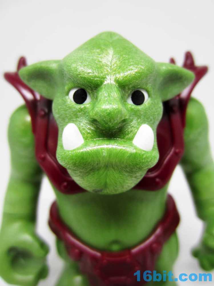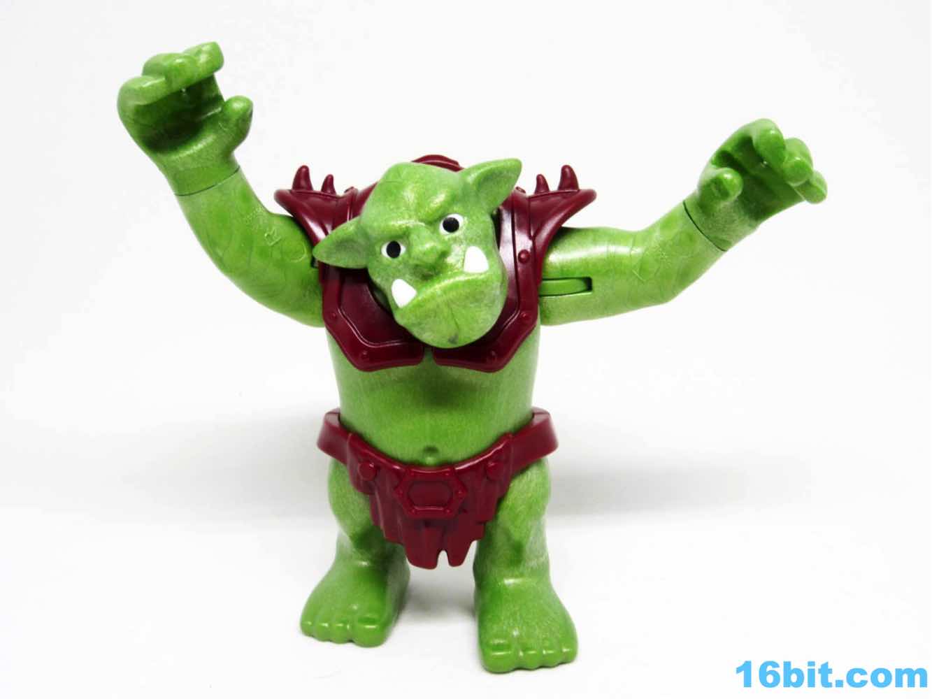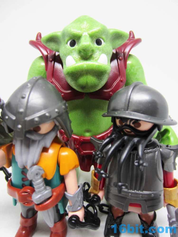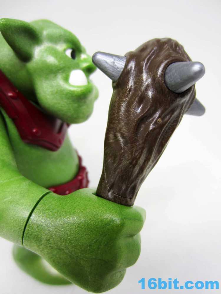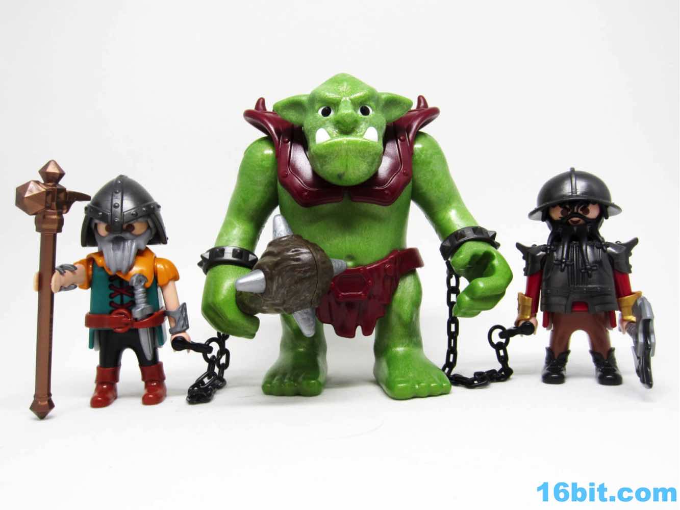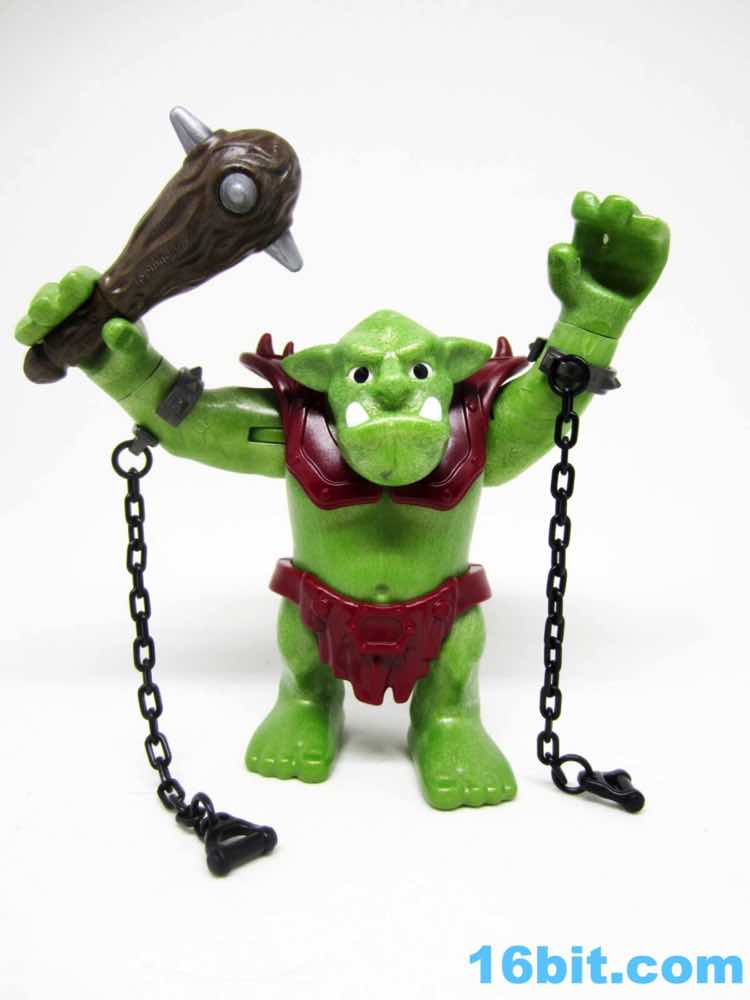 The big guy is made of this interesting green plastic that's light and, in the face, a little soft on details. The color is a little mossy, with light and dark greens intermingling to look a bit more alive than the normal flat greens we see in other toys. Its teeth and eyes are painted, but little else is decorated. The vest is a separately molded piece, and the optional manacles are a nice touch complete with plastic chain links. Each one has a grip so the dwarves can hold on for dear life.