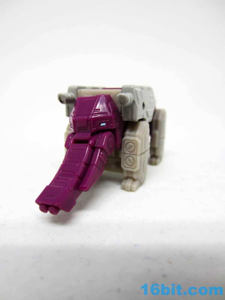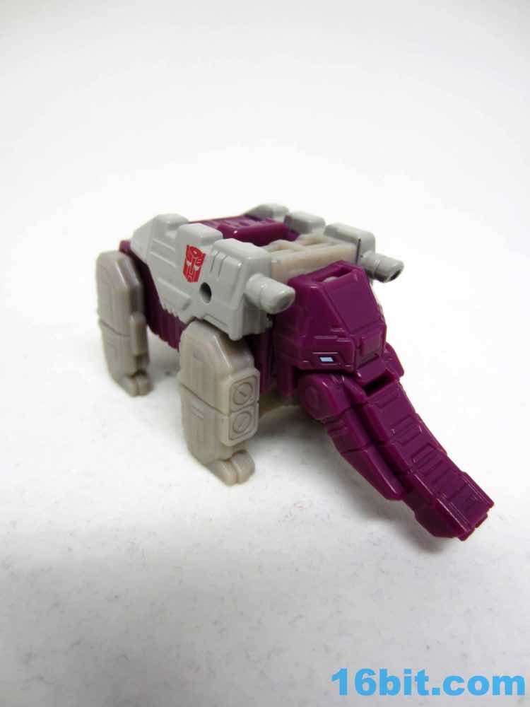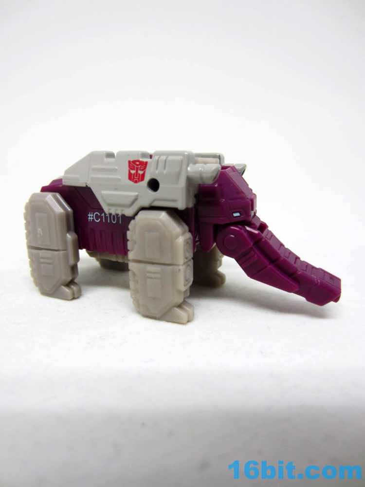 The elephant mode is cute, but not as cute as the G1 original. The new toy has smaller eyes and ears, making it just a tiny bit less cute - and when we're talking robot animals, cute counts. He has no problems standing upright, and the Shuffler head can be stored in the belly. If you opt to not store him inside, or lose him, the toy loses none of its visual appeal or structural integrity. In short, it's a good design.