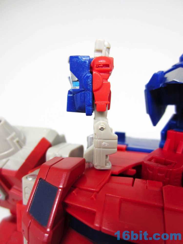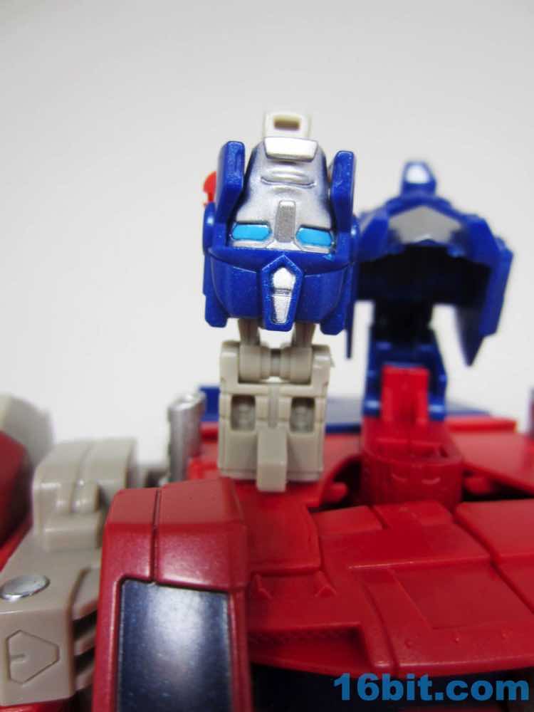 This 1.5-inch robot Titan Master Autobot Apex is not Hi-Q, because trademark law says he isn't. The colors don't match the original Hi-Q, but you can see there are some similarities. He has 5 points of articulation and virtually no paint. The Optimus face on his back has silver and blue, though, but much of that will be covered up completely when you plug it in to the full-size Leader Robot mode. The big giant helmet covers almost the whole thing, and you can swap out Apex for Loudmouth to give the helmet the red eyes that more closely match the original vintag-era G1 Powermaster Optimus Prime toy.