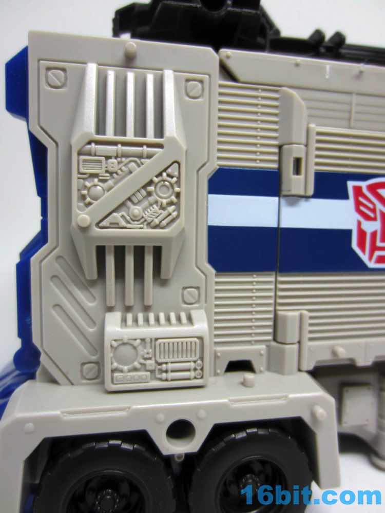 The truck ain't bad - the cab is clearly drawn from the same sources as Ultra Magnus, but it's a new sculpt and a new mold with new parts and engineering. The helmet from Optimus' robot mode rotates down and tucks in nicely, forming a driver's seat for Autobot Apex inside the vehicle. The figure's shins fold down as ramps on the back of the truck, opening space to store Legends-class Autobot cars if you're so inclined. The wheels roll nicely and the panels all tab together perfectly. I usually expect more instability in my larger toys, but I was surprised to see this one just clicked. I mean that - the panels have little tabs and there's a very satisfying noise when getting it in the right mode.