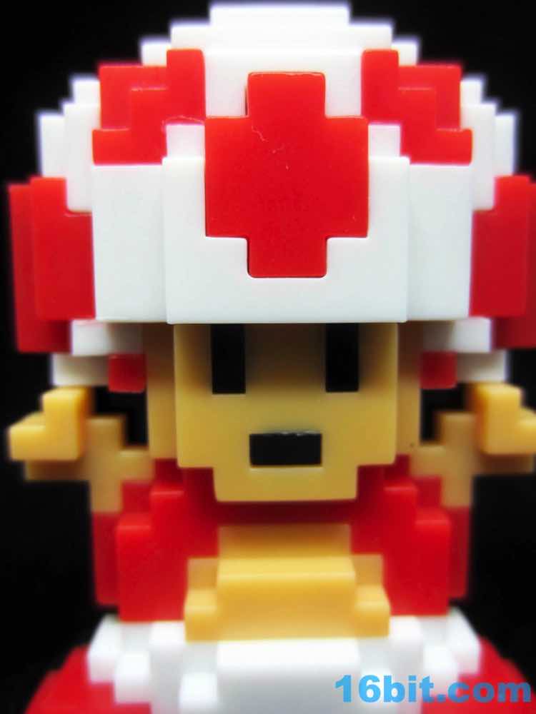 The design (minus the dimension) is a perfect recreation from the original Super Mario Bros. game, with blocky eyes and mouth set above a vest and flailing arms. The character had no animation in the original NES game, so it just standing there means that Jakks perfectly recreated everything you saw Toad do. Which is to say, not much.