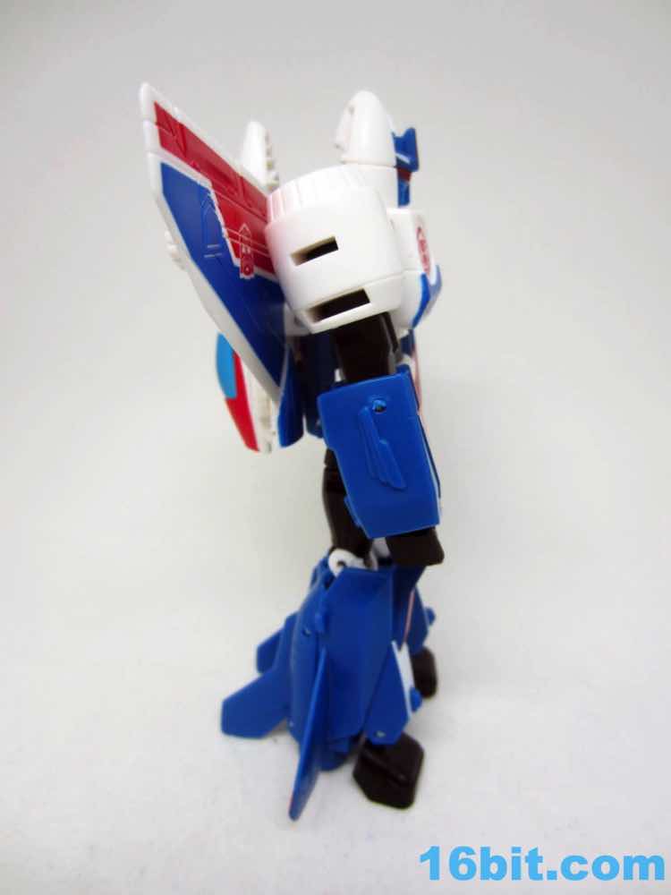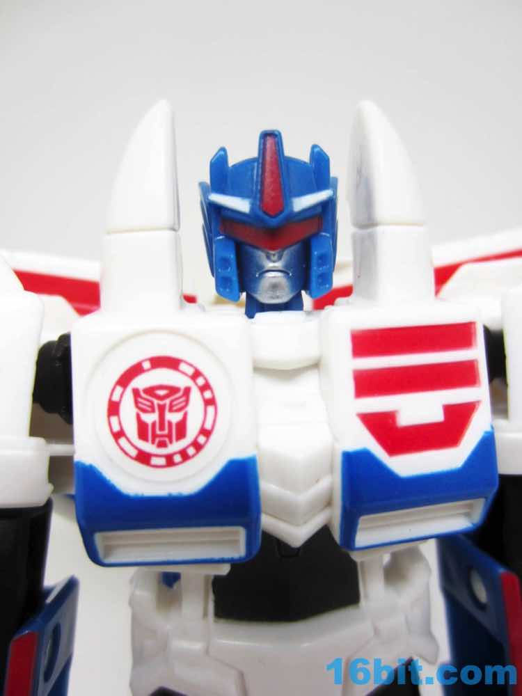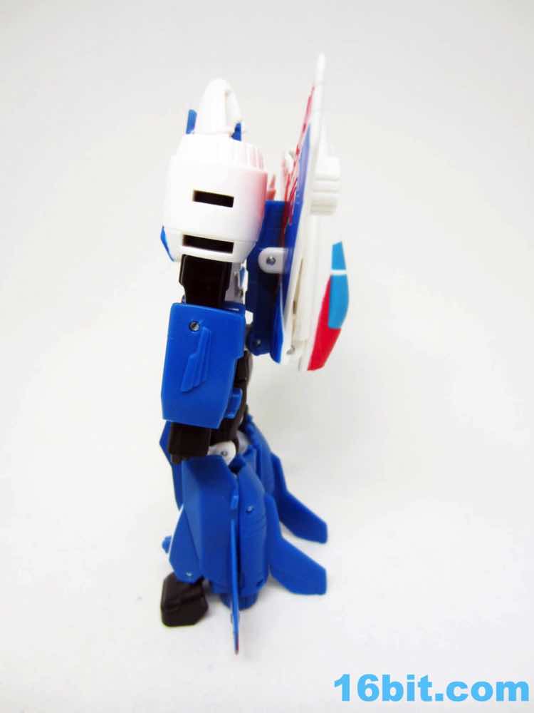 The jet deco is amazing, while the jet mode itself is adequate. It's just like the Combiner Wars planes, where you've got a decent flying vehicle with robot kibble underneath. Aside from multiple places to mount weapons, the jet has articulated landing gear under the seating area. What I love about it most, though, is how the paint works with the sculpting. White plastic on the wings is left unpainted in spots, giving the toy a higher level of detail than I would have expected for the price. Autobot symbols are painted nicely, plus there are little sculpted grooves which I assume will be where the symbols go on the Japanese release. Sure, it's got a big blue butt, but the jet is pretty nice when taken as a whole.