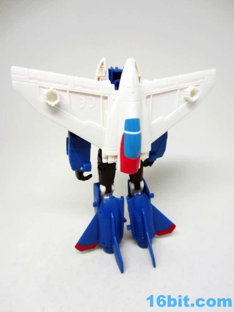 Transformation isn't a stretch - the robot shins open to engulf the thighs. The fists fold in. The arms and legs all have pegs and tabs to fit in position. The nosecone unfolds from the wings, and they all cover the back. It's simple, and it works well. This is what I want as an increasingly cranky toy fan.