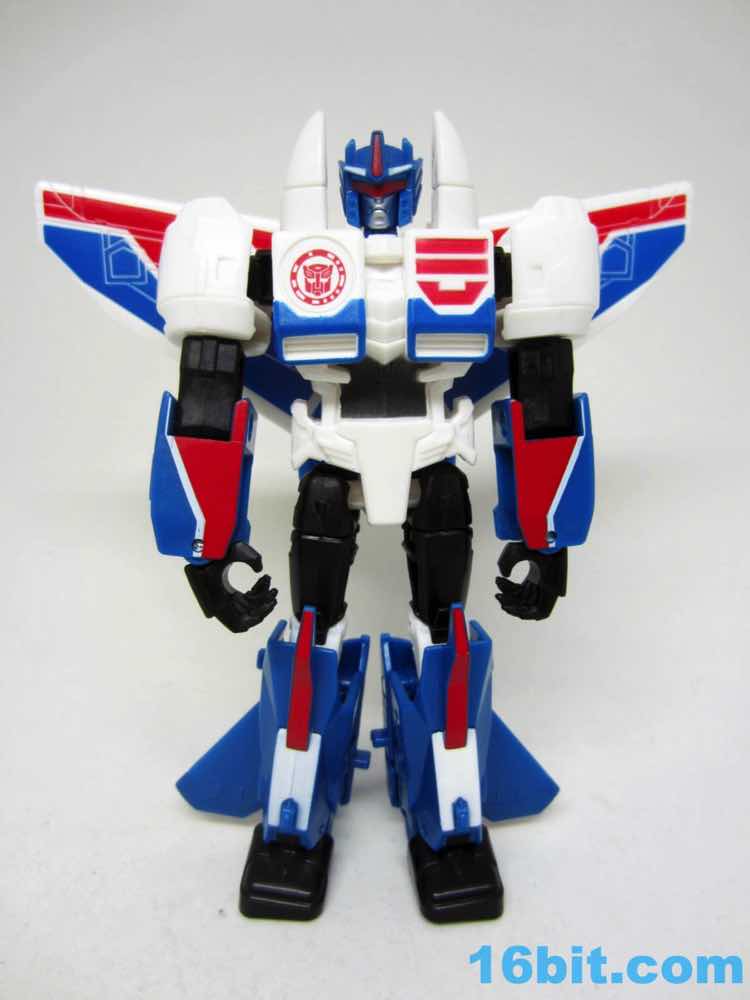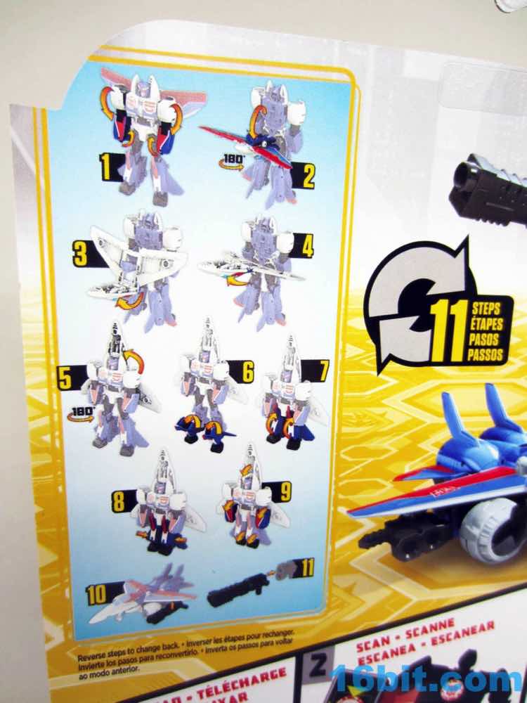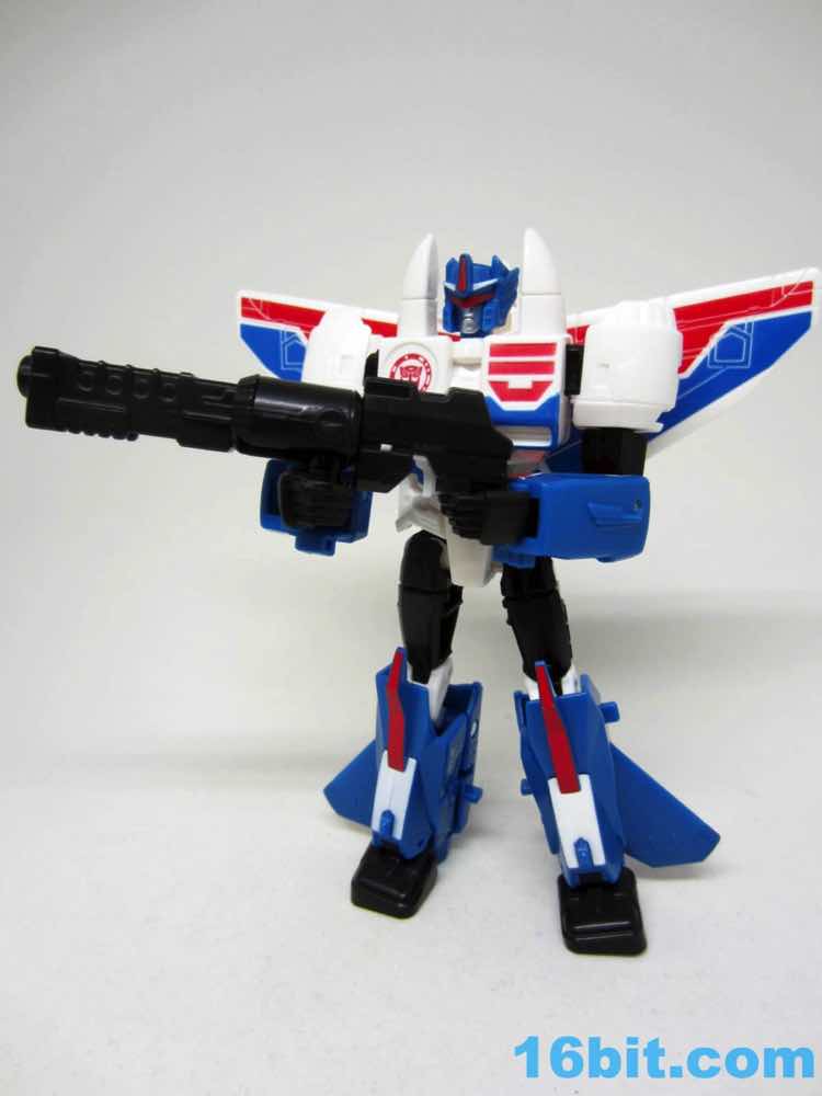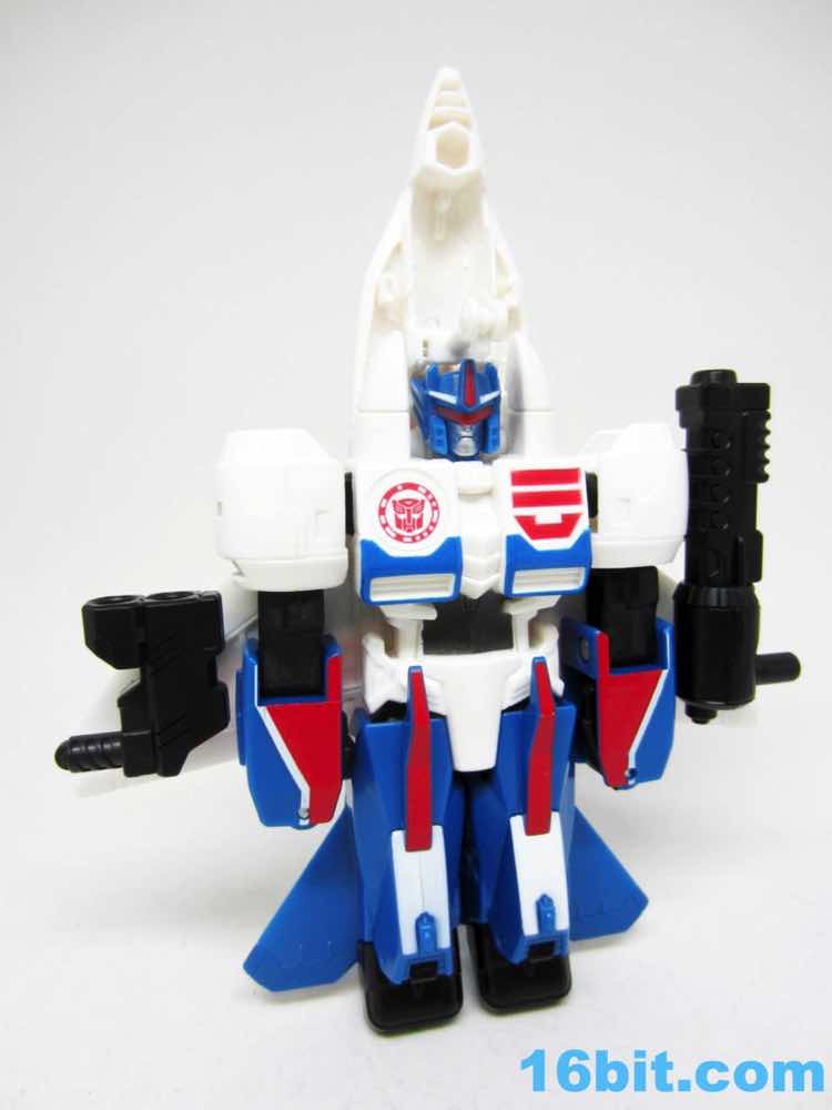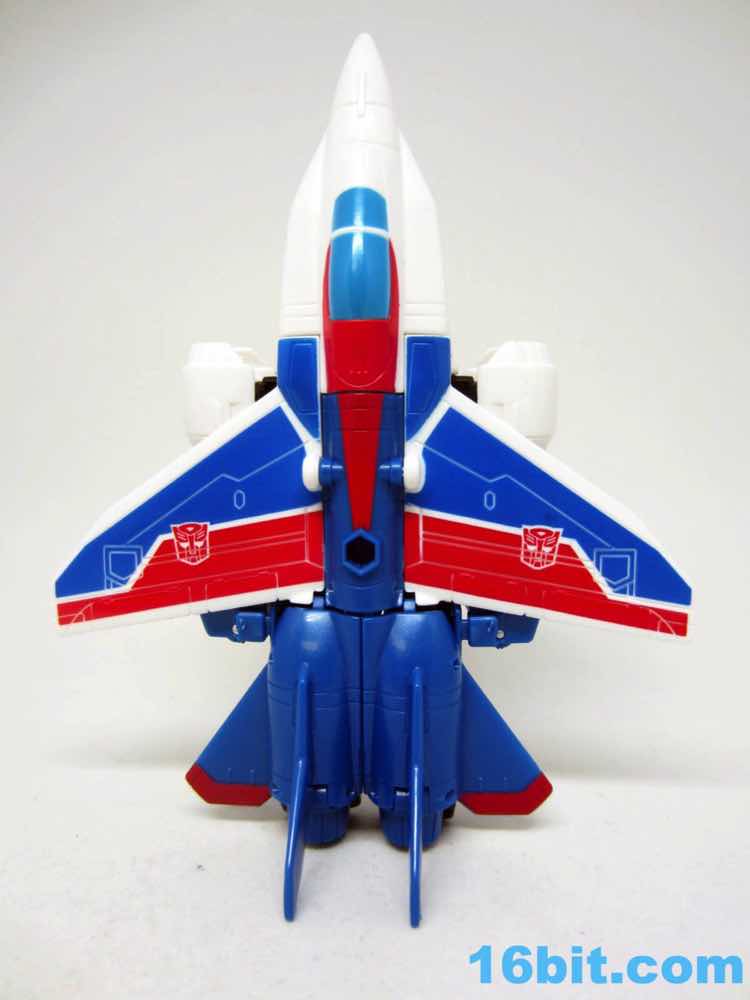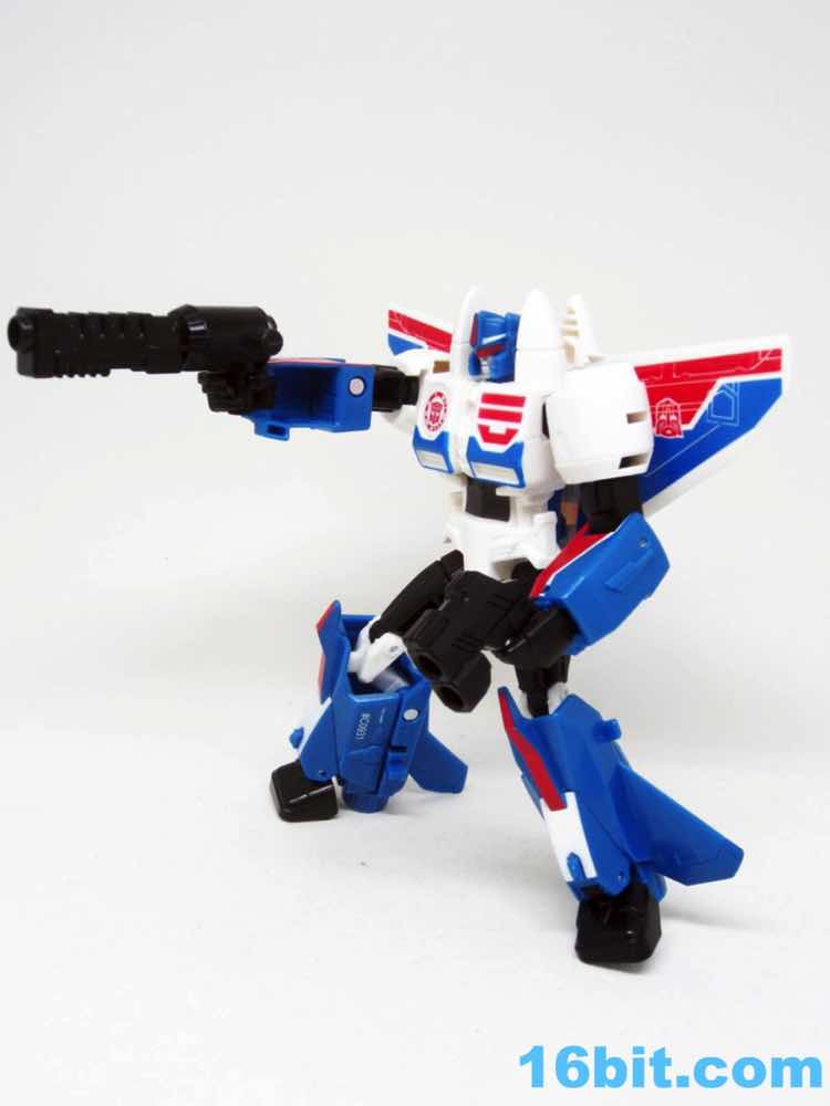 This is a good one. If you liked the jets in Combiner Wars, you'll probably dig Stormshot. Some of the concessions needed to service the combiner modes are long gone, but the transformation is basically the same as those guys - with a vestigial chest cavity that hints at the peg below the breast. With a fancy red, white, and blue color scheme this Decepticon Seeker-esque figure is a slam dunk.