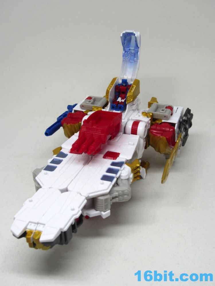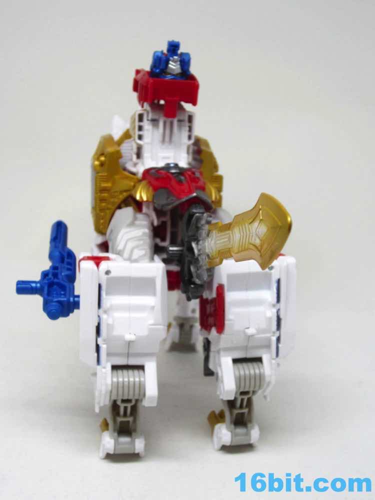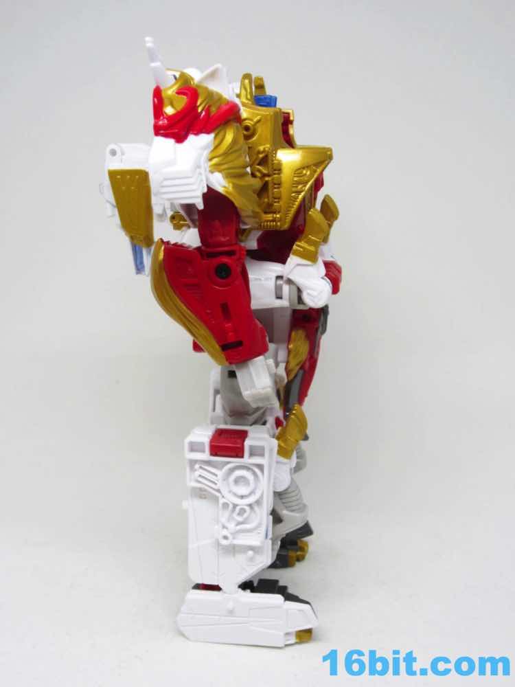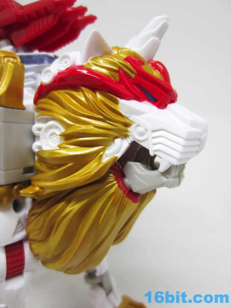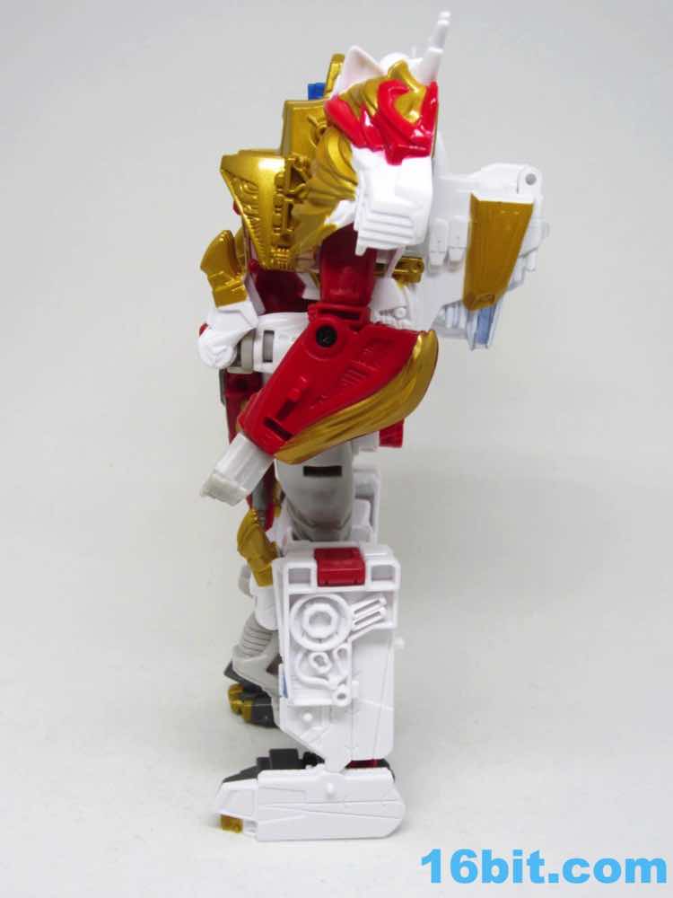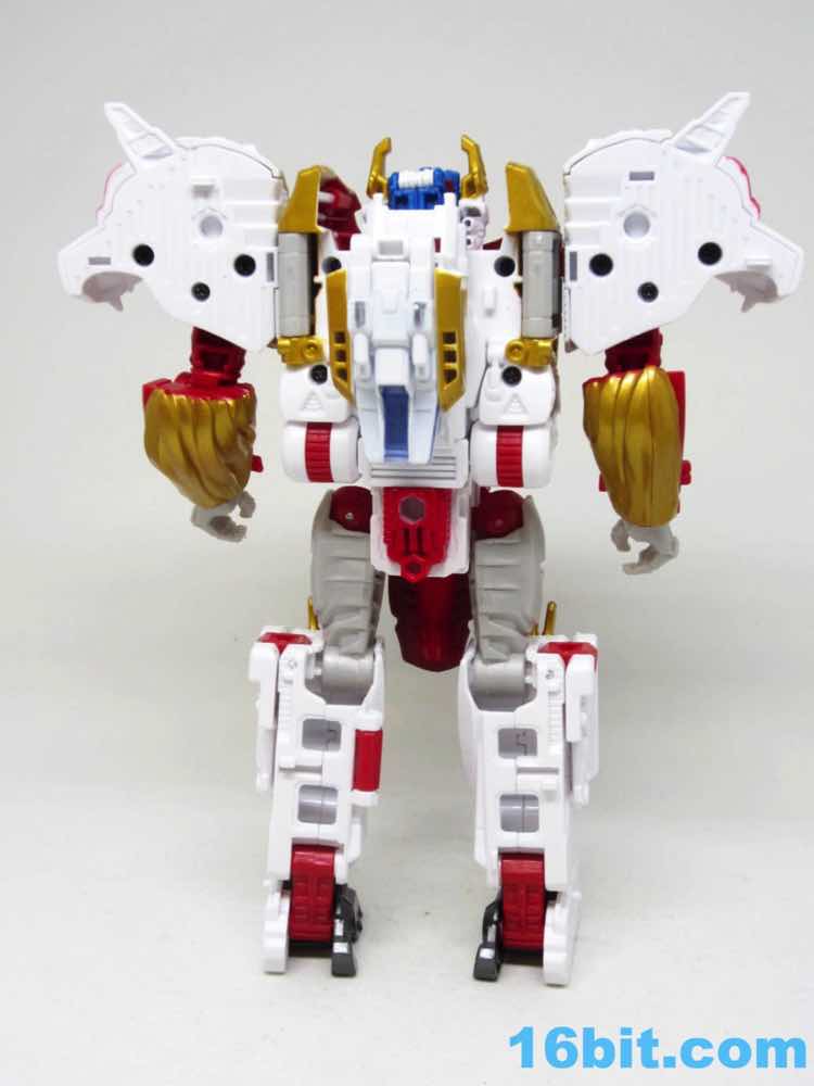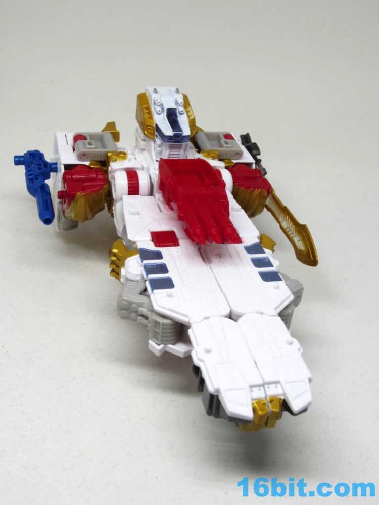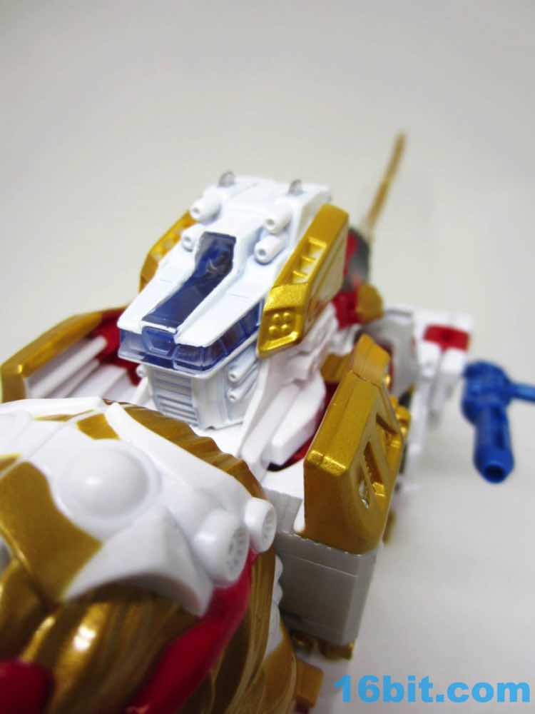 The original Lio Convoy toy - and most other Lio Convoy toys - had a furry-sculpted lion as an organic beast mode, as opposed to this Leo Prime which has hints at hair but is ultimately a mechanical jungle cat. The toy is cast in mostly white and red plastic with a gold mane and incredibly awkward jaw-as-hands. Seriously, his lower teeth are fists - but the mane is the back of his forearms. The beast mode looks sort of brickly, and that's because there is minimal articulation. It's a beast forged from robot and spaceship pieces, which is sort of clever and sort of wonky. Triple changer toys are always a little strange because generally one - if not two - of the modes require a generous application of your imagination to accept them for what you see. I can get behind a robot space lion in a red mask with a unicorn's horn, but the hind legs don't really feel a heck of a lot like good legs.