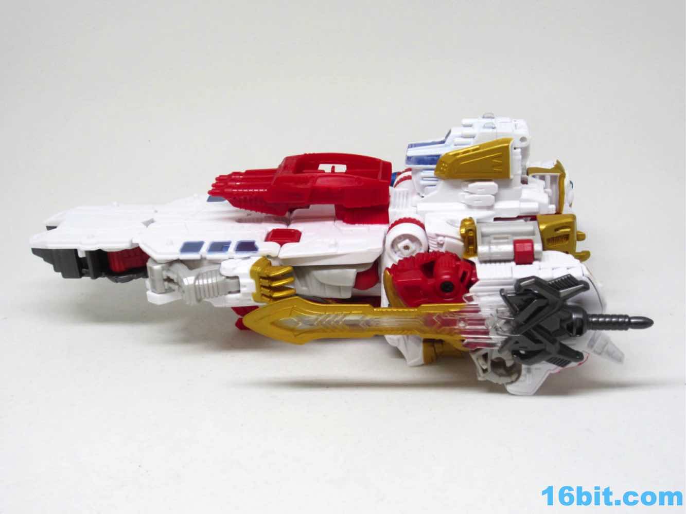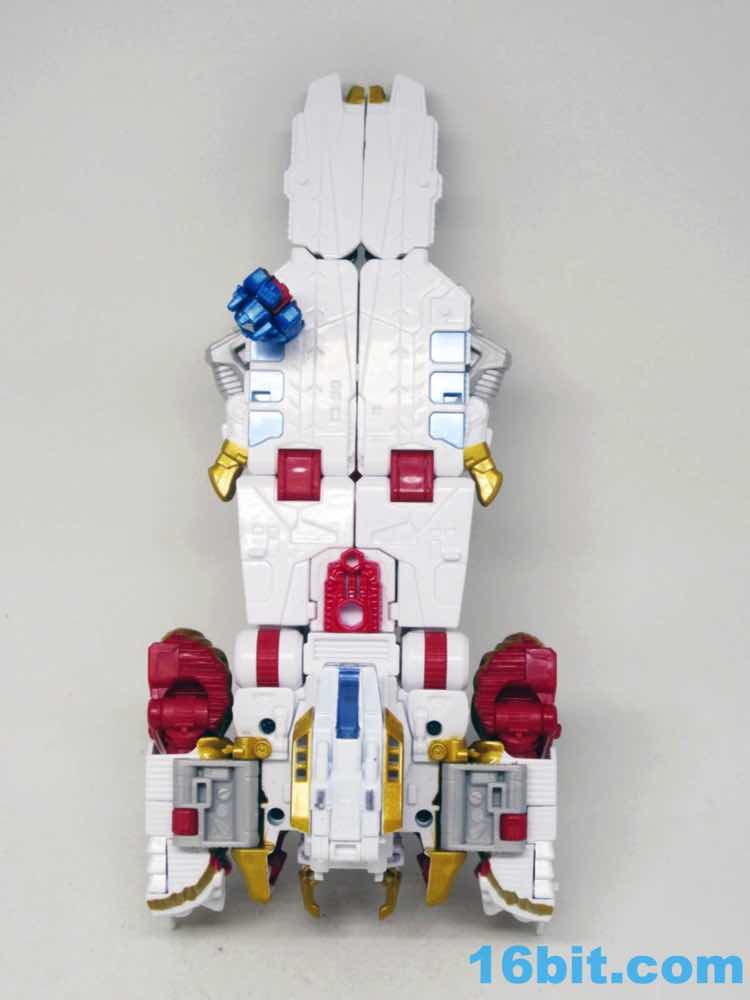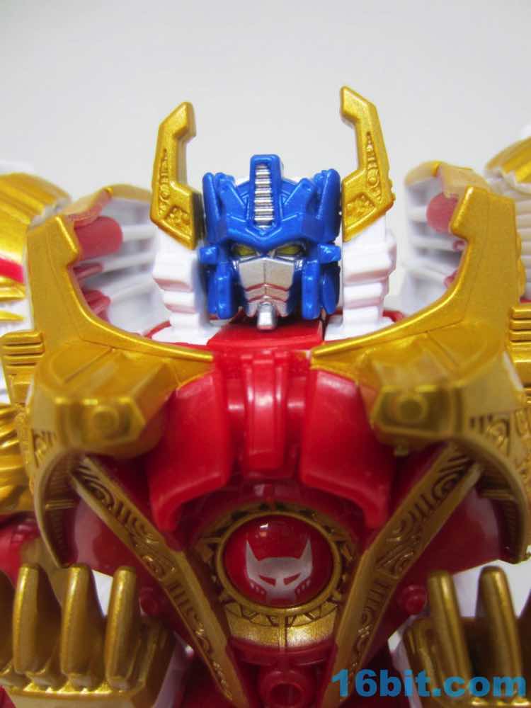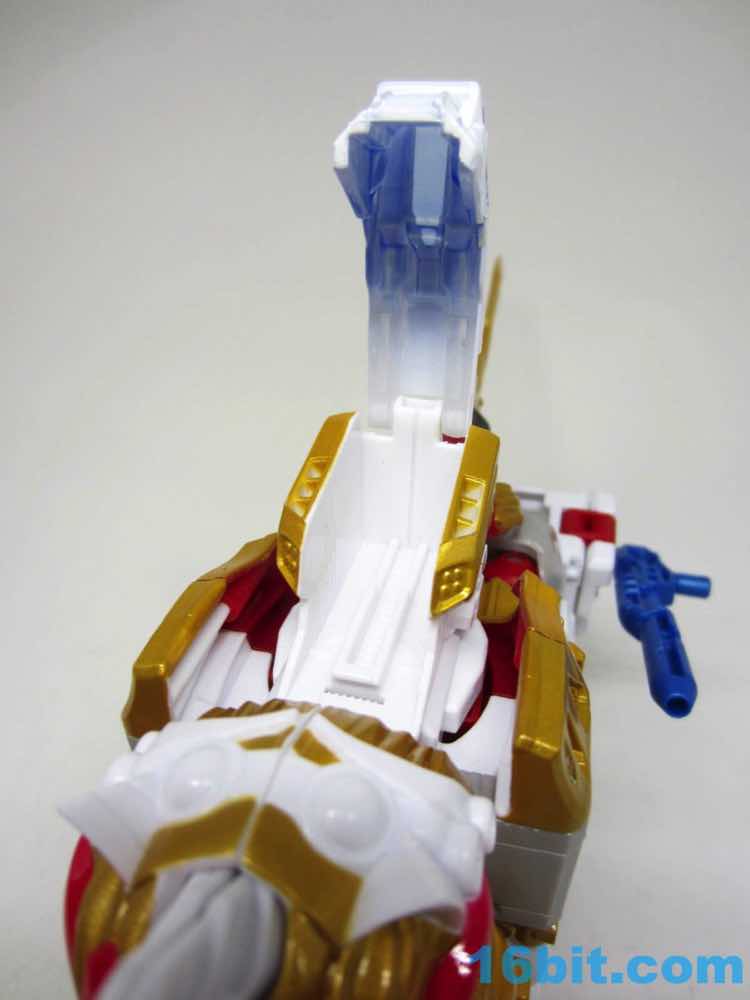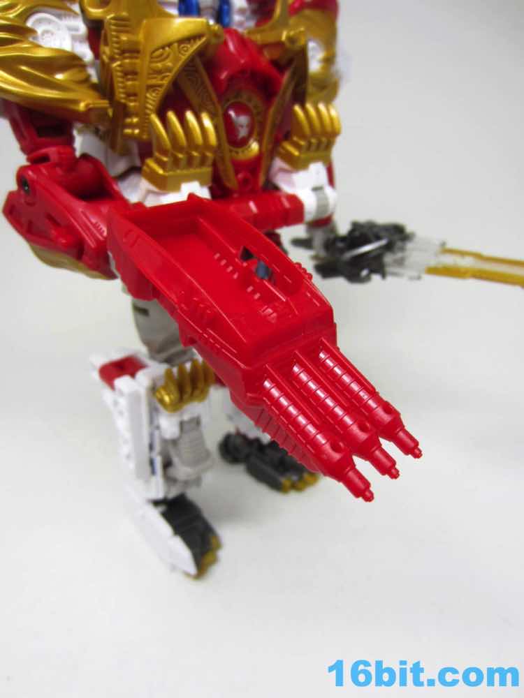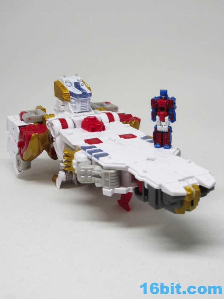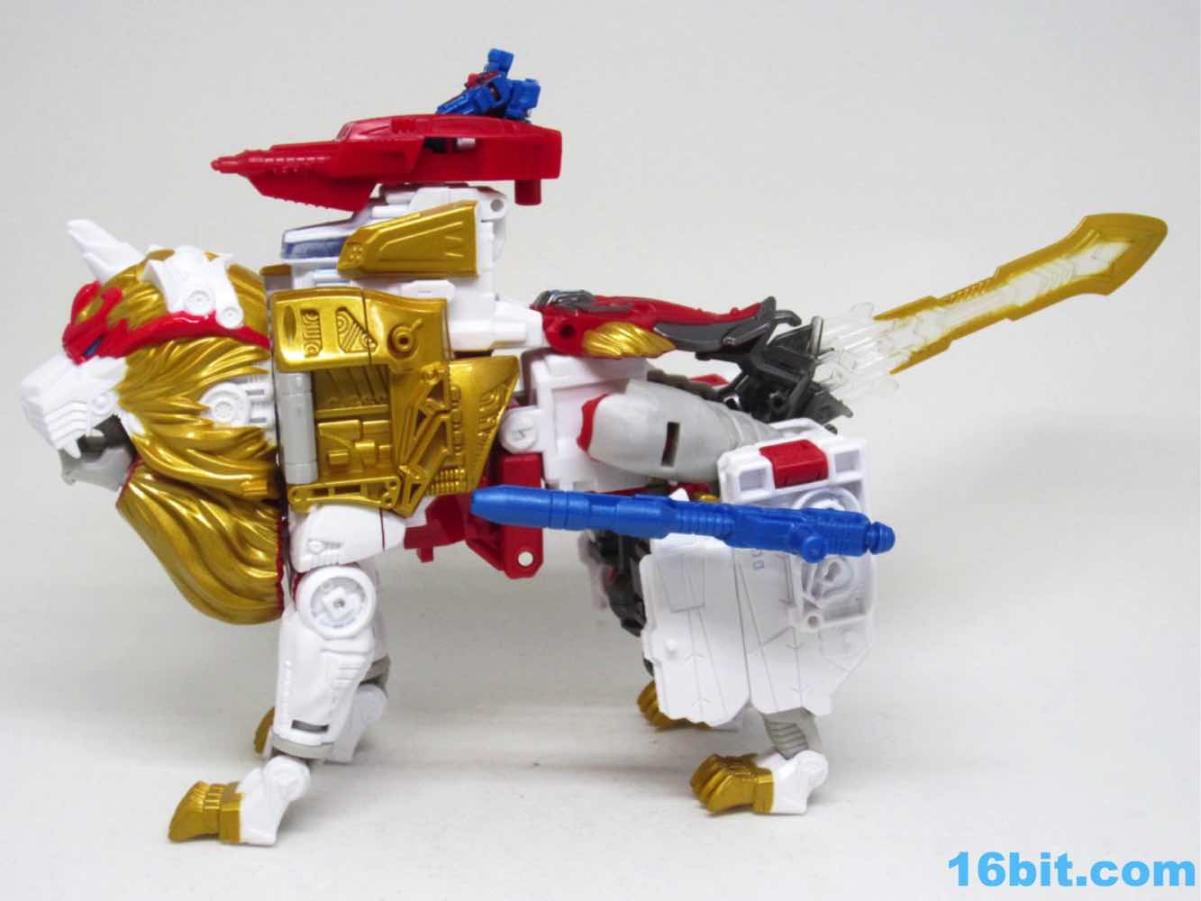 The original Lio Convoy toy - and most other Lio Convoy toys - had a furry-sculpted lion as an organic beast mode, as opposed to this Leo Prime which has hints at hair but is ultimately a mechanical jungle cat. The toy is cast in mostly white and red plastic with a gold mane and incredibly awkward jaw-as-hands. Seriously, his lower teeth are fists - but the mane is the back of his forearms. The beast mode looks sort of brickly, and that's because there is minimal articulation. It's a beast forged from robot and spaceship pieces, which is sort of clever and sort of wonky. Triple changer toys are always a little strange because generally one - if not two - of the modes require a generous application of your imagination to accept them for what you see. I can get behind a robot space lion in a red mask with a unicorn's horn, but the hind legs don't really feel a heck of a lot like good legs.