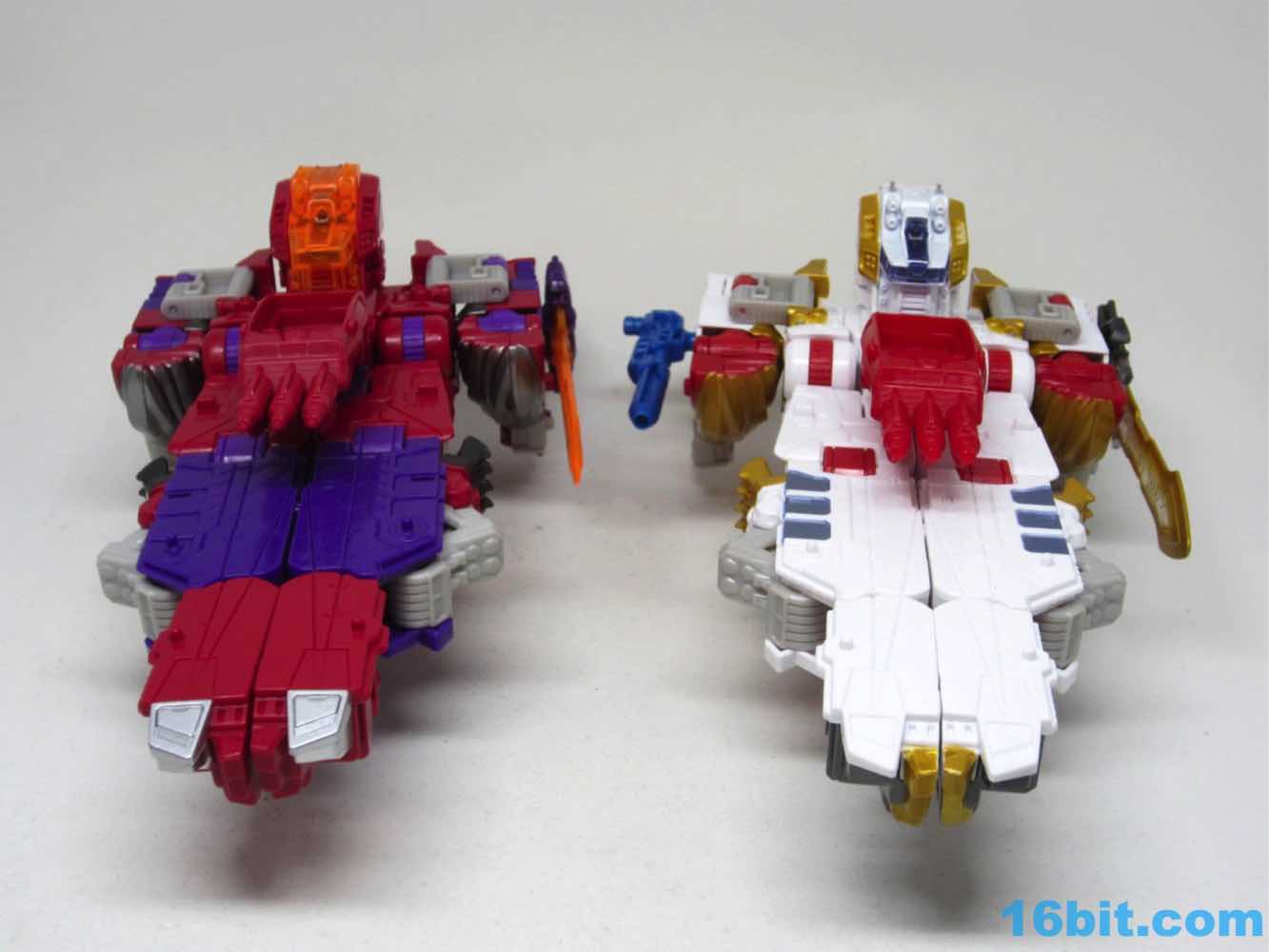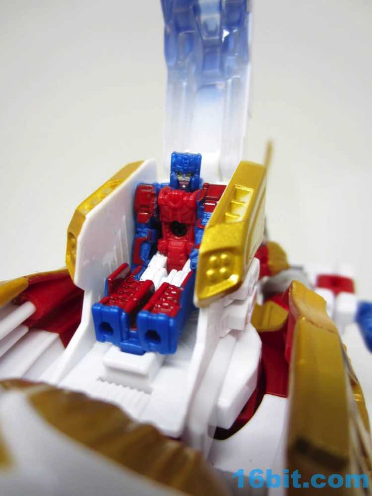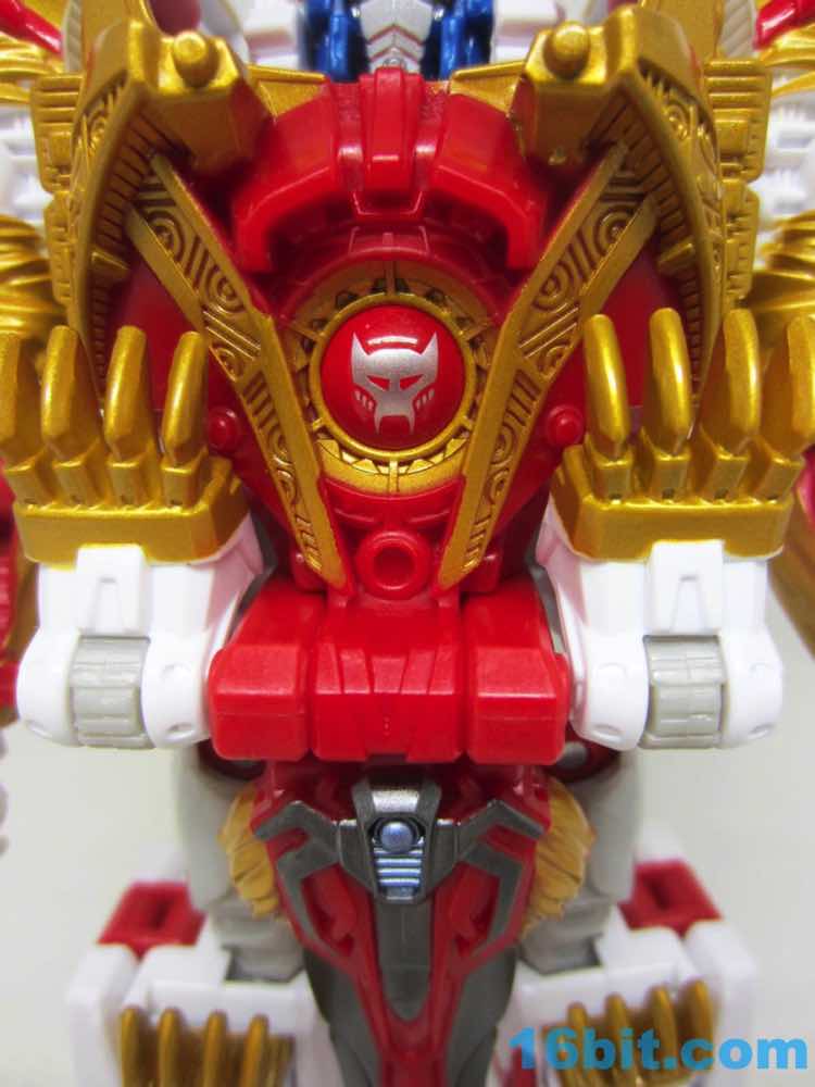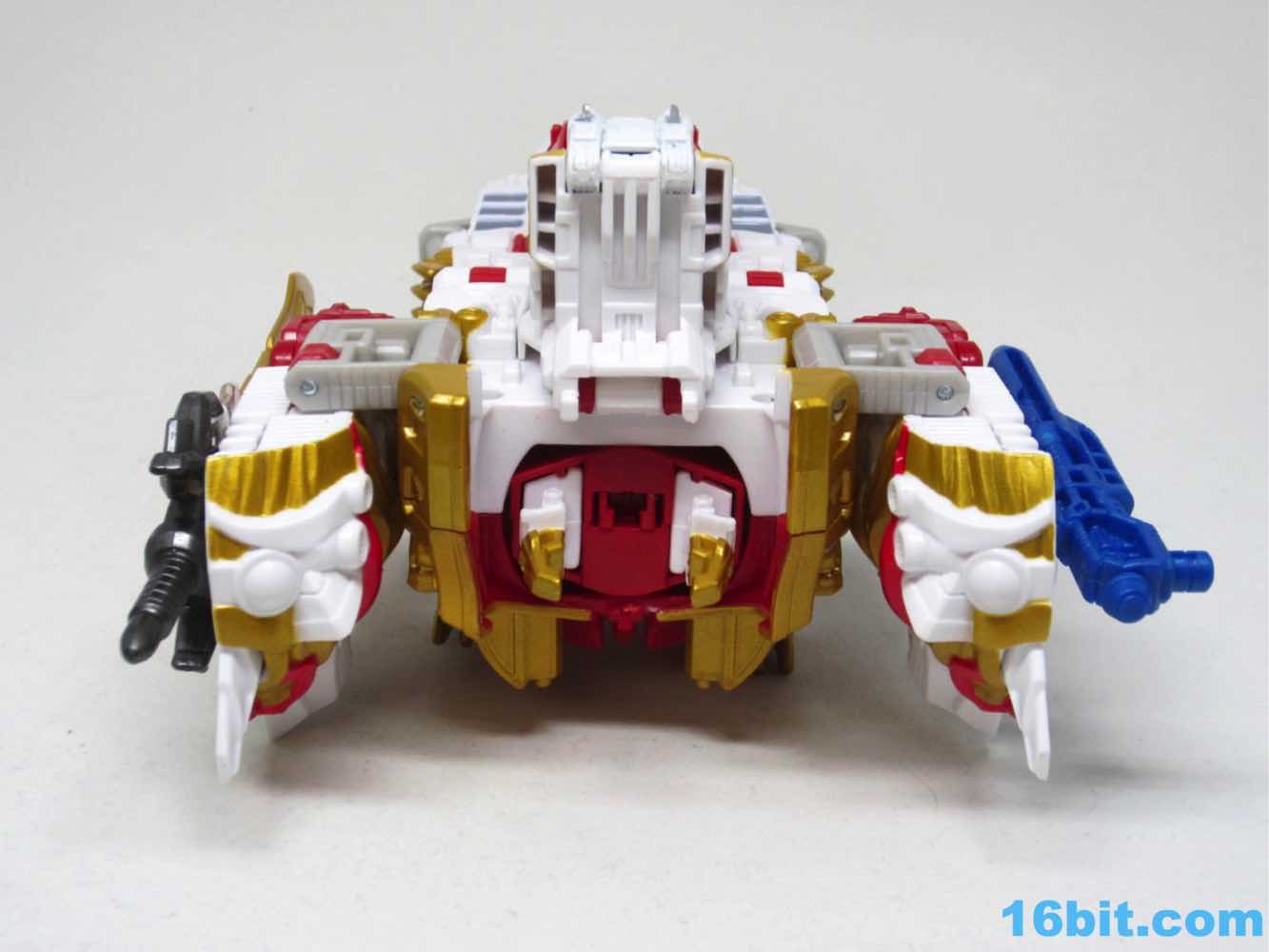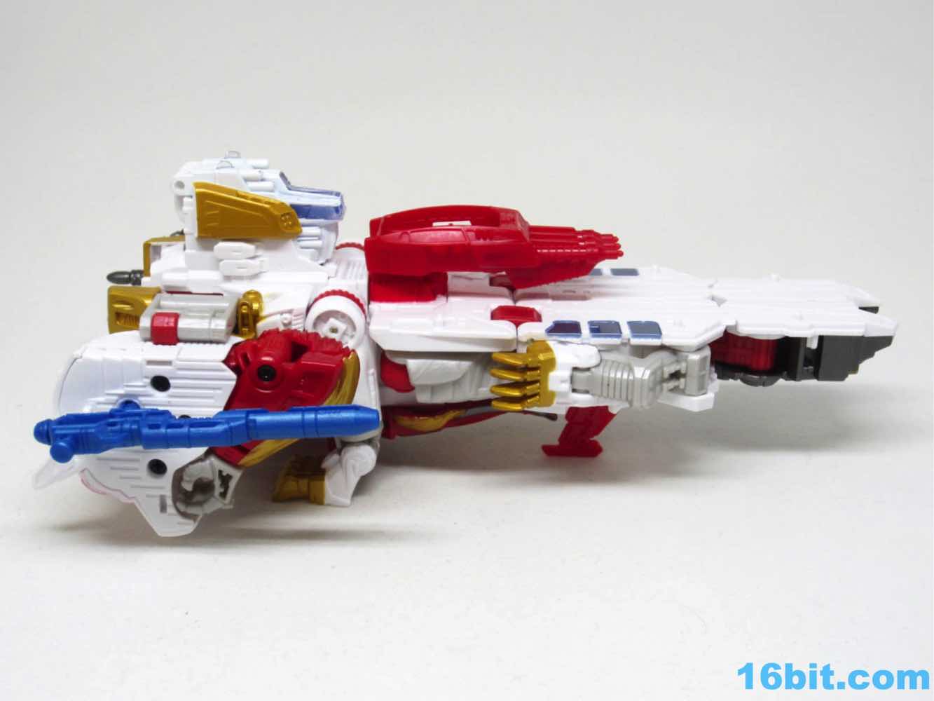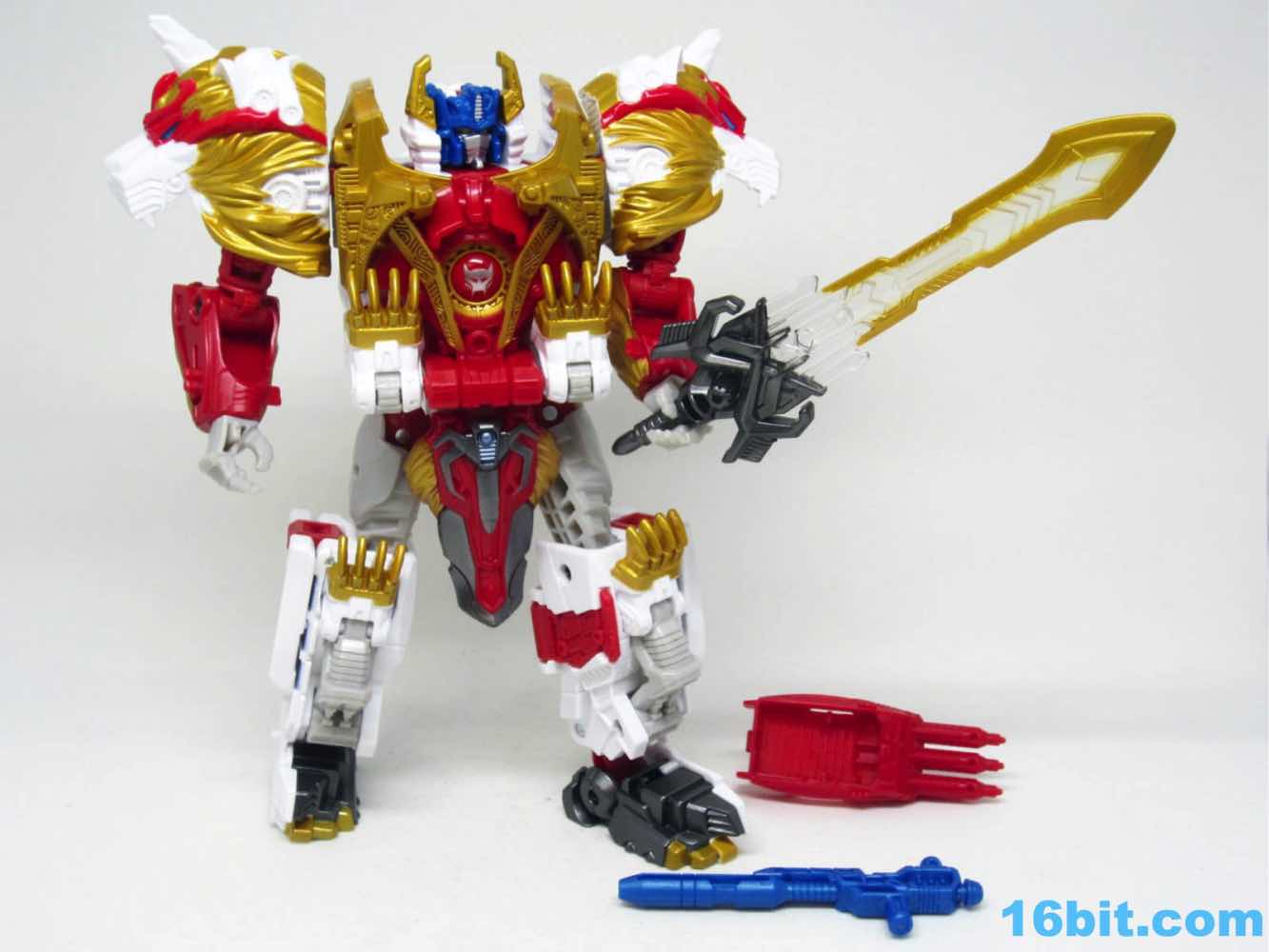 The original Lio Convoy toy - and most other Lio Convoy toys - had a furry-sculpted lion as an organic beast mode, as opposed to this Leo Prime which has hints at hair but is ultimately a mechanical jungle cat. The toy is cast in mostly white and red plastic with a gold mane and incredibly awkward jaw-as-hands. Seriously, his lower teeth are fists - but the mane is the back of his forearms. The beast mode looks sort of brickly, and that's because there is minimal articulation. It's a beast forged from robot and spaceship pieces, which is sort of clever and sort of wonky. Triple changer toys are always a little strange because generally one - if not two - of the modes require a generous application of your imagination to accept them for what you see. I can get behind a robot space lion in a red mask with a unicorn's horn, but the hind legs don't really feel a heck of a lot like good legs.