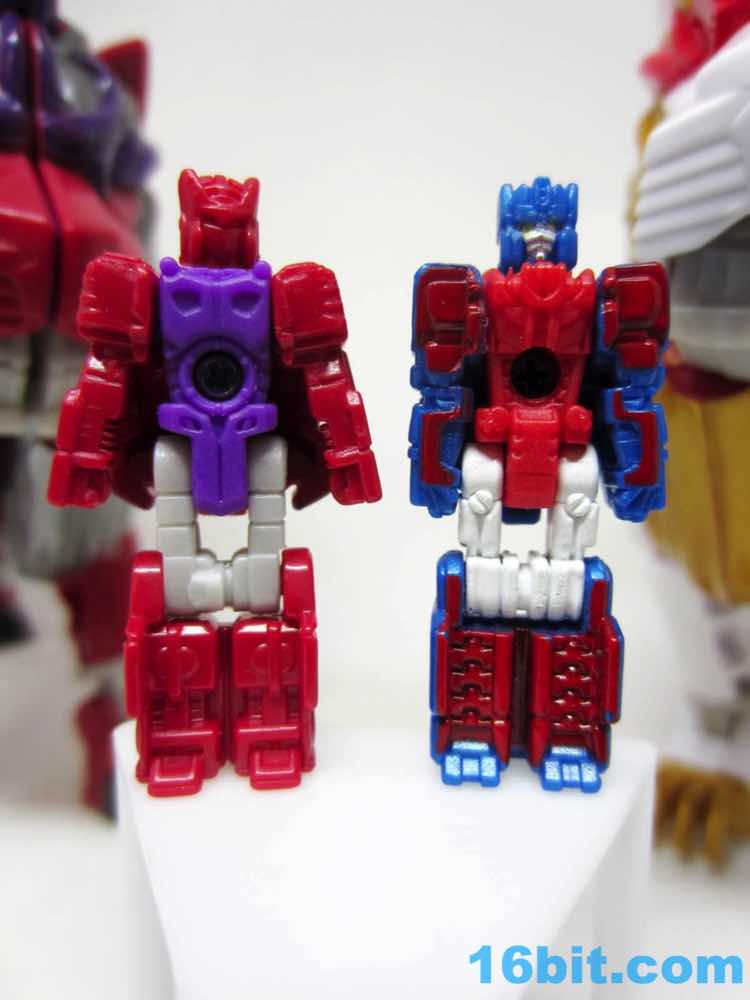 Leo Prime can carry or store these figures on his various modes. There's a place on the backpack to store the claw, plus 5mm ports on the back of his shoulders for the other weapons. Articulation is higher than some toys, with about 21 meaningful points of articulation. Some of these aren't given a huge range of motion, but the unique transformation does give the ankles a tiny bit more motion than we've seen in other Voyager-class toys recently. I love the red plastic color, and I'm crazy about the Maximal symbol on the red spark crystal outlined in gold. It certainly looks a bit more regal, and/or like Optimus Prime got Buzz Lightyear's armor and gave it a makeover. It's a little bulky and arguably a lot sillier than other toys released recently, but it certainly adds a sense of variety to that Optimus/Convoy shelf you've been filling out these past 33 years.
